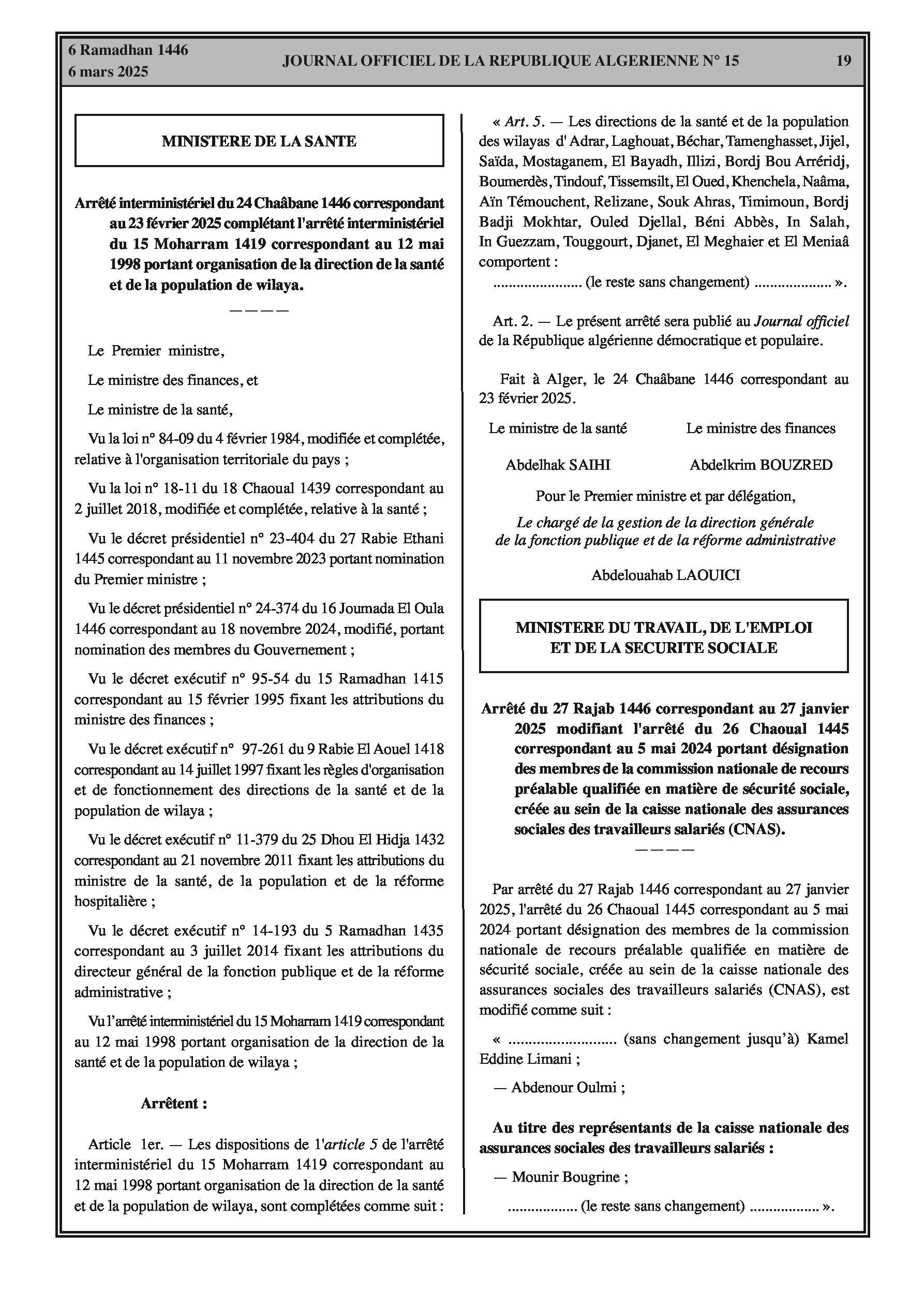 Arrêté interministériel complétant l'arrêté portant organisation de la direction de la santé et de la population de wilaya, pour inclure de nouvelles wilayas.