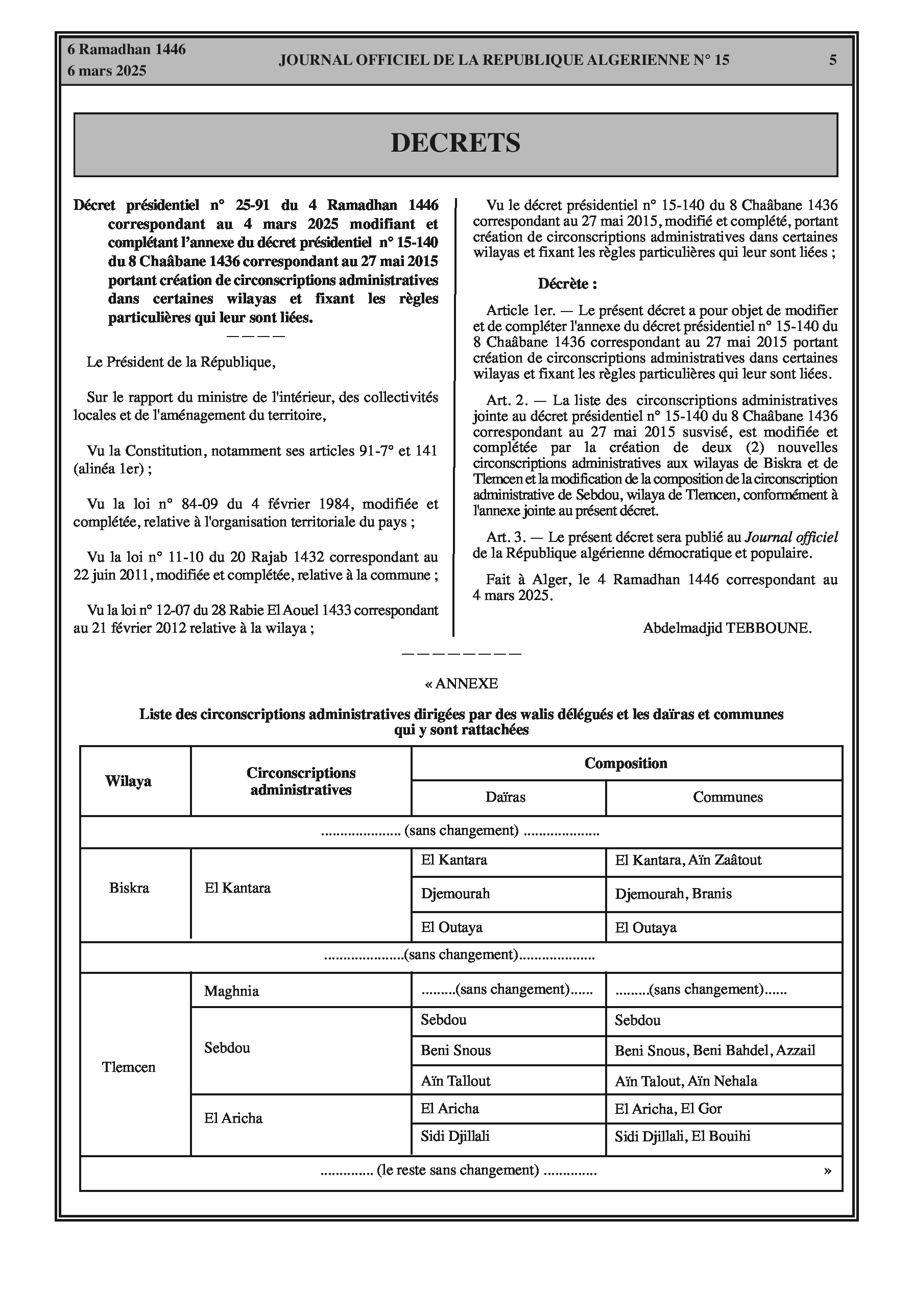 Décret présidentiel modifiant et complétant l'annexe du décret présidentiel créant des circonscriptions administratives dans certaines wilayas et fixant leurs règles particulières, avec la création de deux nouvelles circonscriptions à Biskra et Tlemcen et la modification de la composition de la circonscription de Sebdou (Tlemcen).