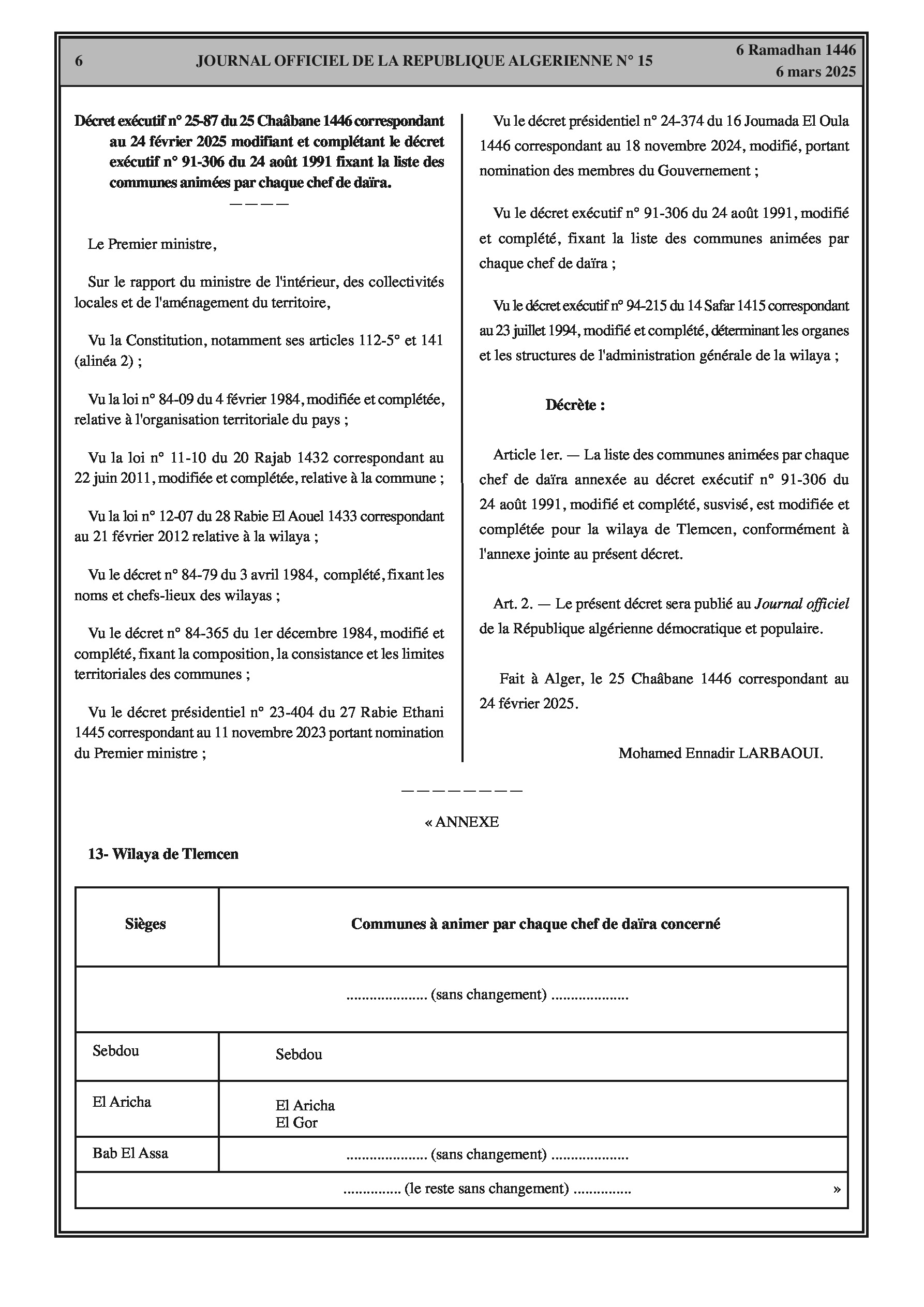 Décret exécutif modifiant et complétant la liste des communes animées par chaque chef de daïra, notamment pour la wilaya de Tlemcen.