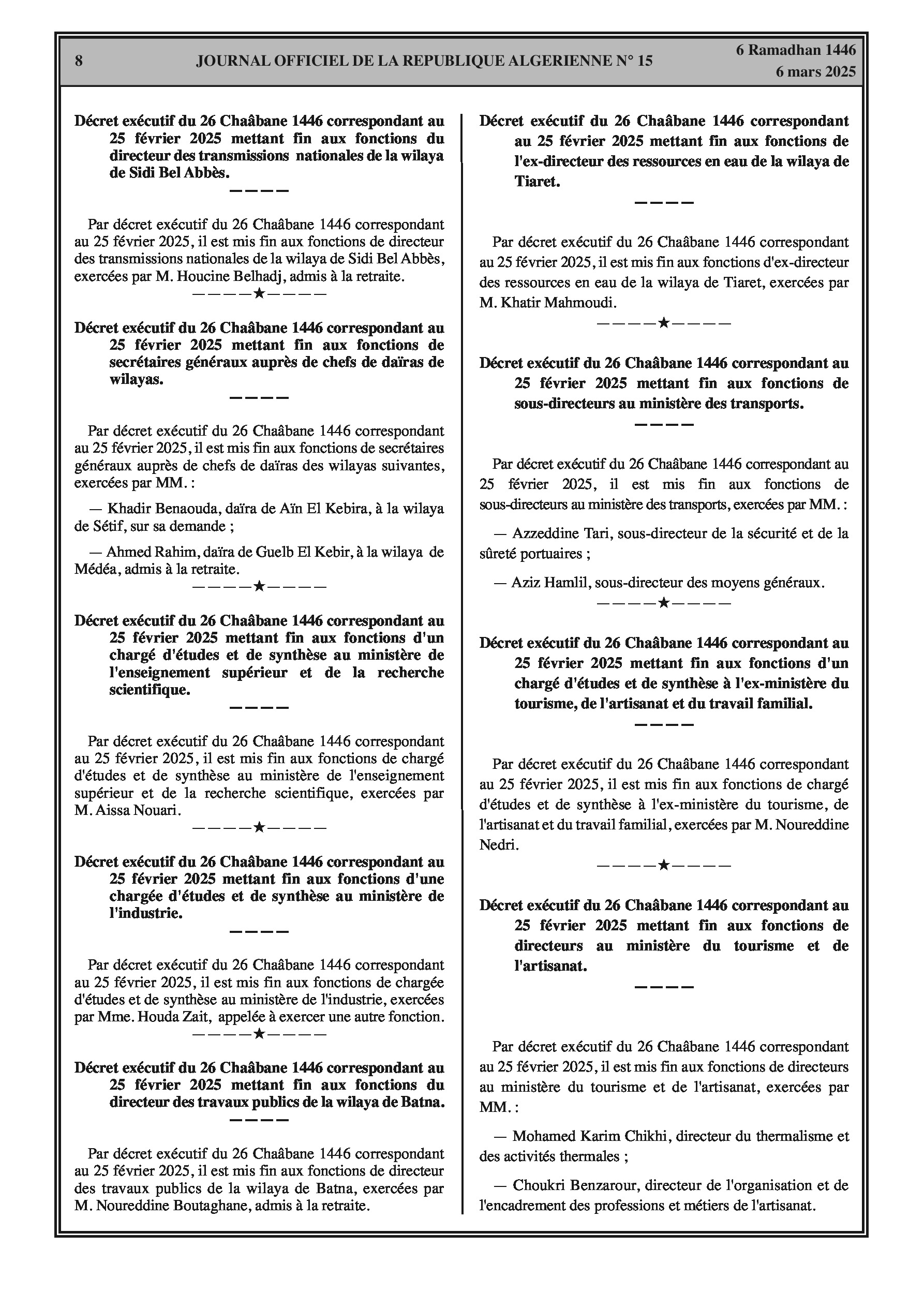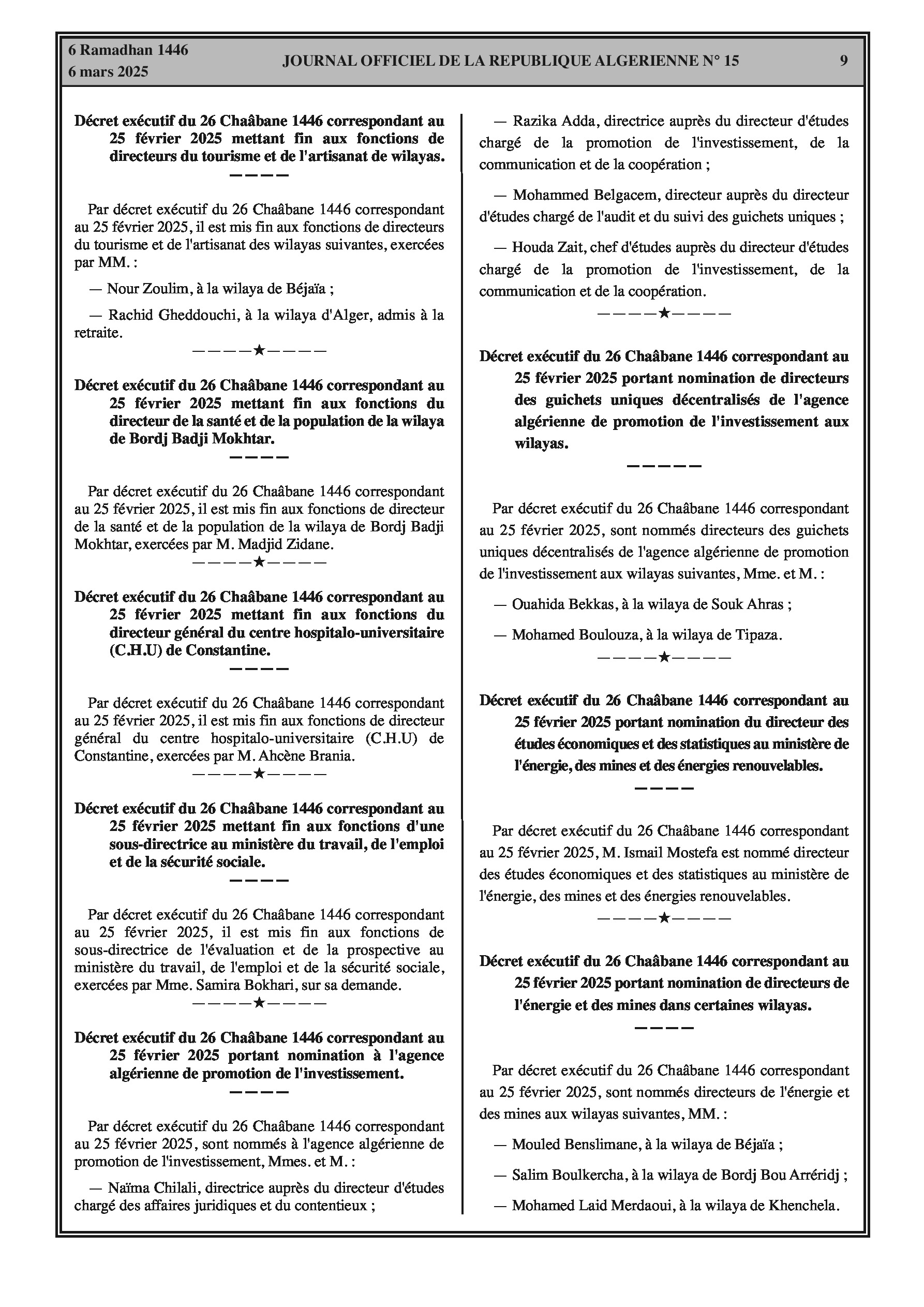 Modifications aux postes de directeurs de l'énergie, de la protection civile, des transports, du tourisme, de la santé, et de directeurs de CHU dans plusieurs wilayas.
