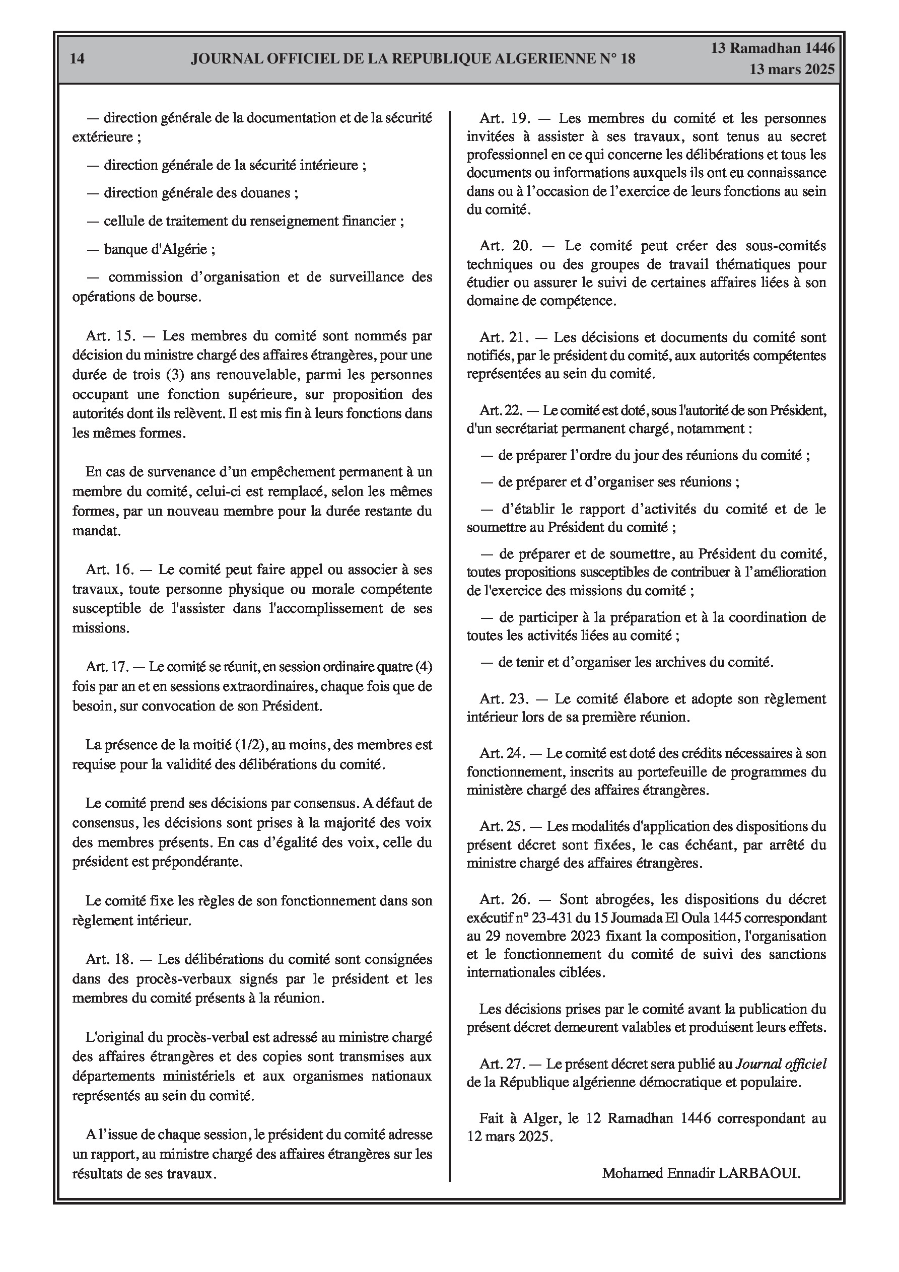 - Le comité est présidé par un représentant du ministre des Affaires étrangères et comprend des représentants de divers secteurs (Défense, Intérieur, Justice, Finances, et organismes de sécurité). - Les missions incluent la coordination avec les organes de l'ONU, la soumission des demandes d'inscription/radiation, la préparation des rapports nationaux, et la proposition d'amendements législatifs. - Abroge le décret exécutif n° 23-431.