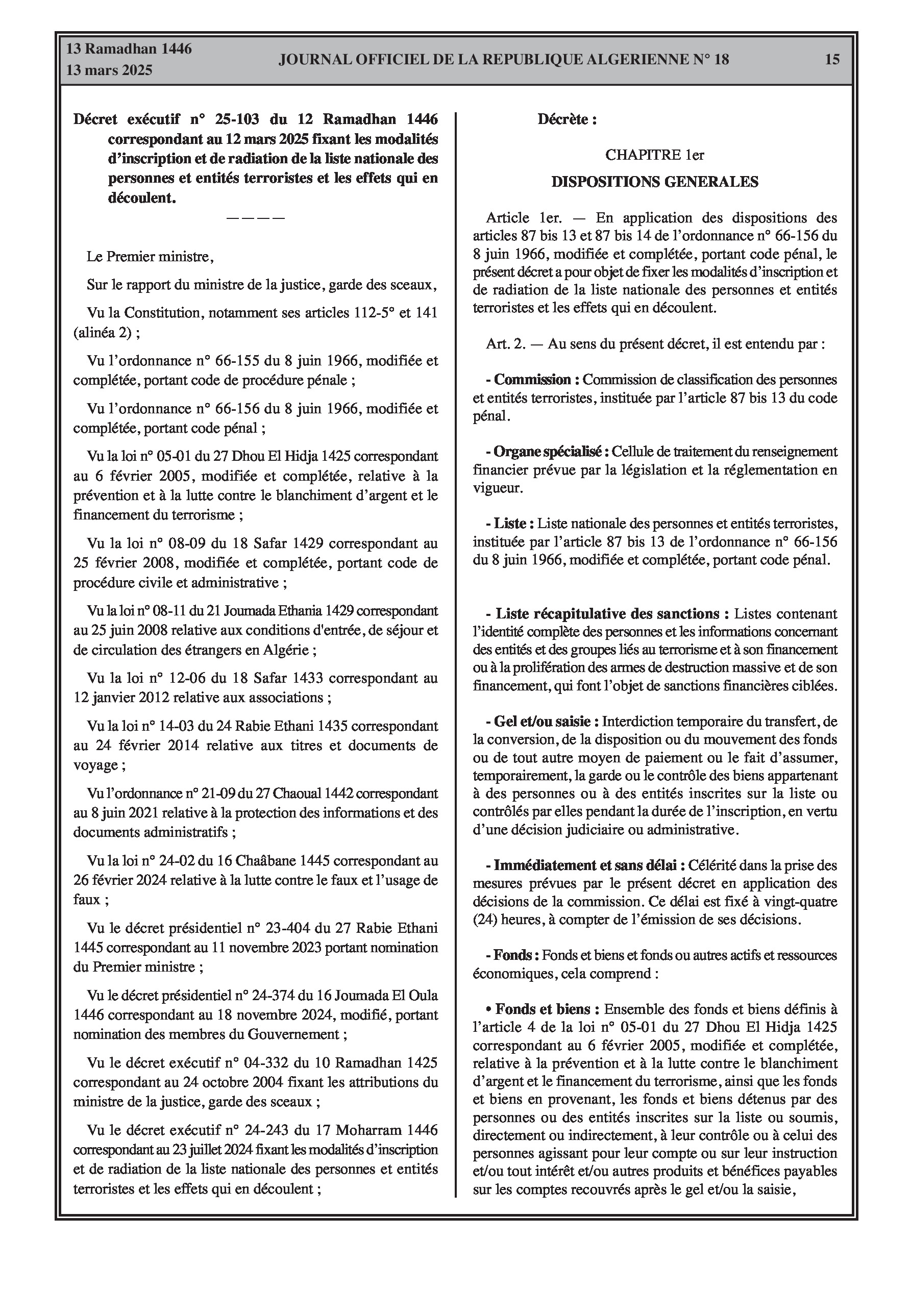 - Instauration d'une commission de classification des personnes et entités terroristes, présidée par le ministre de l'Intérieur. - Définition des critères de classification basés sur les résolutions du Conseil de sécurité et les dispositions légales. - Réglementation des procédures de demande d'inscription, de radiation, de révision de la liste, et de sa publication. - Détail des effets de l'inscription : interdiction d'activité, gel des fonds, interdiction de voyager. - Abroge le décret exécutif n° 24-243.