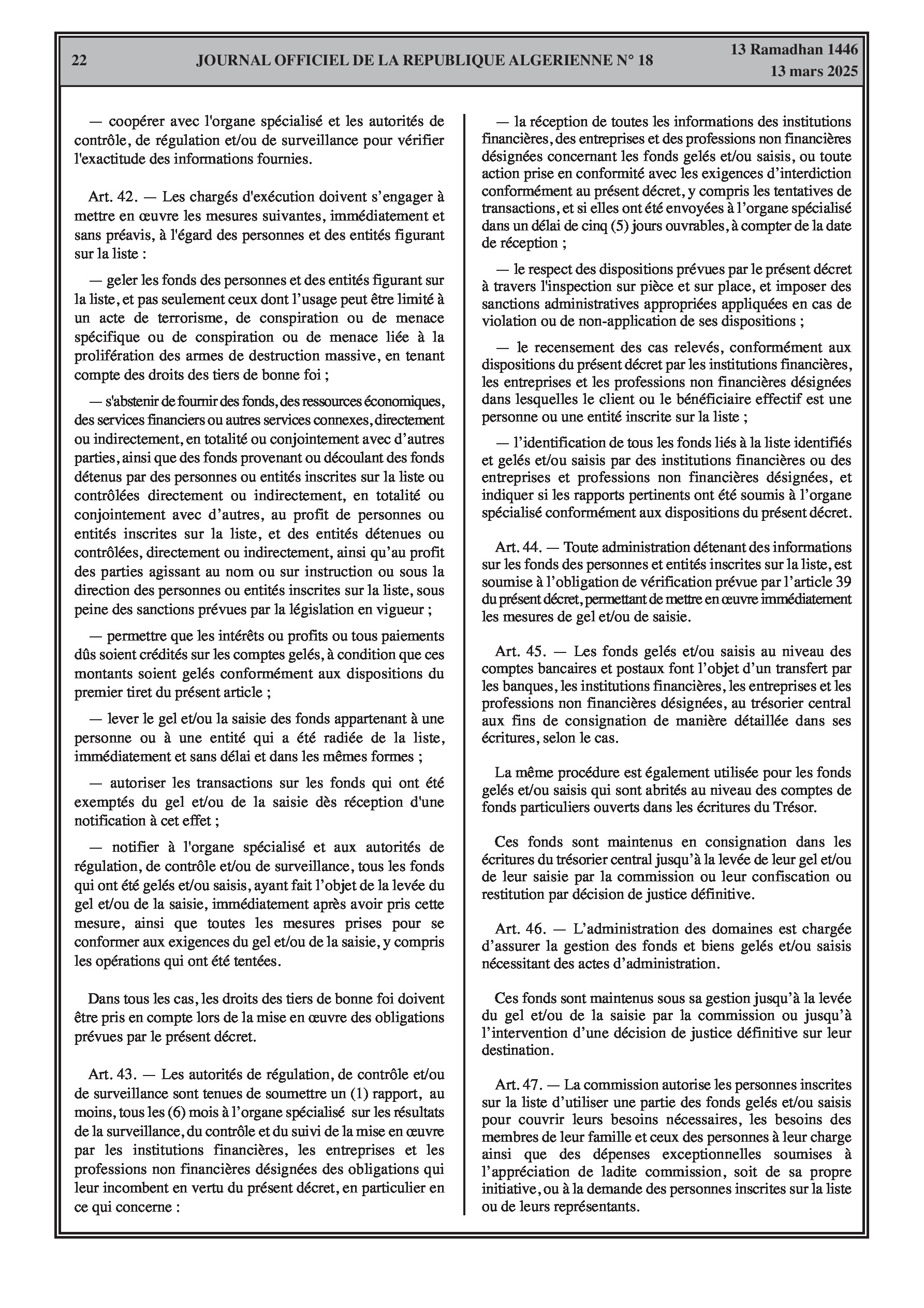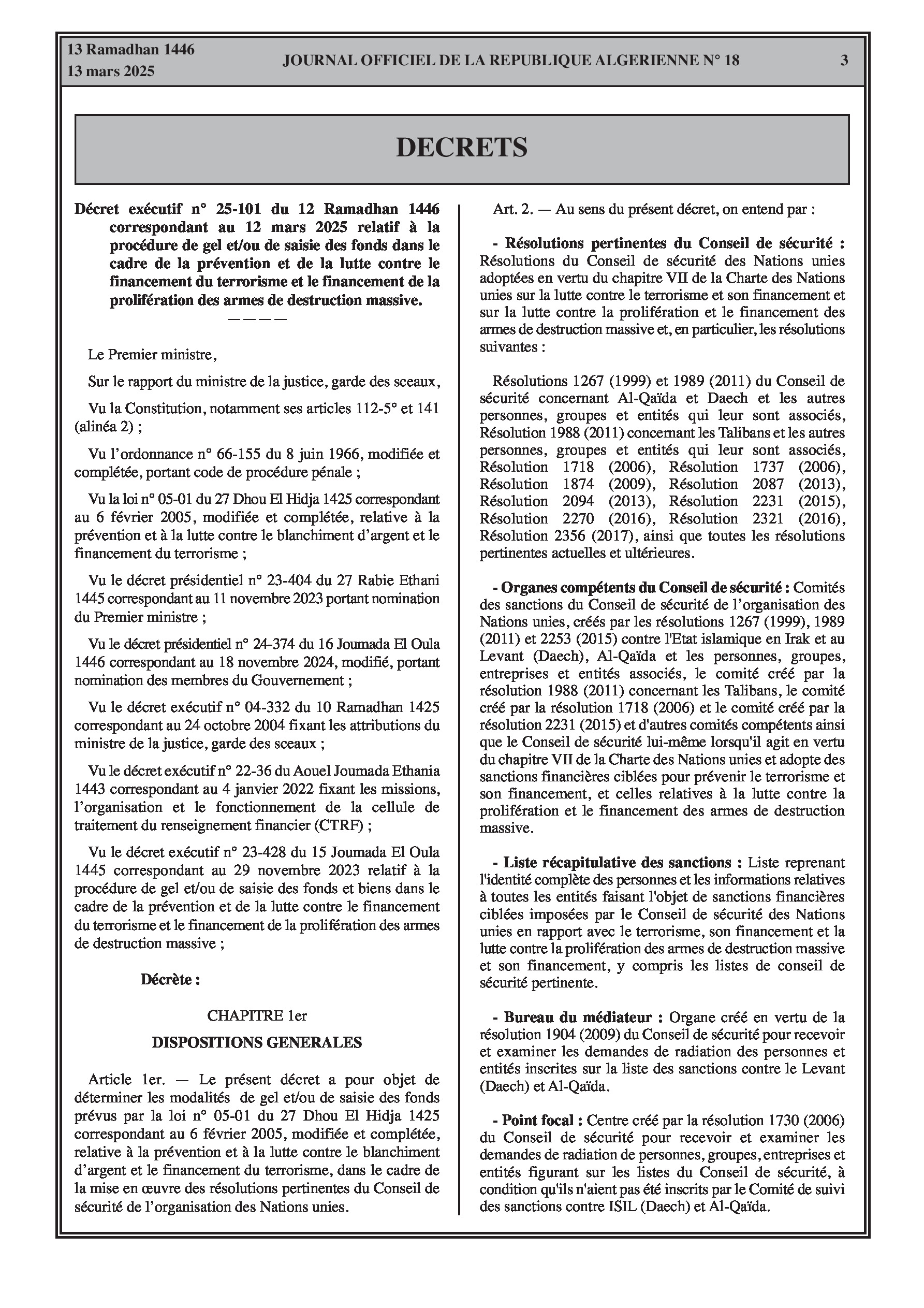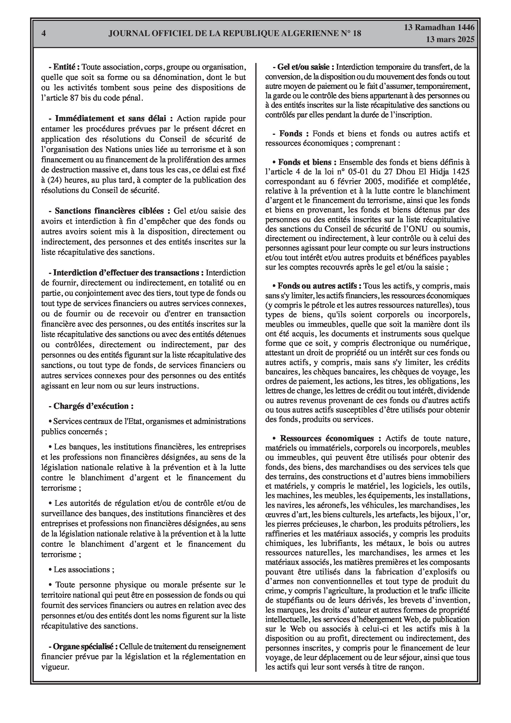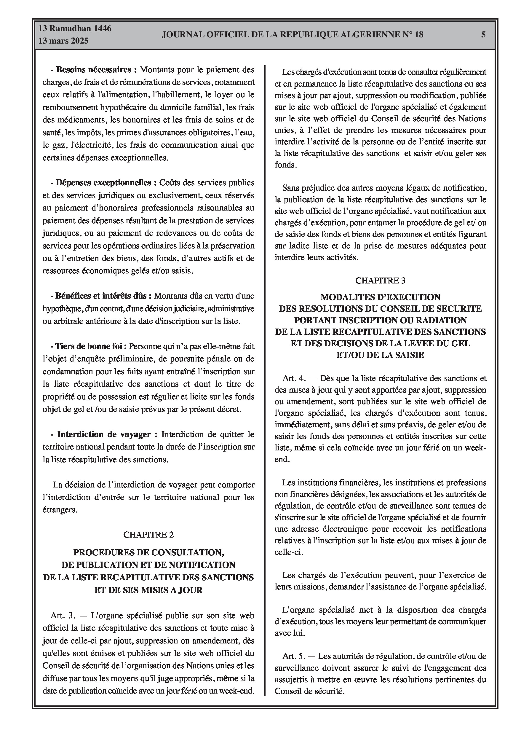 - Définit les procédures de gel ou de saisie des avoirs des personnes et entités inscrites sur les listes de sanctions de l'ONU. - Détaille les mécanismes d'application immédiate, les droits des tiers de bonne foi, et les exemptions pour besoins essentiels et dépenses exceptionnelles. - Réglemente les interdictions de voyager et les transactions financières avec les personnes/entités listées. - Abroge le décret exécutif n° 23-428.