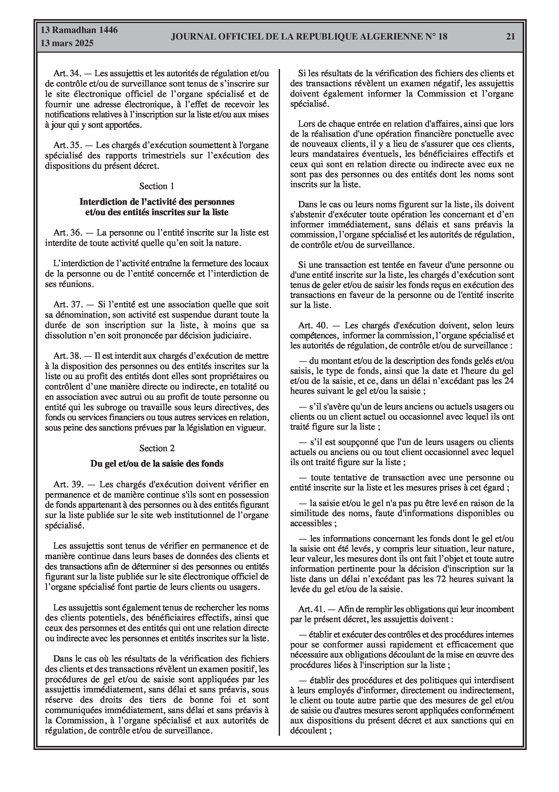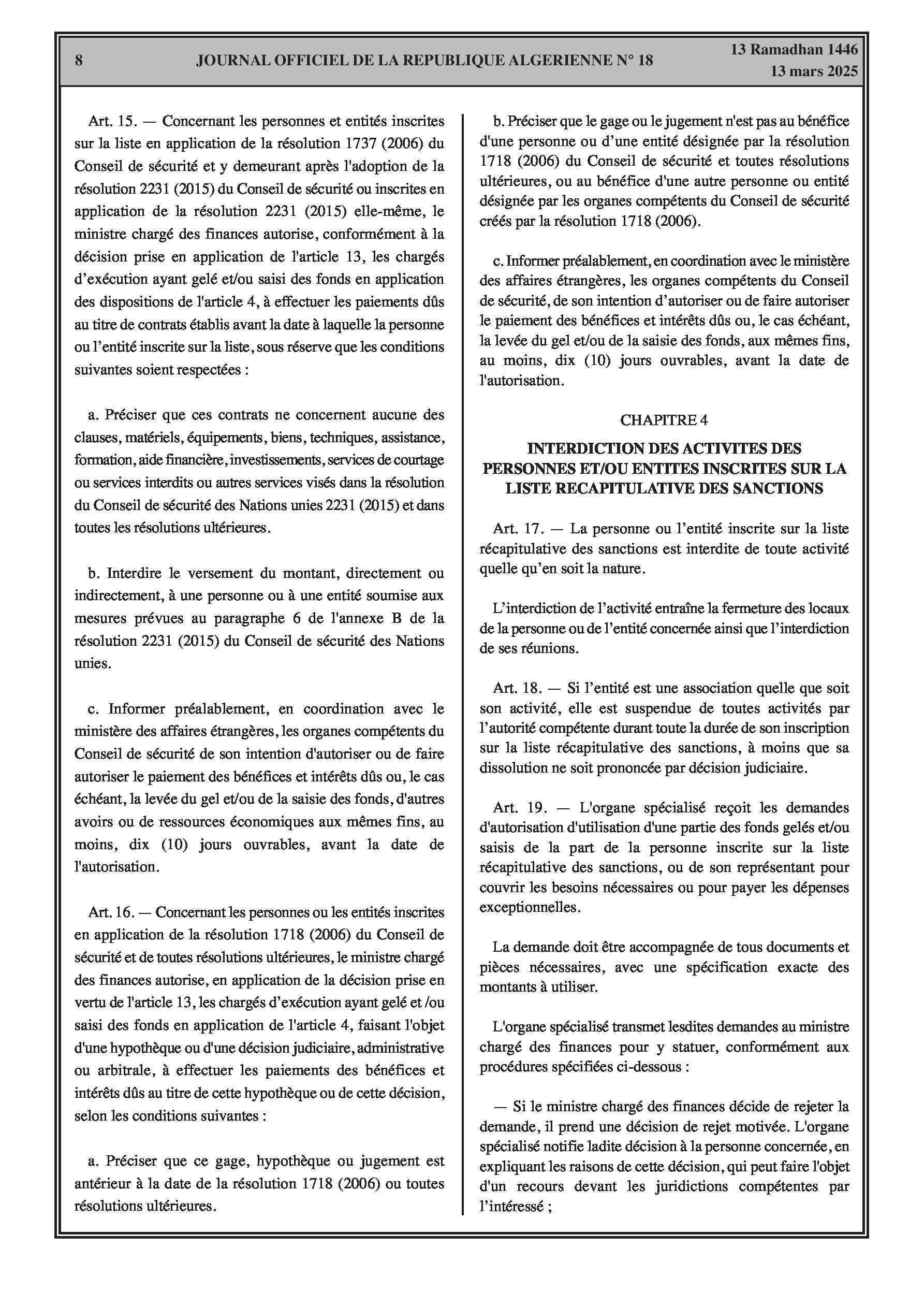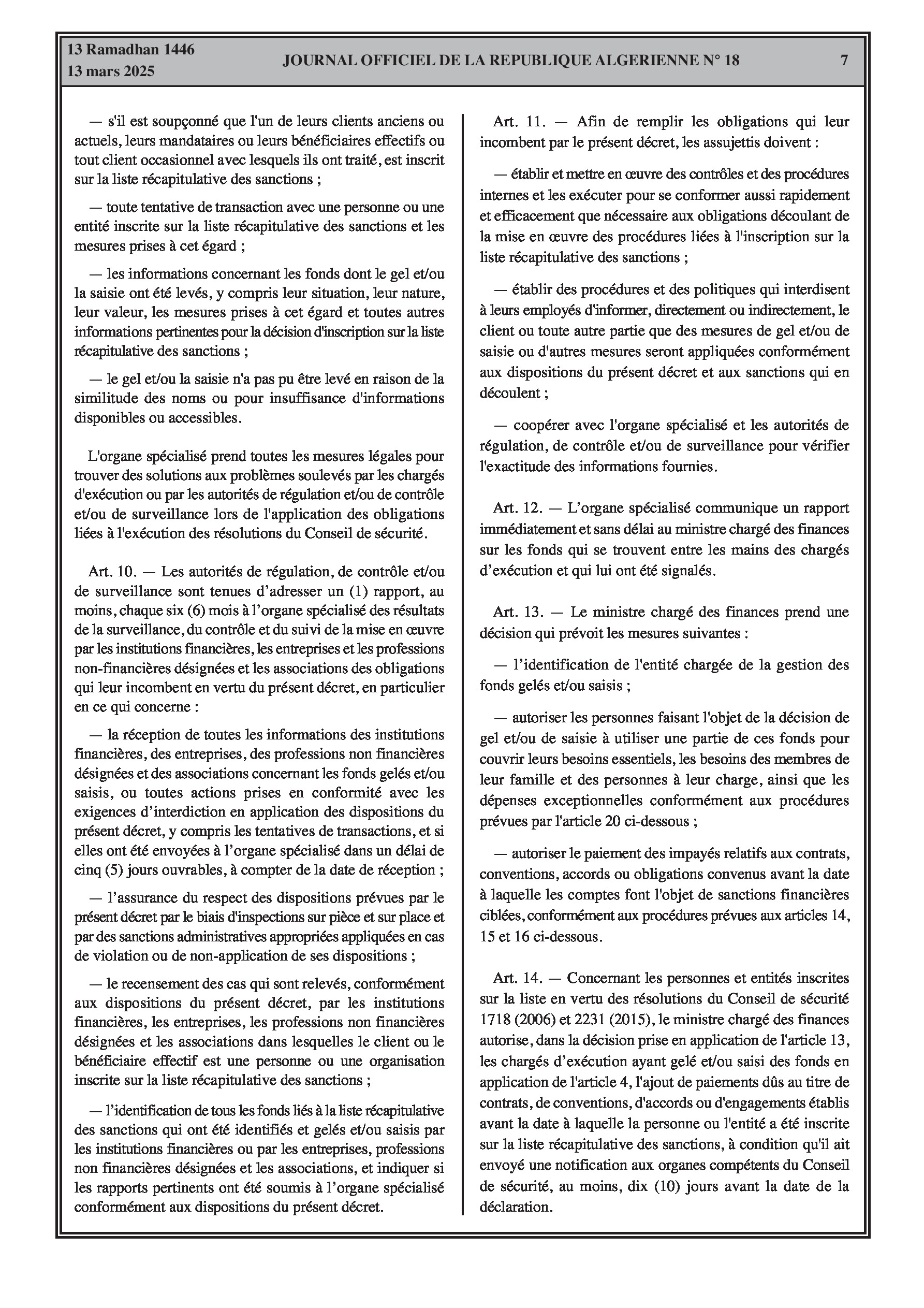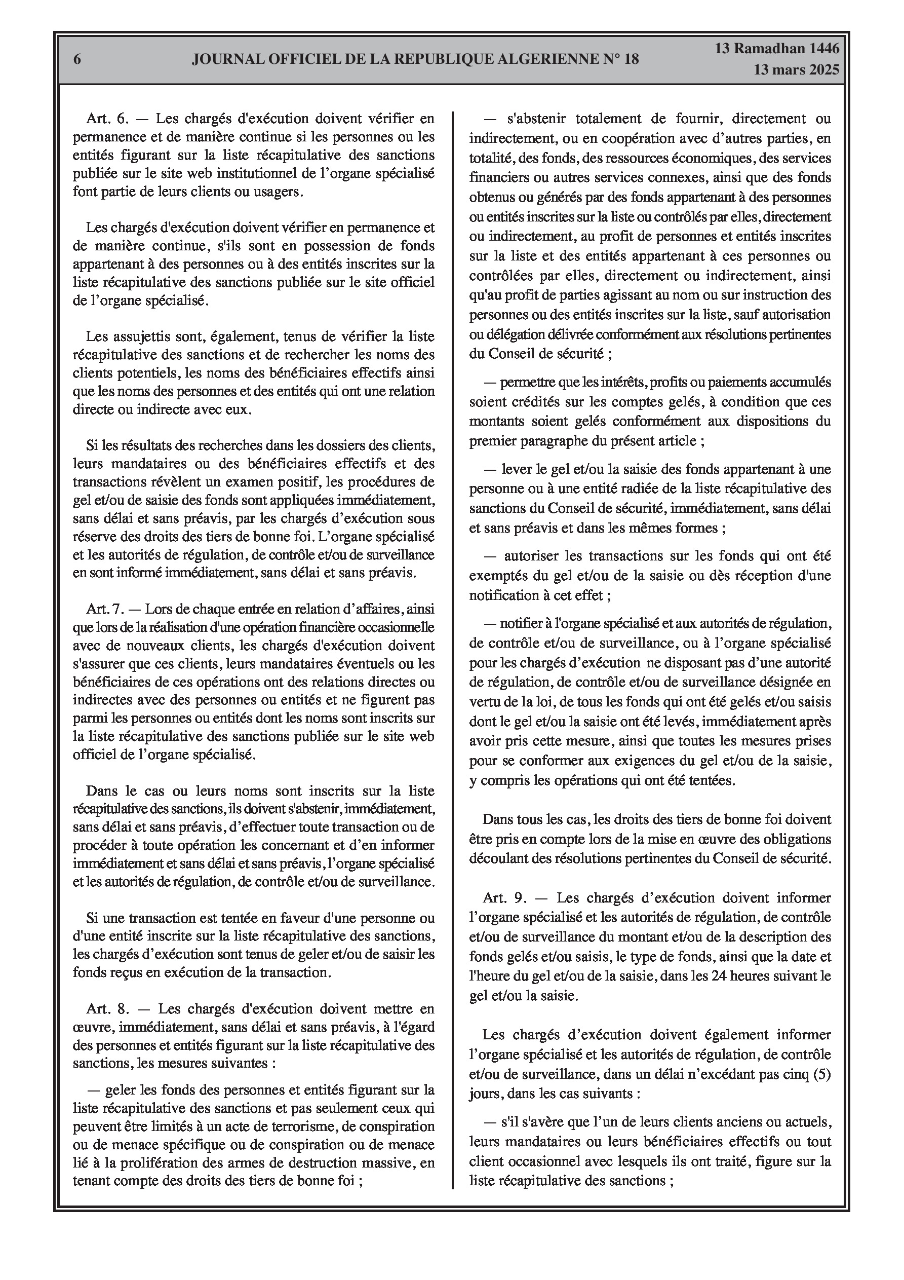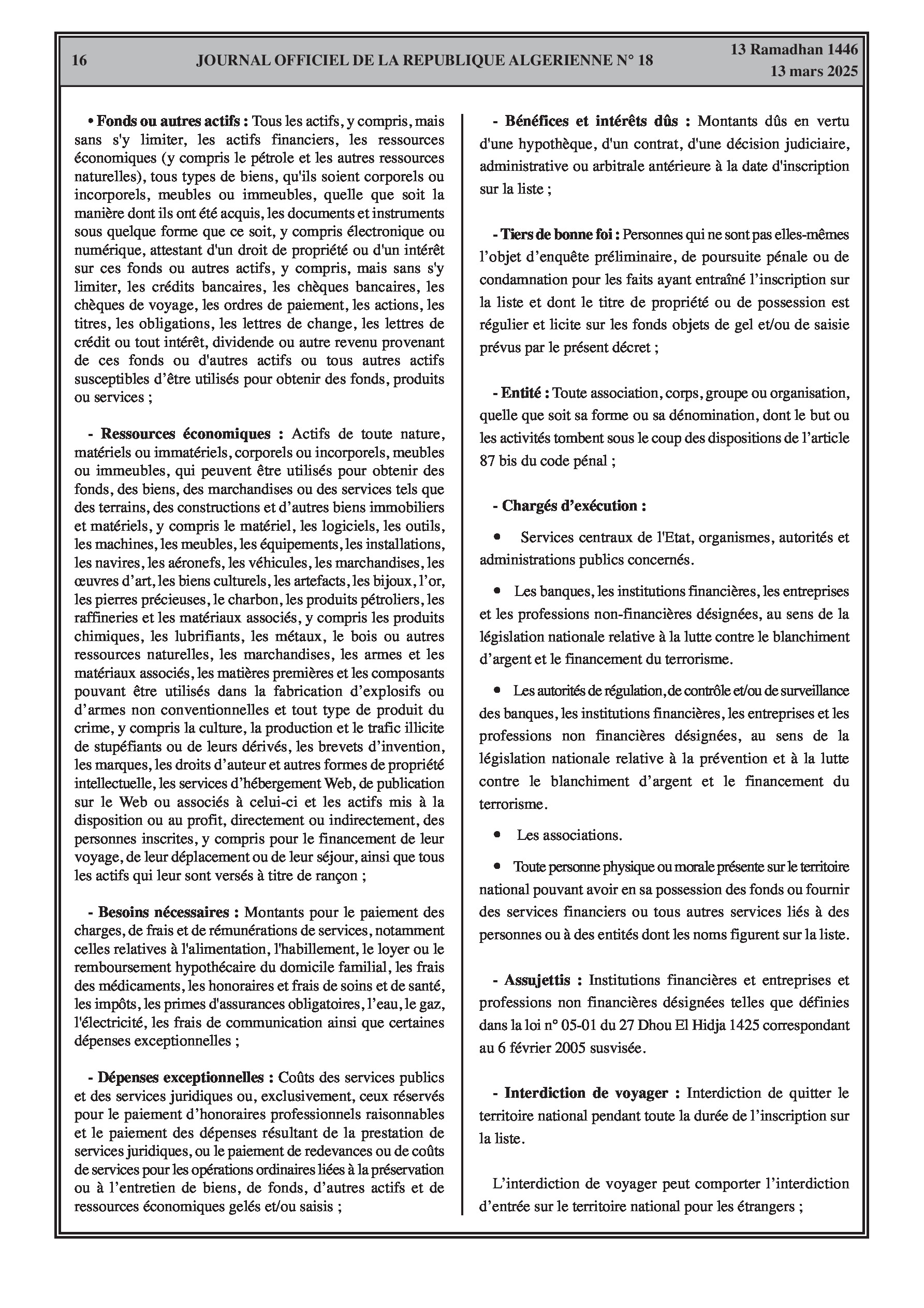 - Définit les procédures de gel ou de saisie des avoirs des personnes et entités inscrites sur les listes de sanctions de l'ONU. - Détaille les mécanismes d'application immédiate, les droits des tiers de bonne foi, et les exemptions pour besoins essentiels et dépenses exceptionnelles. - Réglemente les interdictions de voyager et les transactions financières avec les personnes/entités listées. - Abroge le décret exécutif n° 23-428.