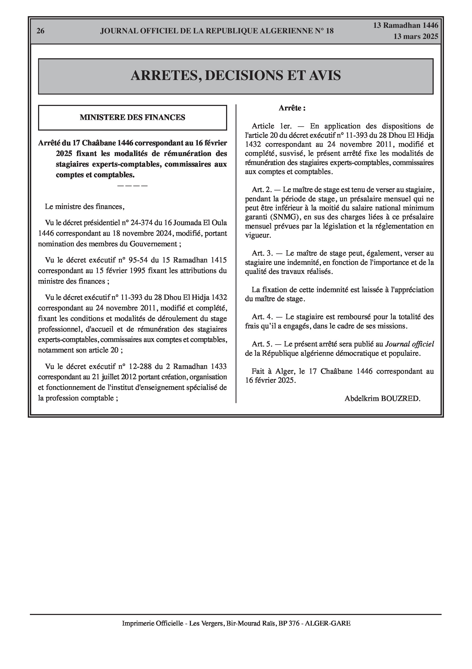 Arrêté du ministre des Finances fixant les modalités de rémunération des stagiaires experts-comptables, commissaires aux comptes et comptables pendant leur période de stage.