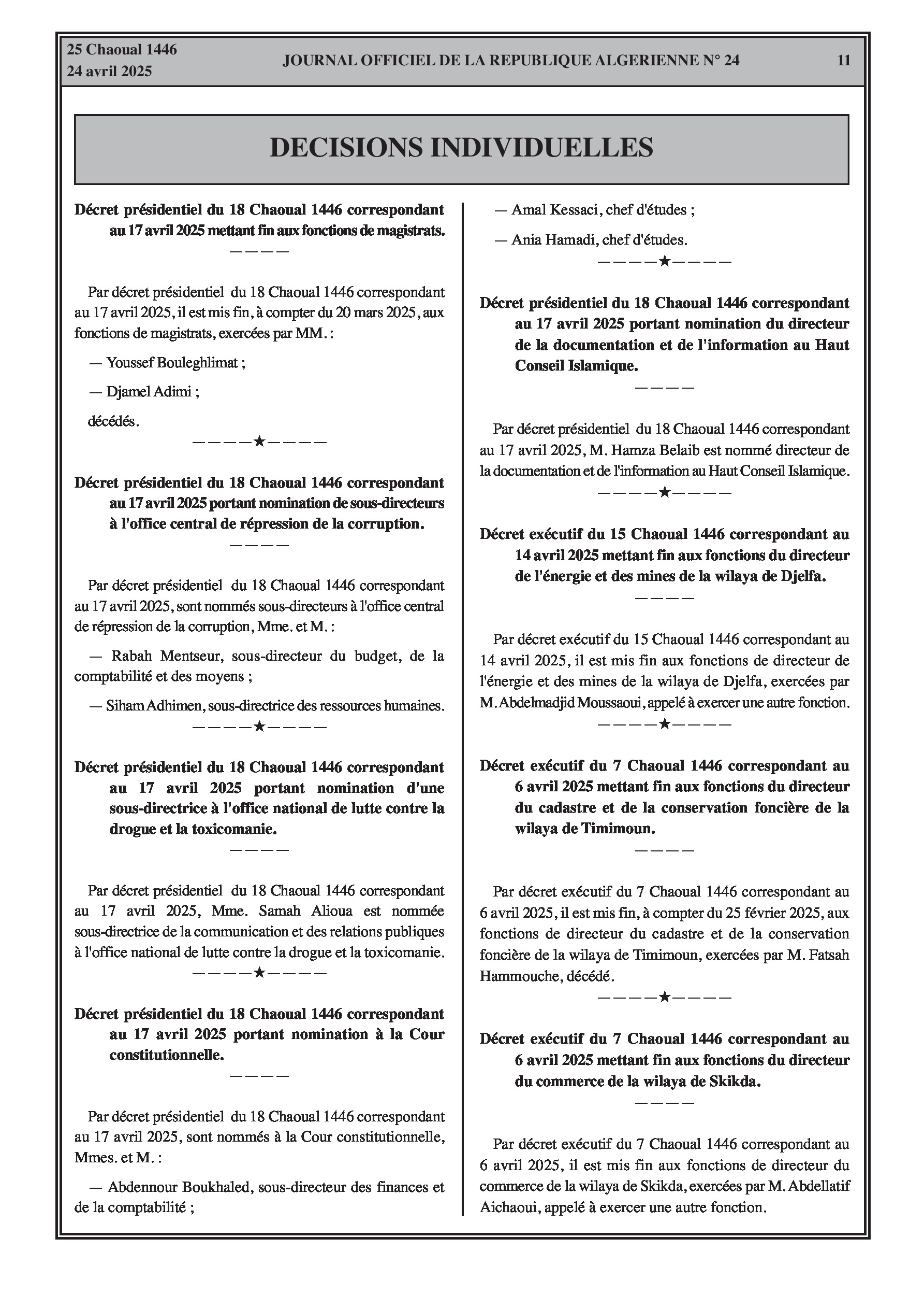 Décrets présidentiels mettant fin aux fonctions de magistrats (certains décédés), nommant des sous-directeurs à l'Office central de répression de la corruption et à l'Office national de lutte contre la drogue et la toxicomanie, et des nominations à la Cour constitutionnelle (directeurs d'études) et au Haut Conseil Islamique (directeur de la documentation et de l'information).