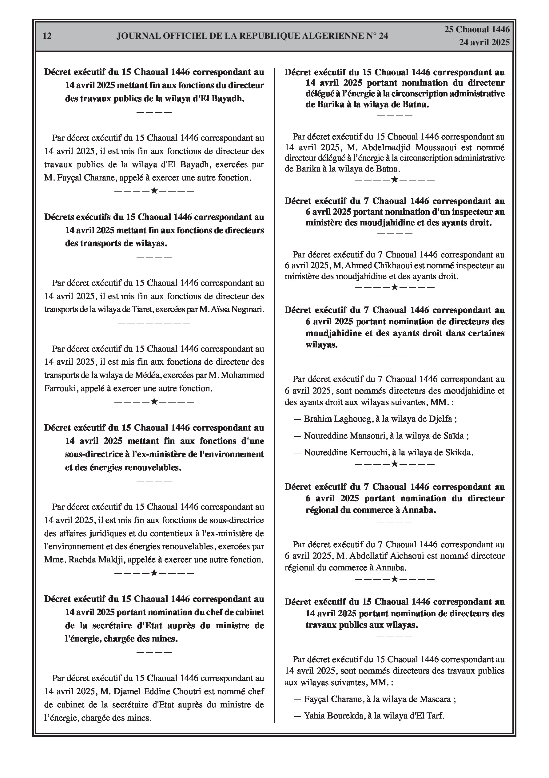 Multiples décrets exécutifs couvrant des fins de fonctions et des nominations de directeurs dans les secteurs de l'énergie et des mines, du cadastre, du commerce, des travaux publics, des transports, de l'environnement, ainsi que des nominations aux ministères des Moudjahidine, de la Santé, et de l'Économie de la connaissance, des Start-up et des Micro-entreprises.