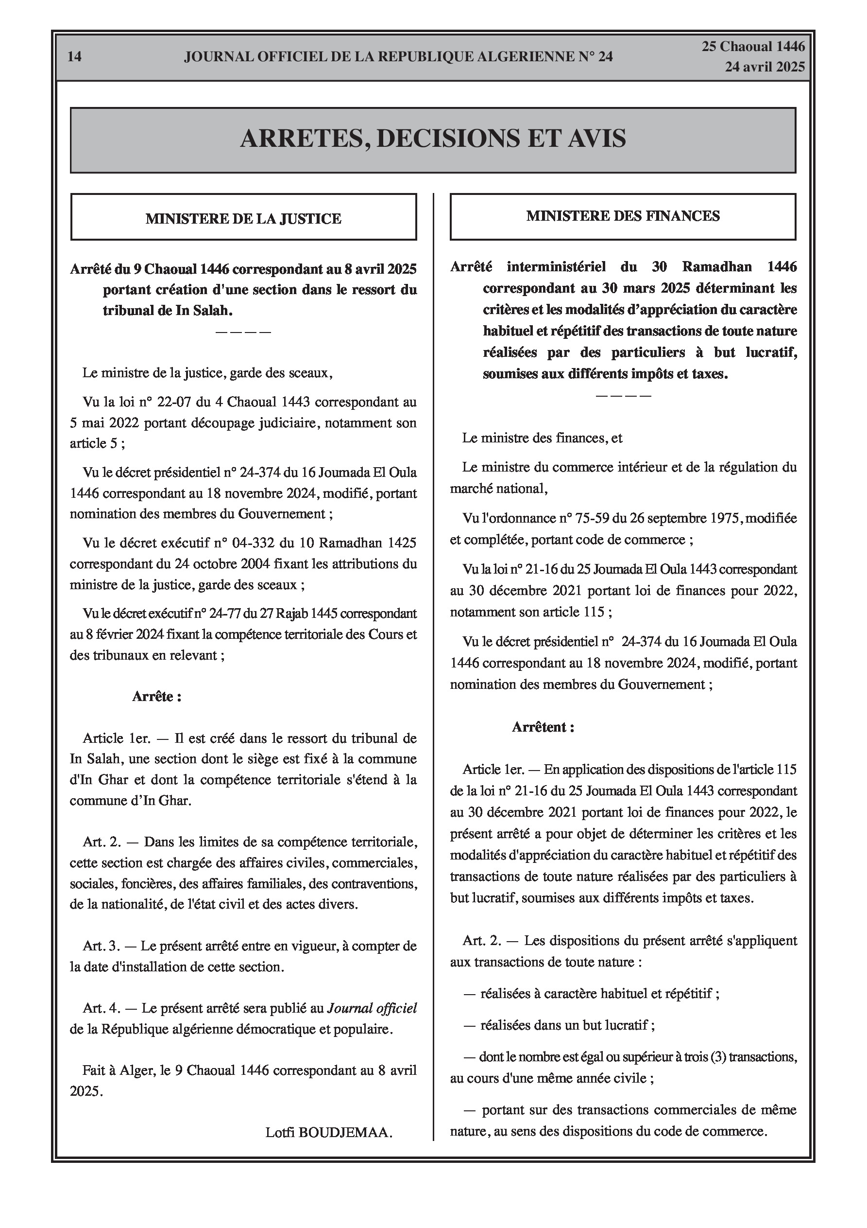 Arrêté interministériel déterminant les critères et modalités d'appréciation du caractère habituel et répétitif des transactions de toute nature réalisées par des particuliers à but lucratif, soumises aux différents impôts et taxes.
