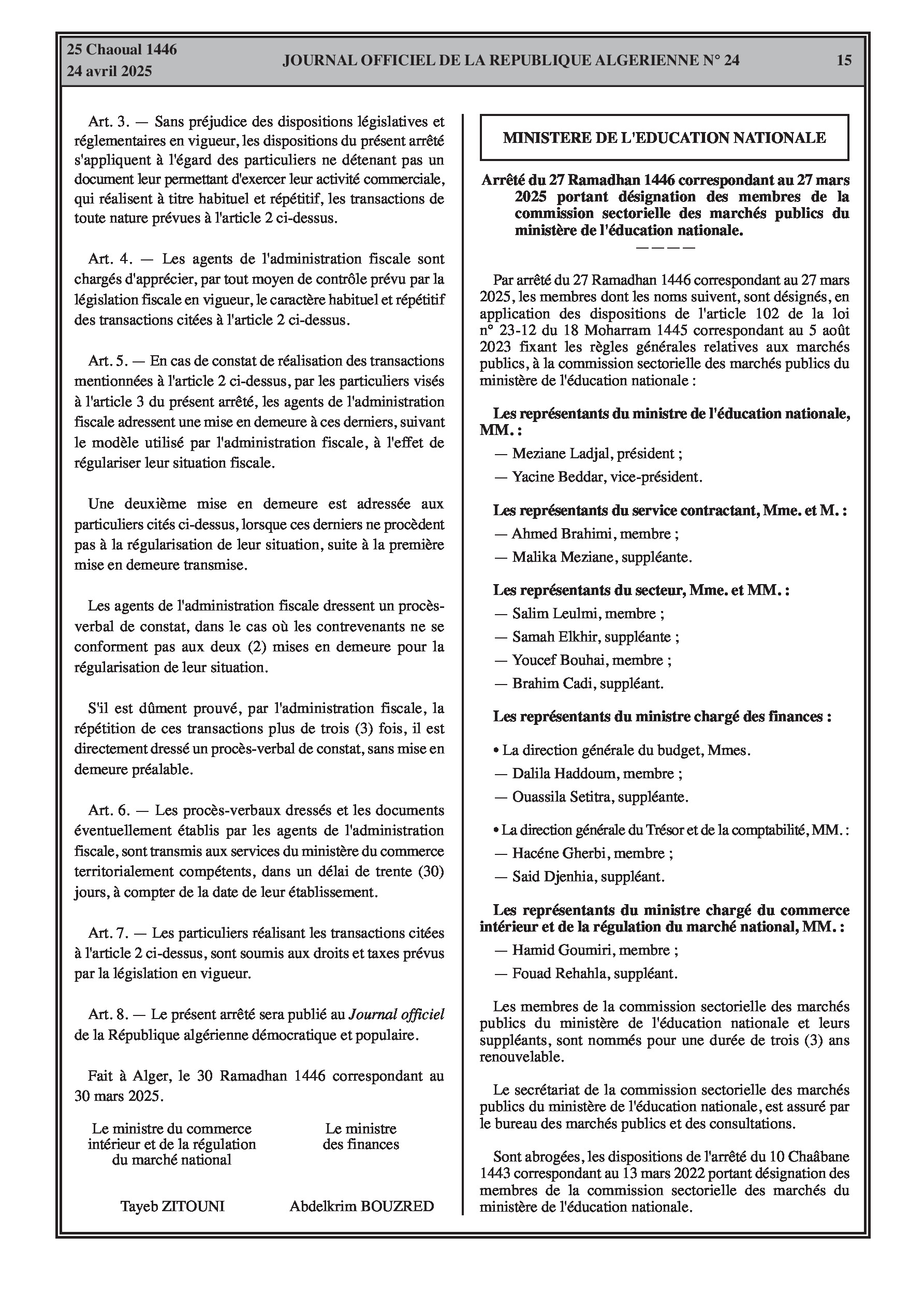 Arrêté du ministre de l'éducation nationale portant désignation des membres de la commission sectorielle des marchés publics du ministère.