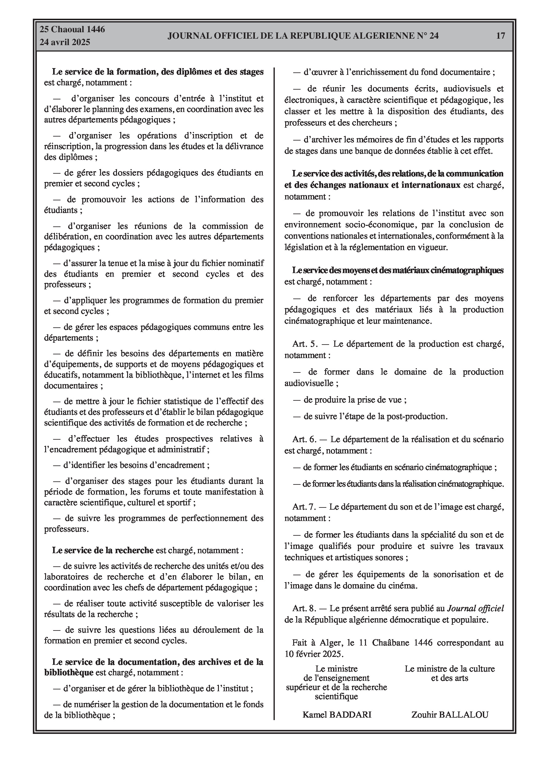 Définit l'organisation pédagogique de l'institut national supérieur du cinéma, y compris les tâches de la sous-direction des affaires pédagogiques et ses cinq départements (formation, production, réalisation et scénario, son et image).