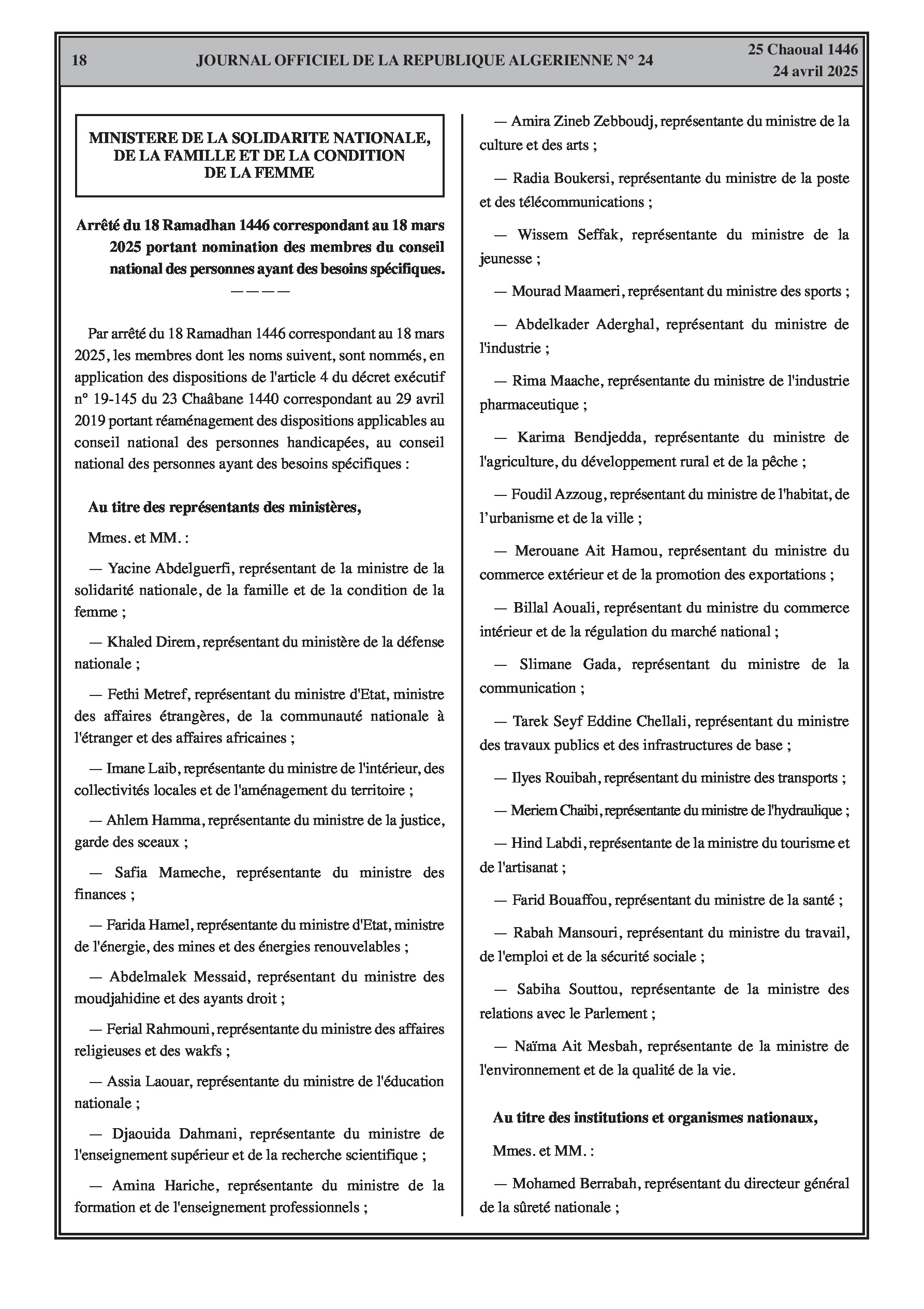 Arrêté de la ministre de la solidarité nationale, de la famille et de la condition de la femme portant nomination des membres du conseil national des personnes ayant des besoins spécifiques.