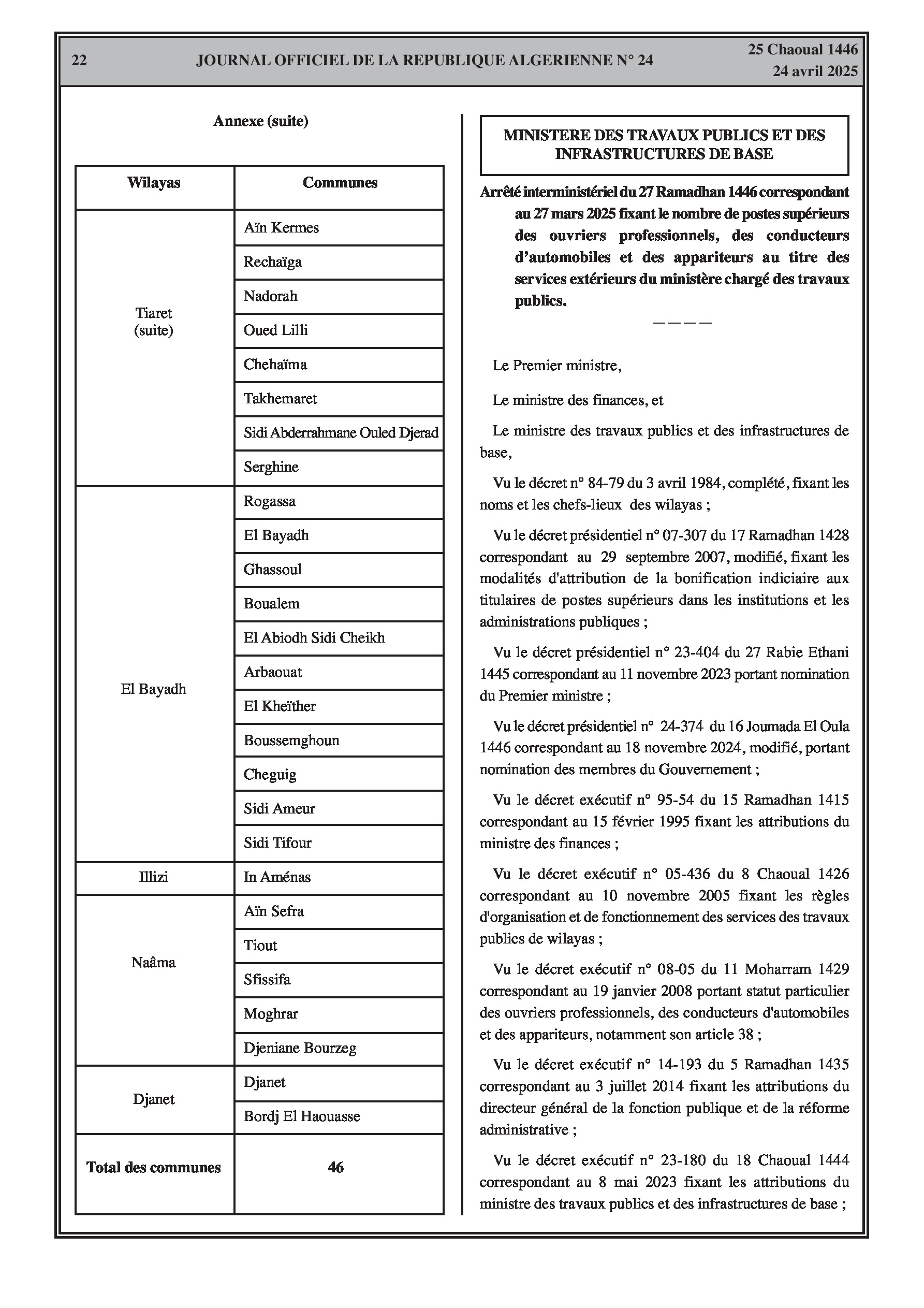 Déclare 46 communes des wilayas de Laghouat, Béchar et Tiaret comme zones sinistrées suite aux inondations survenues en septembre 2024, sur la base des rapports des comités techniques de wilaya des calamités agricoles.