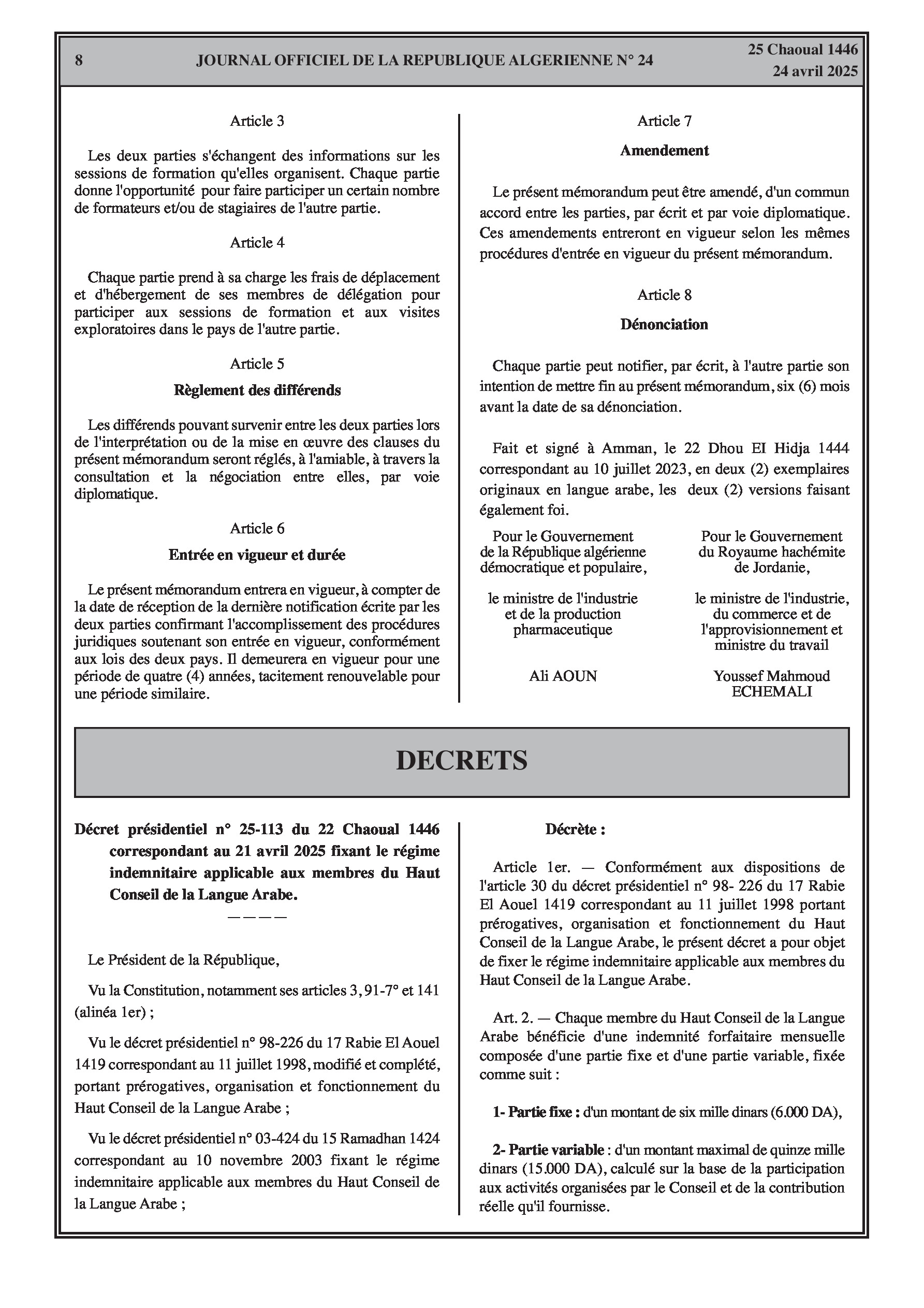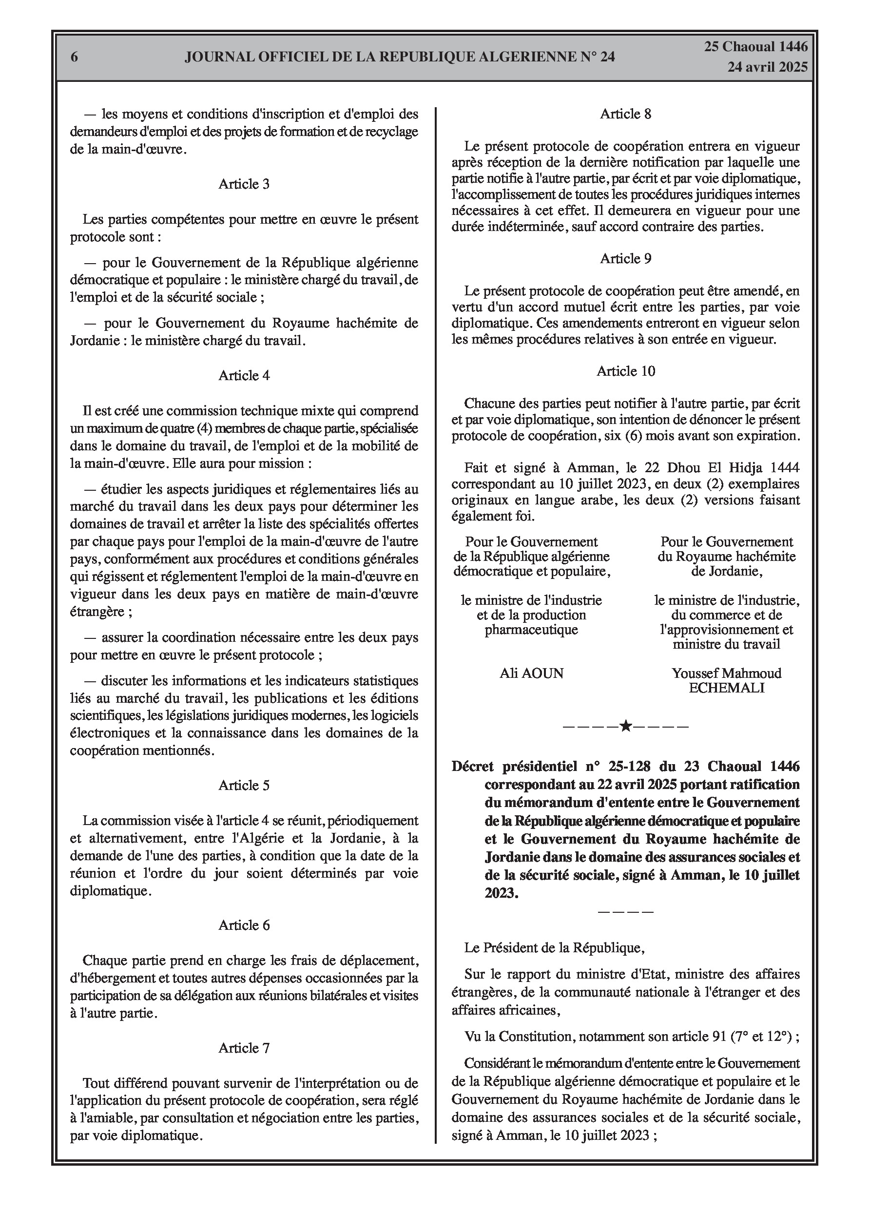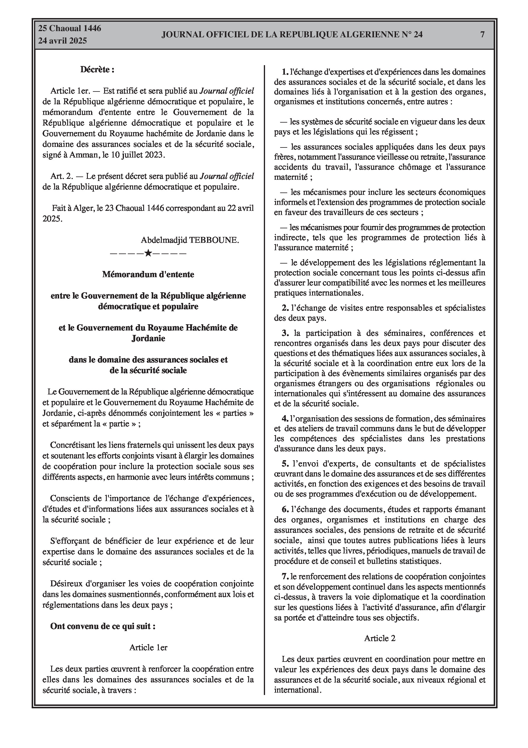 Ratifie le mémorandum d'entente signé avec la Jordanie le 10 juillet 2023, pour renforcer la coopération dans les domaines des assurances sociales et l'échange d'expertises.