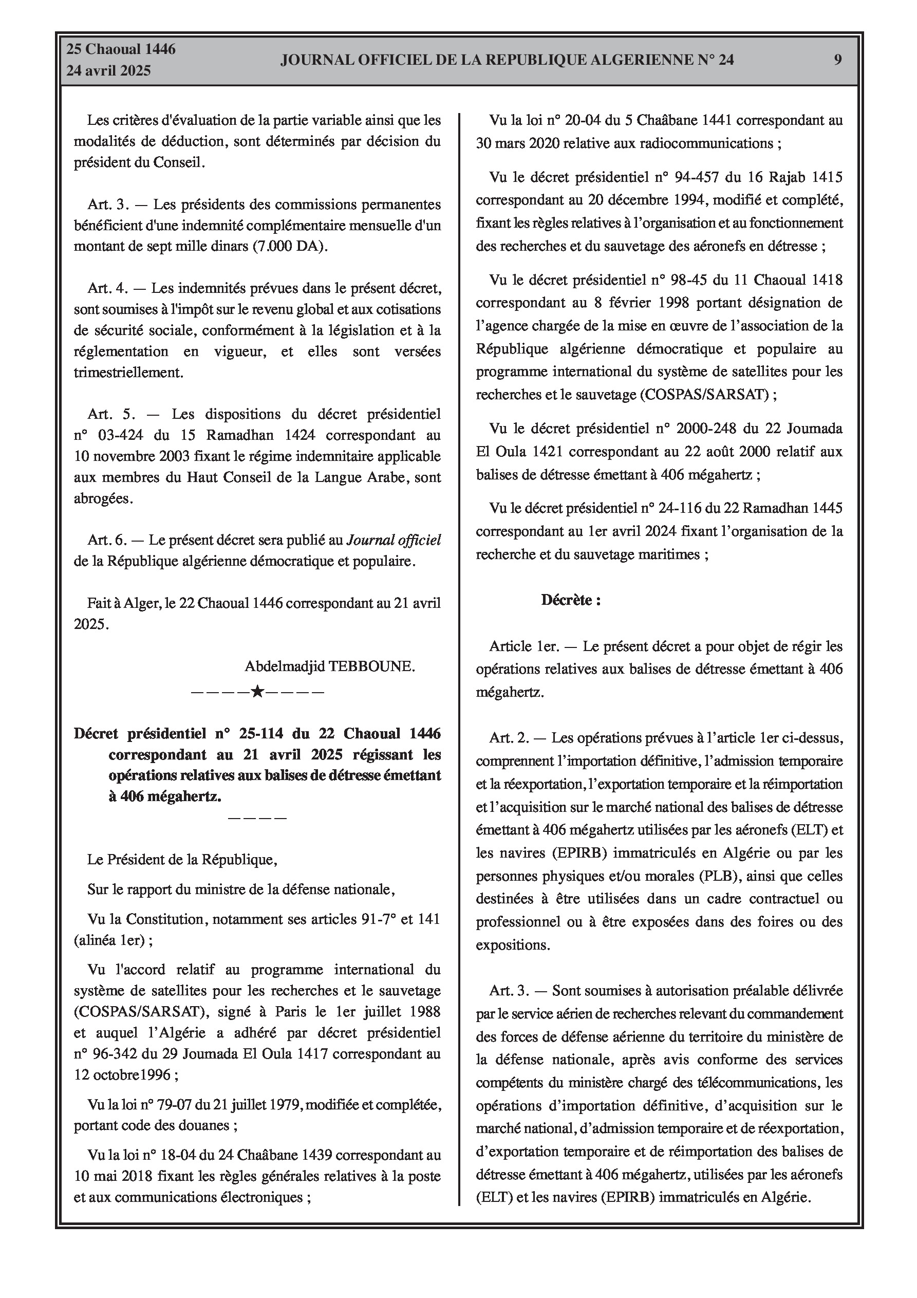 Décret présidentiel régissant les opérations relatives aux balises de détresse émettant à 406 mégahertz.