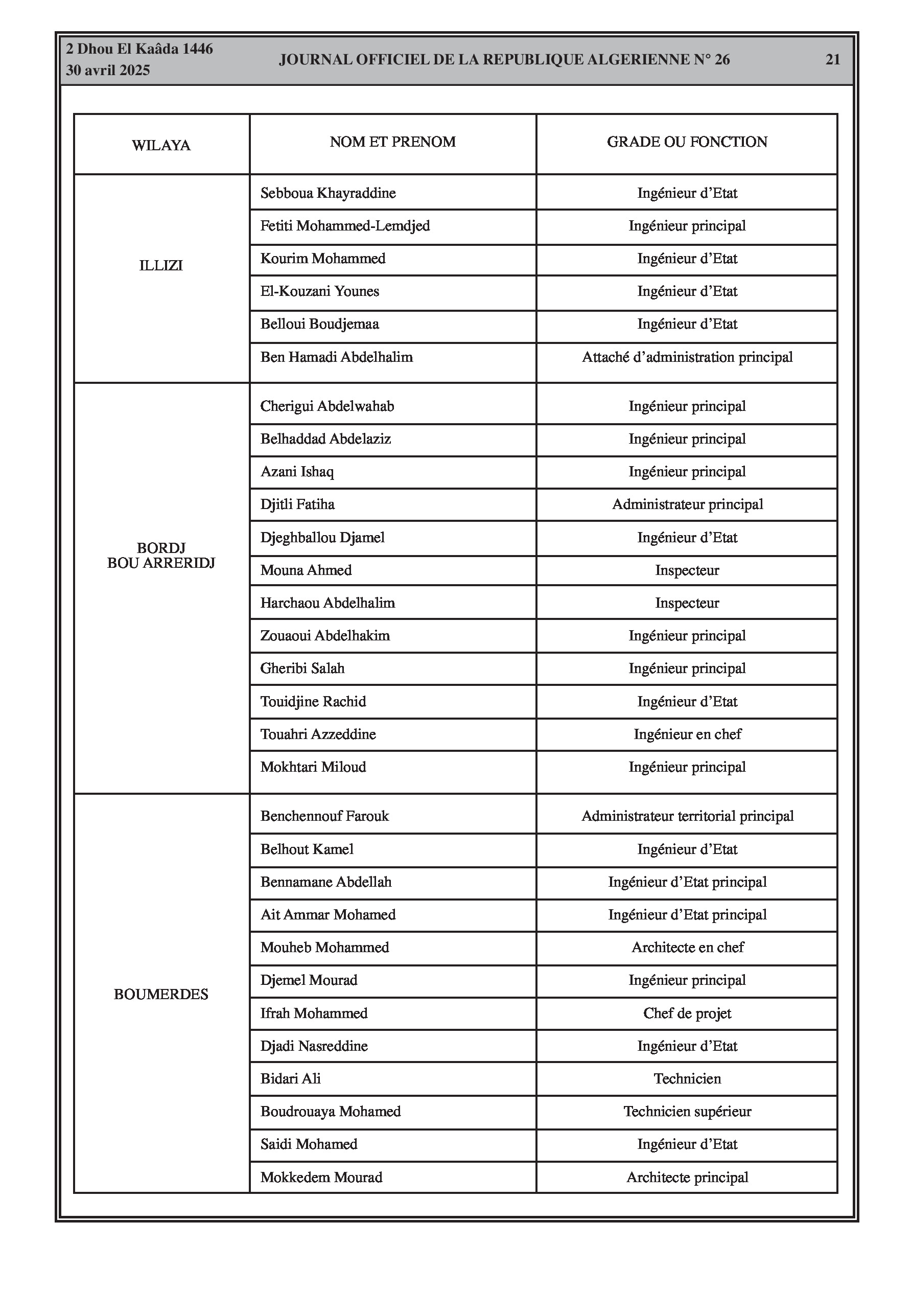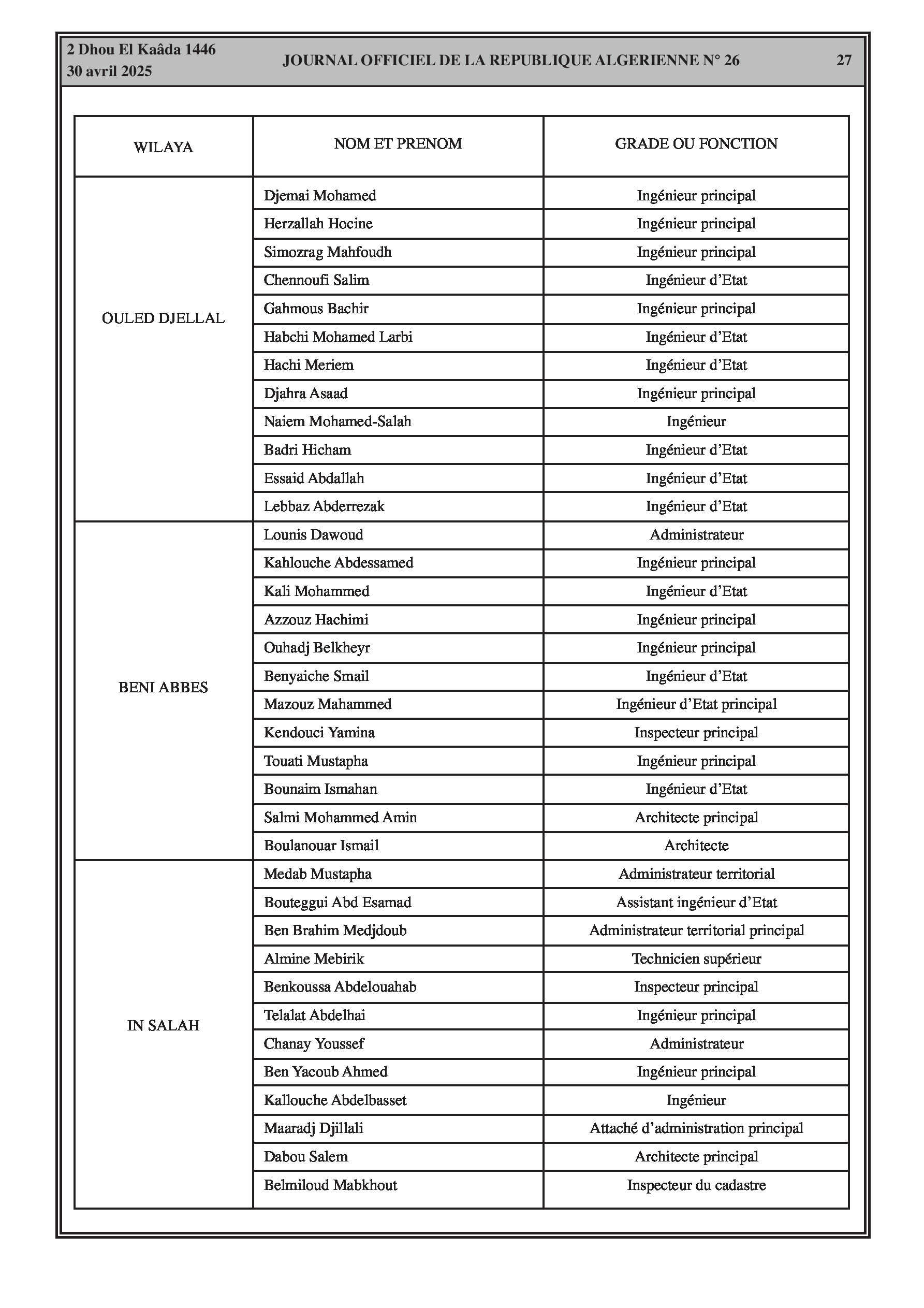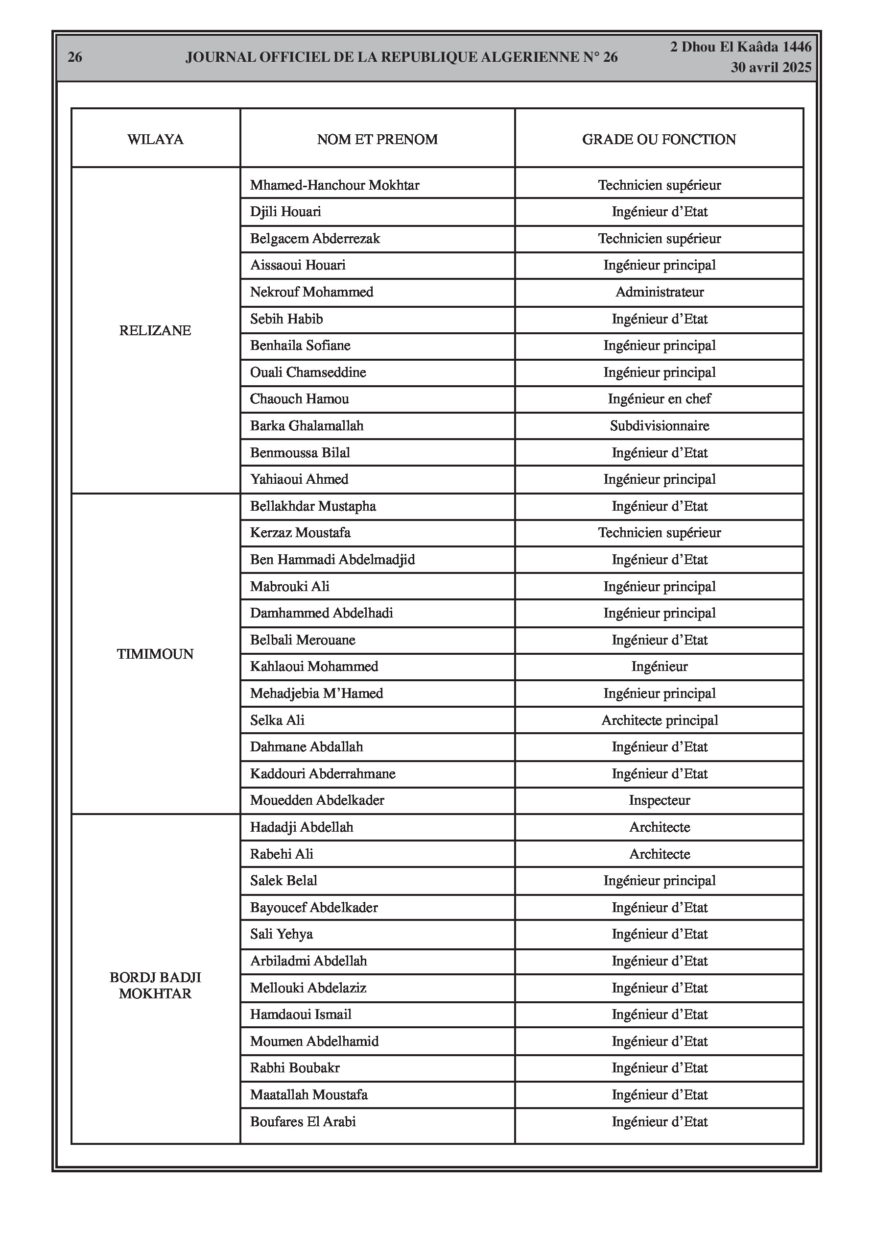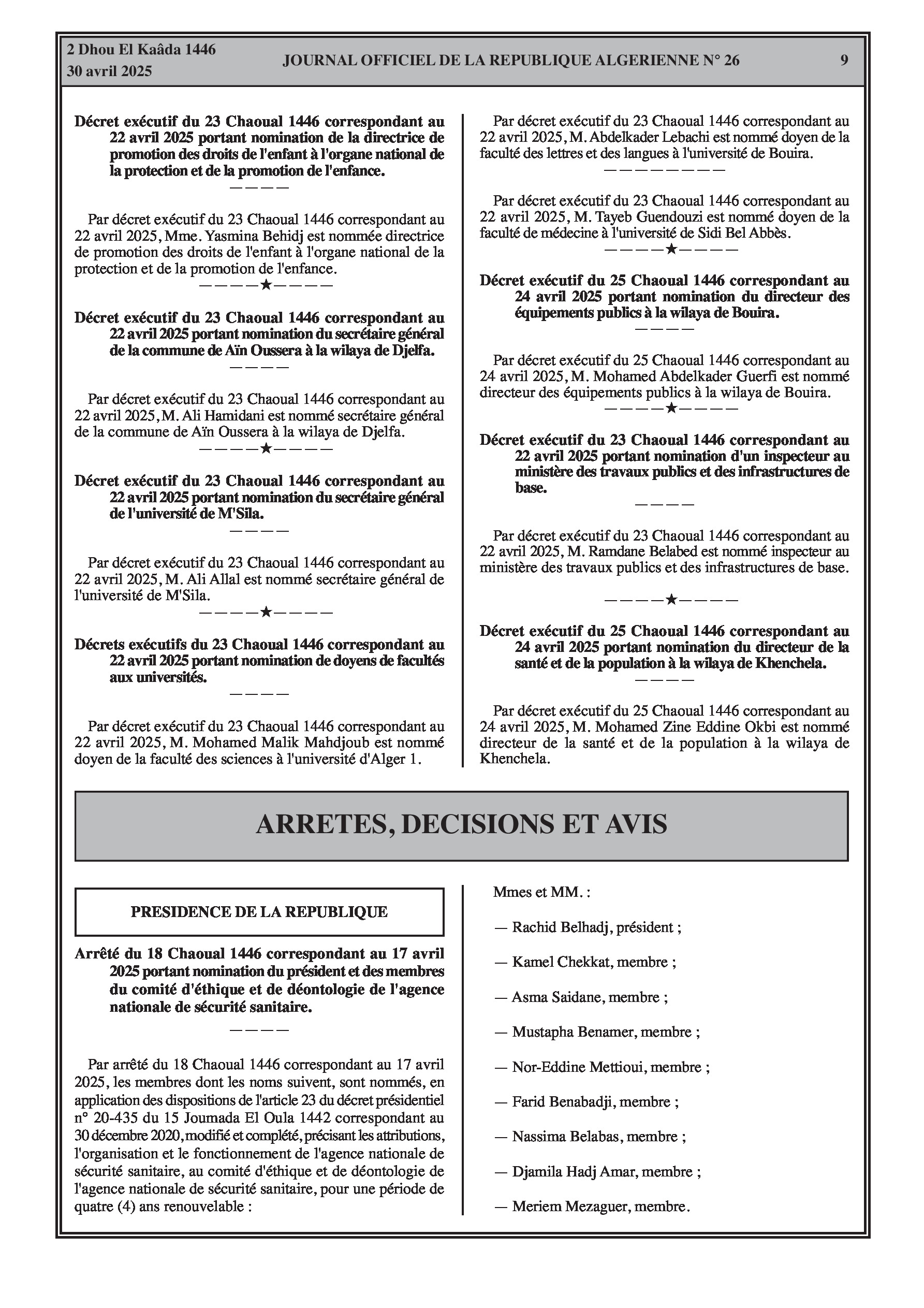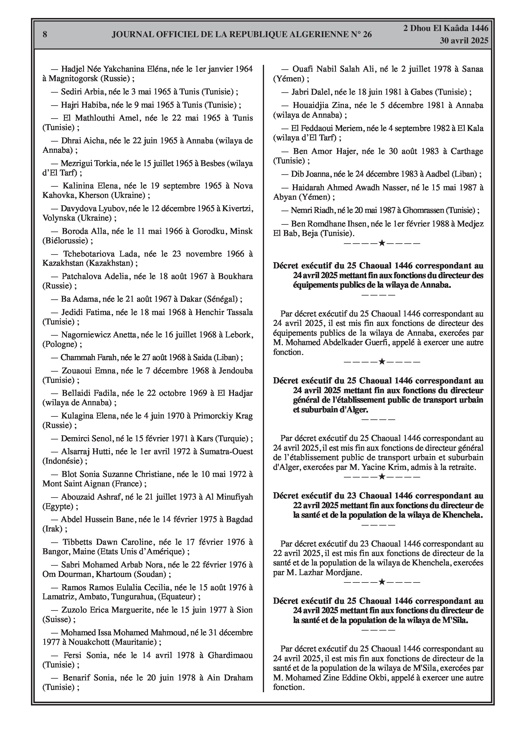 Décisions individuelles comprenant l'octroi de la nationalité algérienne à plusieurs personnes, ainsi que la fin de fonctions et la nomination de responsables à divers postes, notamment des directeurs d'équipements publics, des transports, de la santé, de la promotion des droits de l'enfant, des secrétaires généraux de communes et d'universités, et des doyens de facultés.