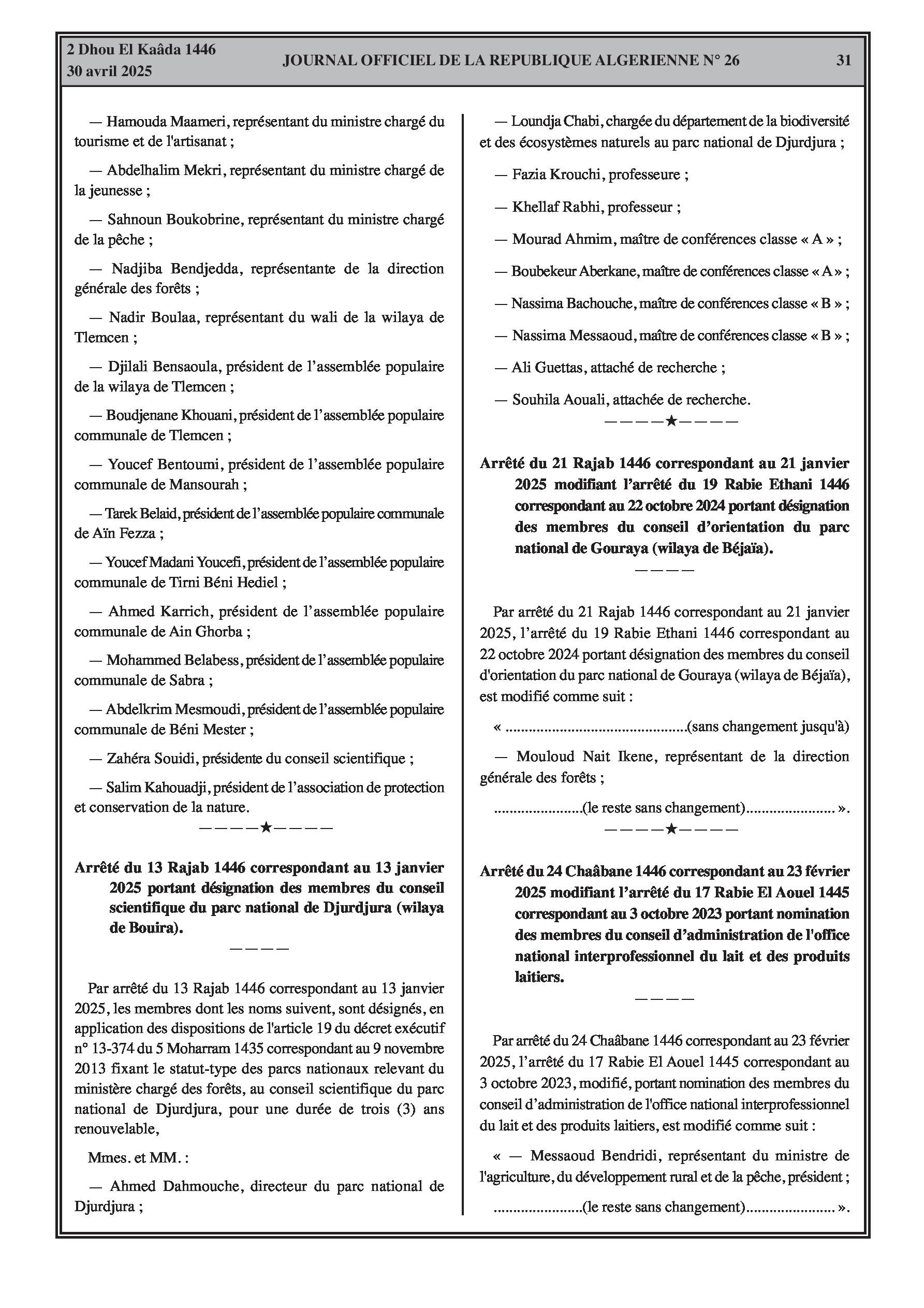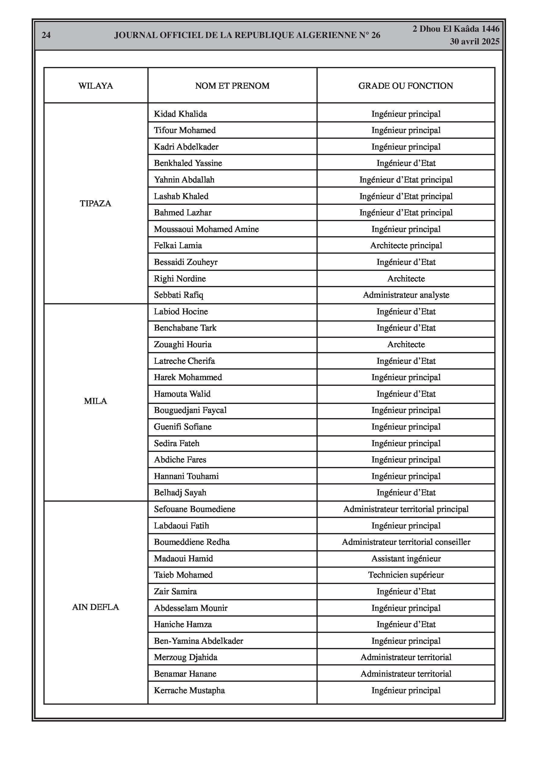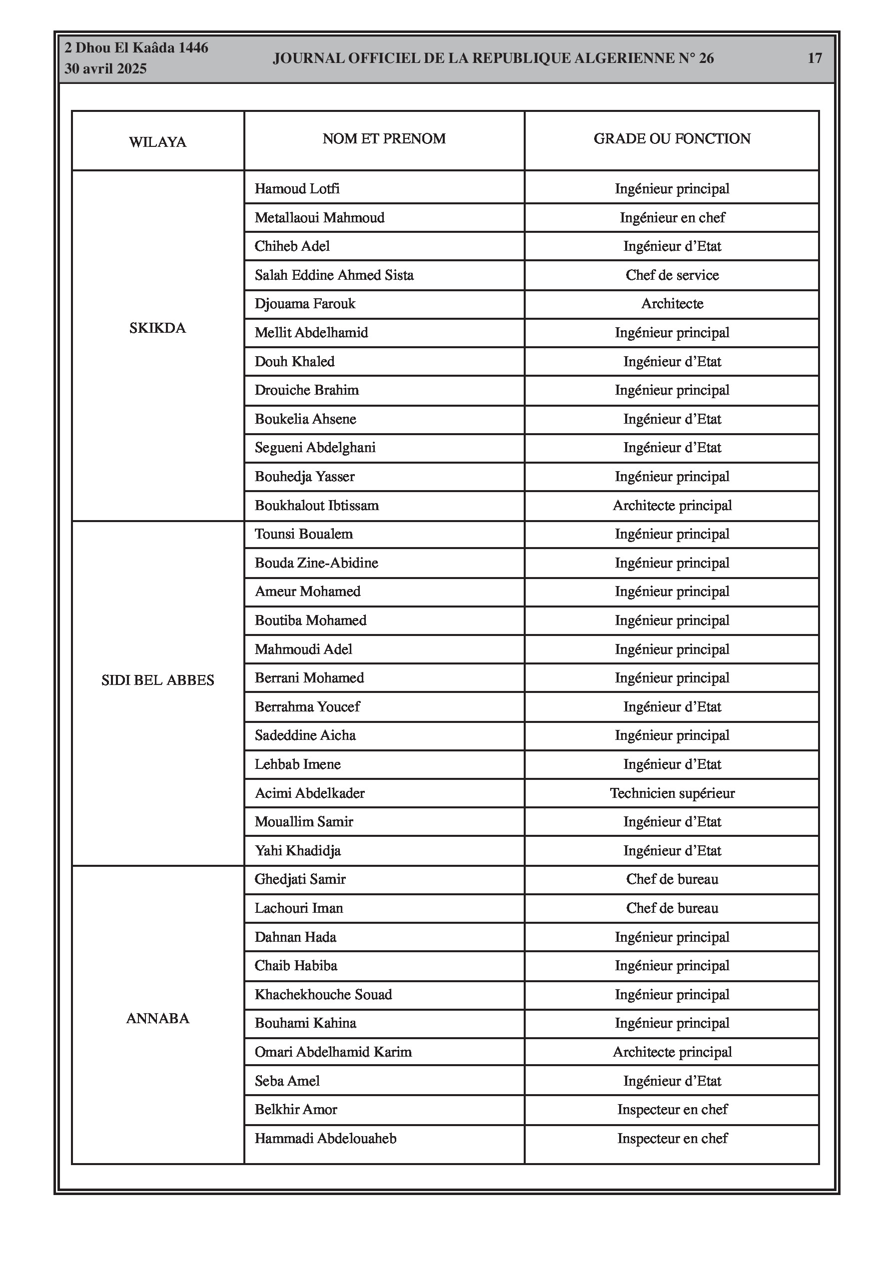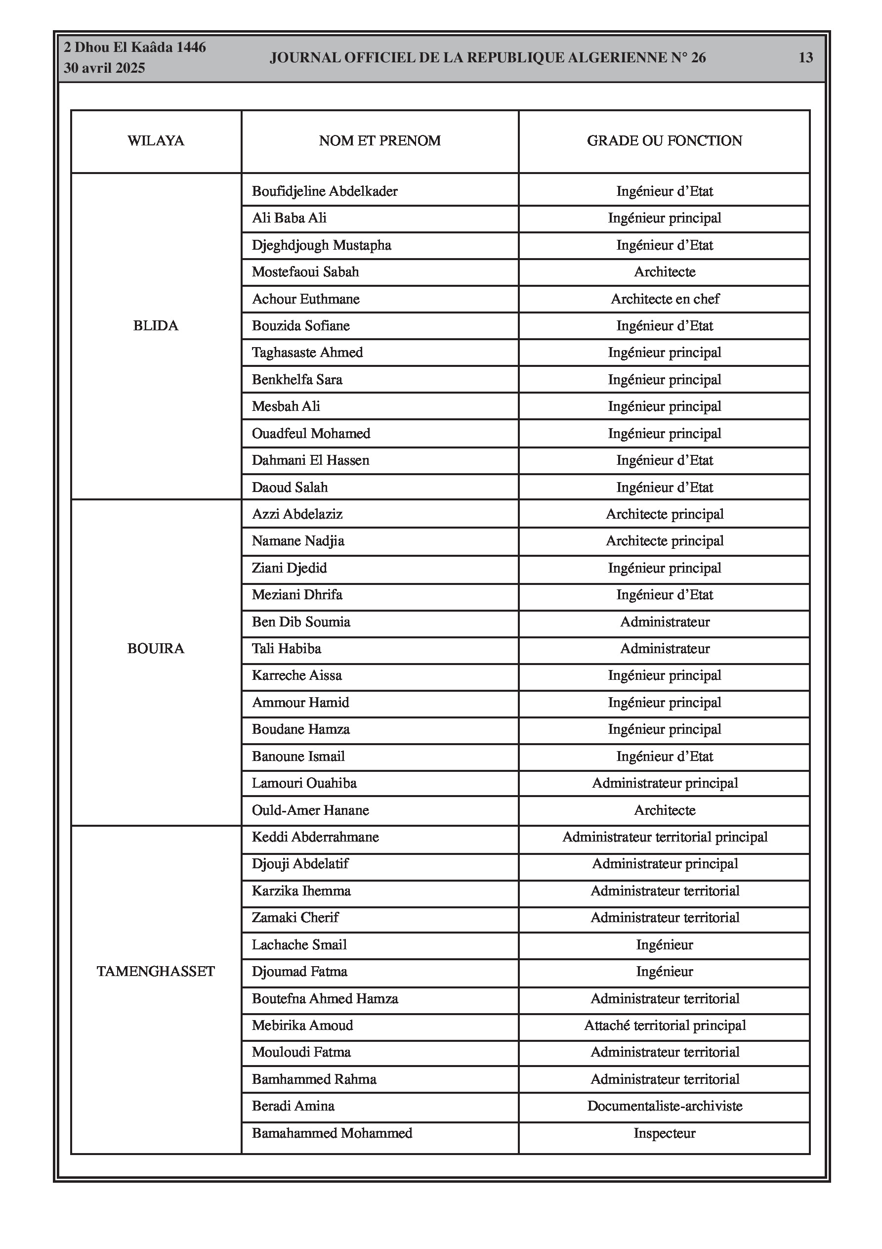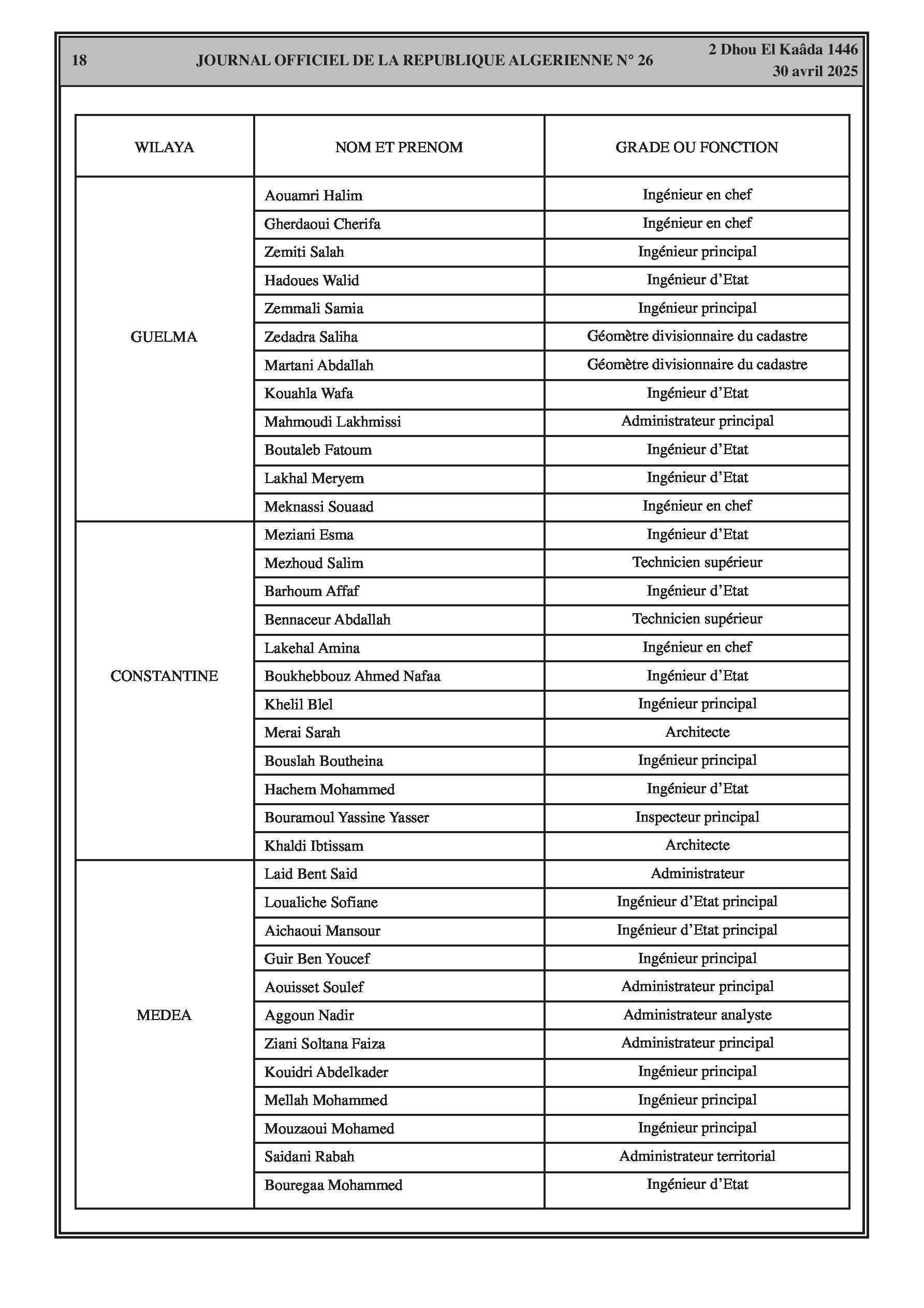 Décisions individuelles comprenant l'octroi de la nationalité algérienne à plusieurs personnes, ainsi que la fin de fonctions et la nomination de responsables à divers postes, notamment des directeurs d'équipements publics, des transports, de la santé, de la promotion des droits de l'enfant, des secrétaires généraux de communes et d'universités, et des doyens de facultés.
