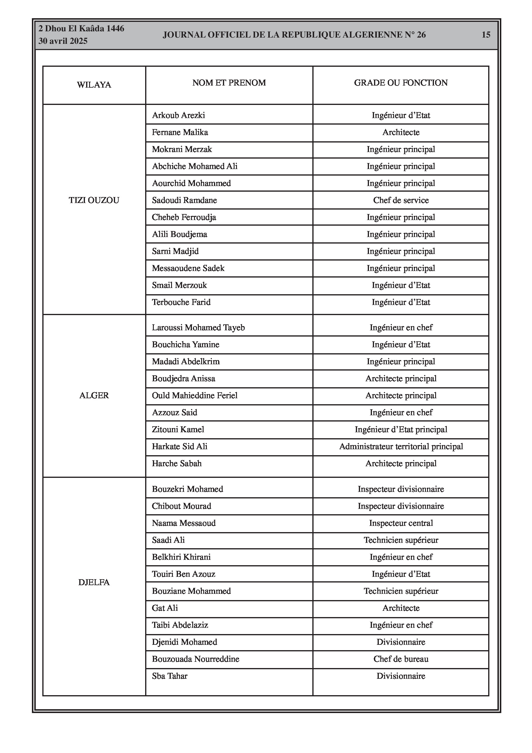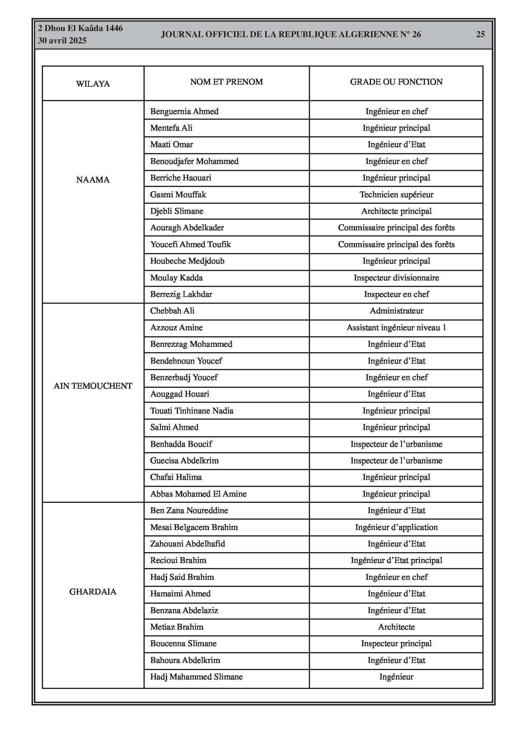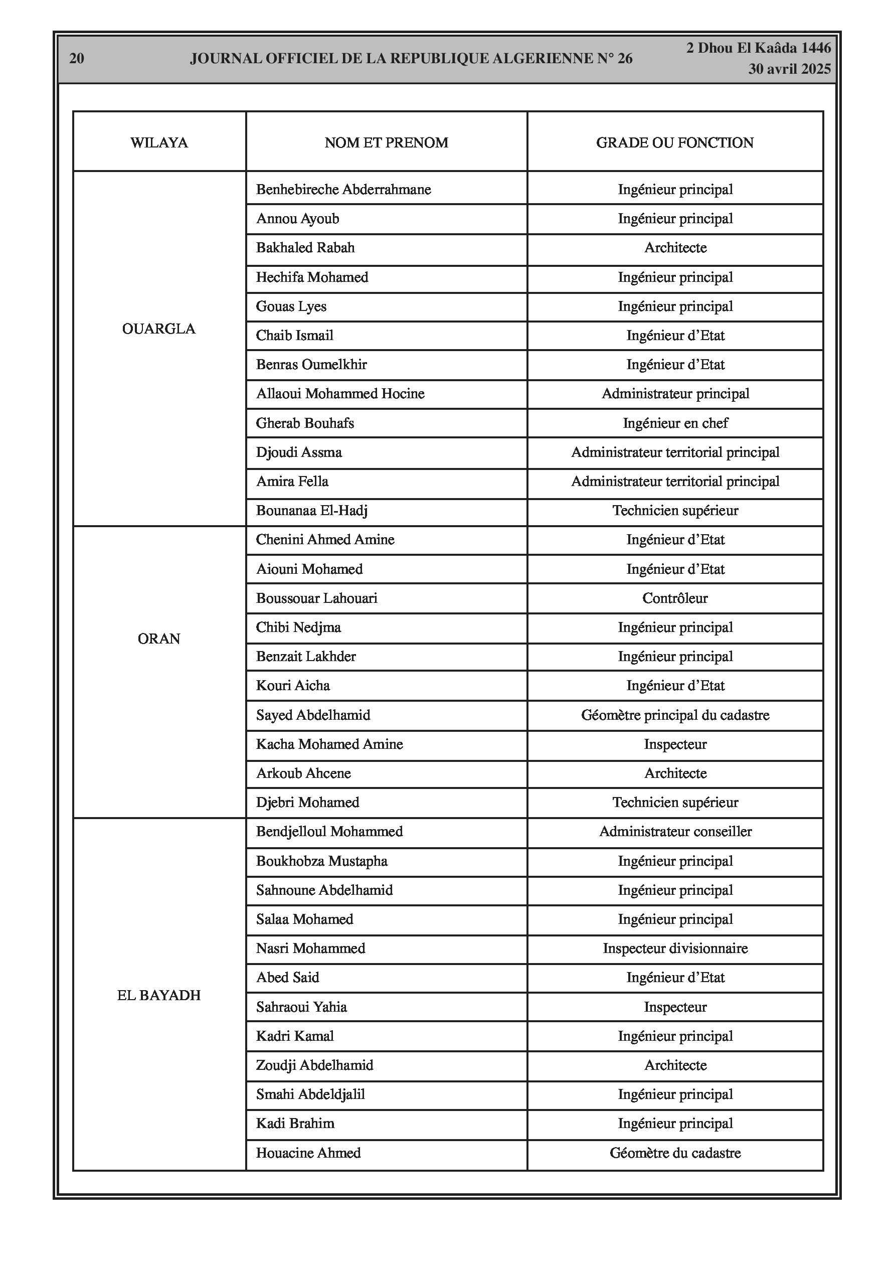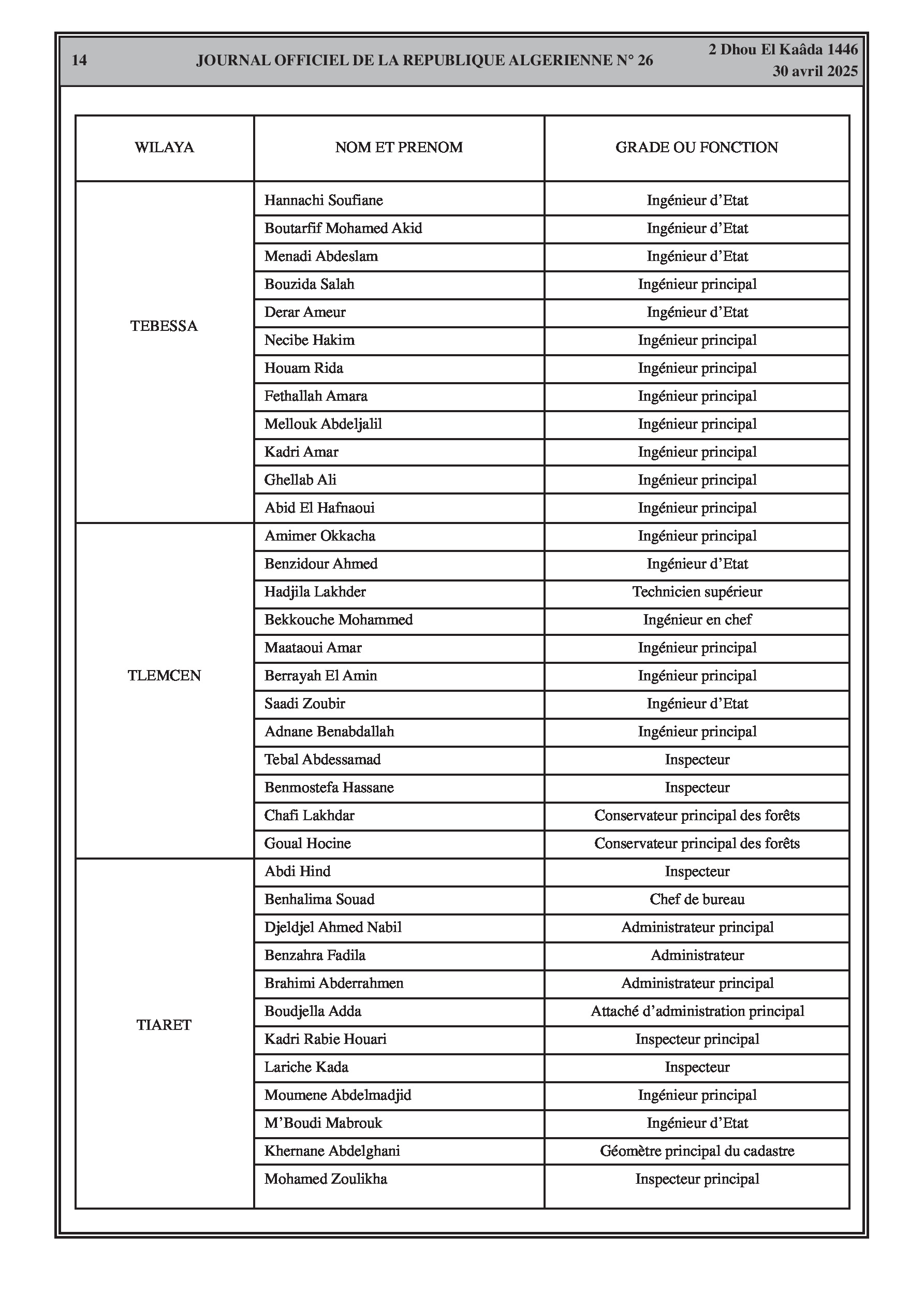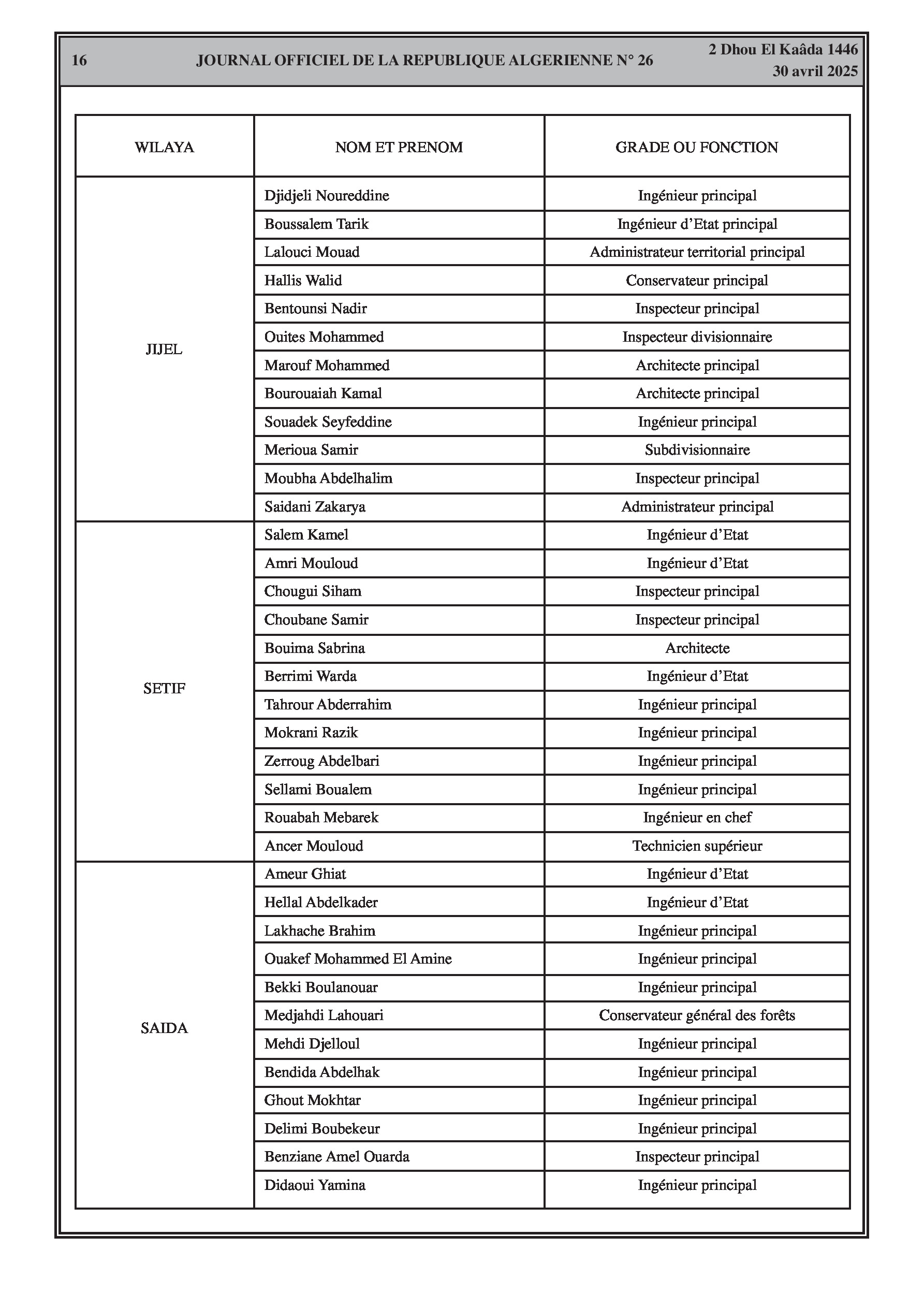 Décisions individuelles comprenant l'octroi de la nationalité algérienne à plusieurs personnes, ainsi que la fin de fonctions et la nomination de responsables à divers postes, notamment des directeurs d'équipements publics, des transports, de la santé, de la promotion des droits de l'enfant, des secrétaires généraux de communes et d'universités, et des doyens de facultés.