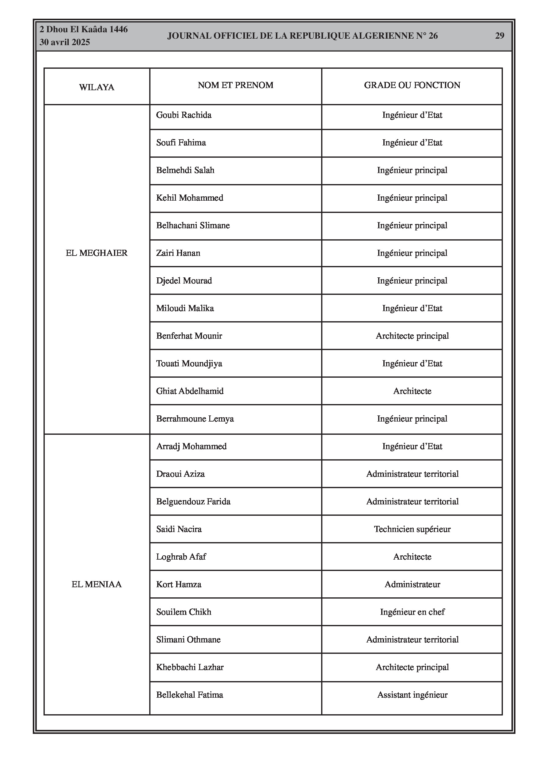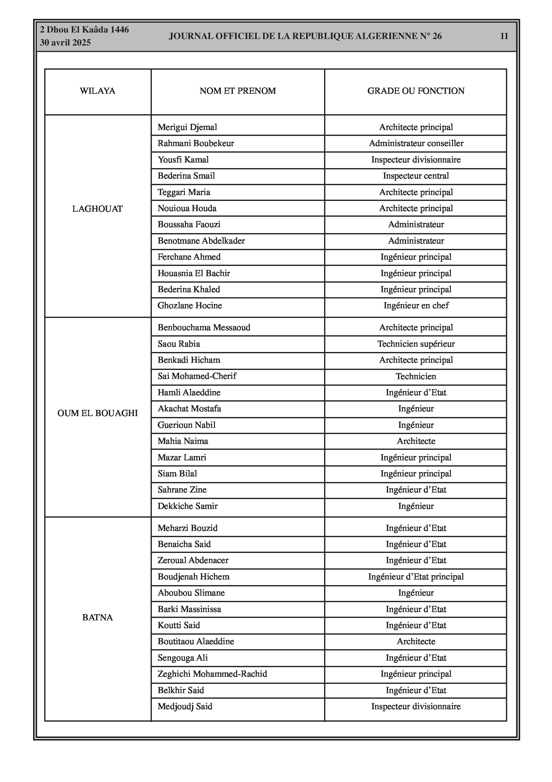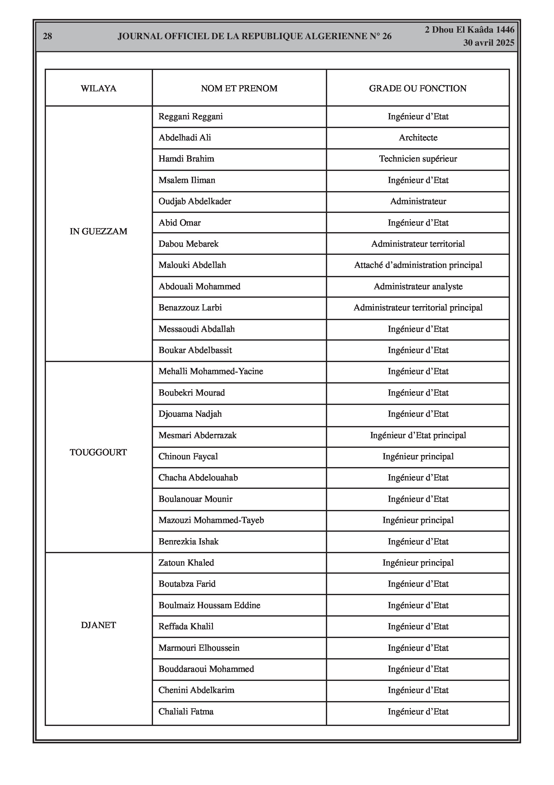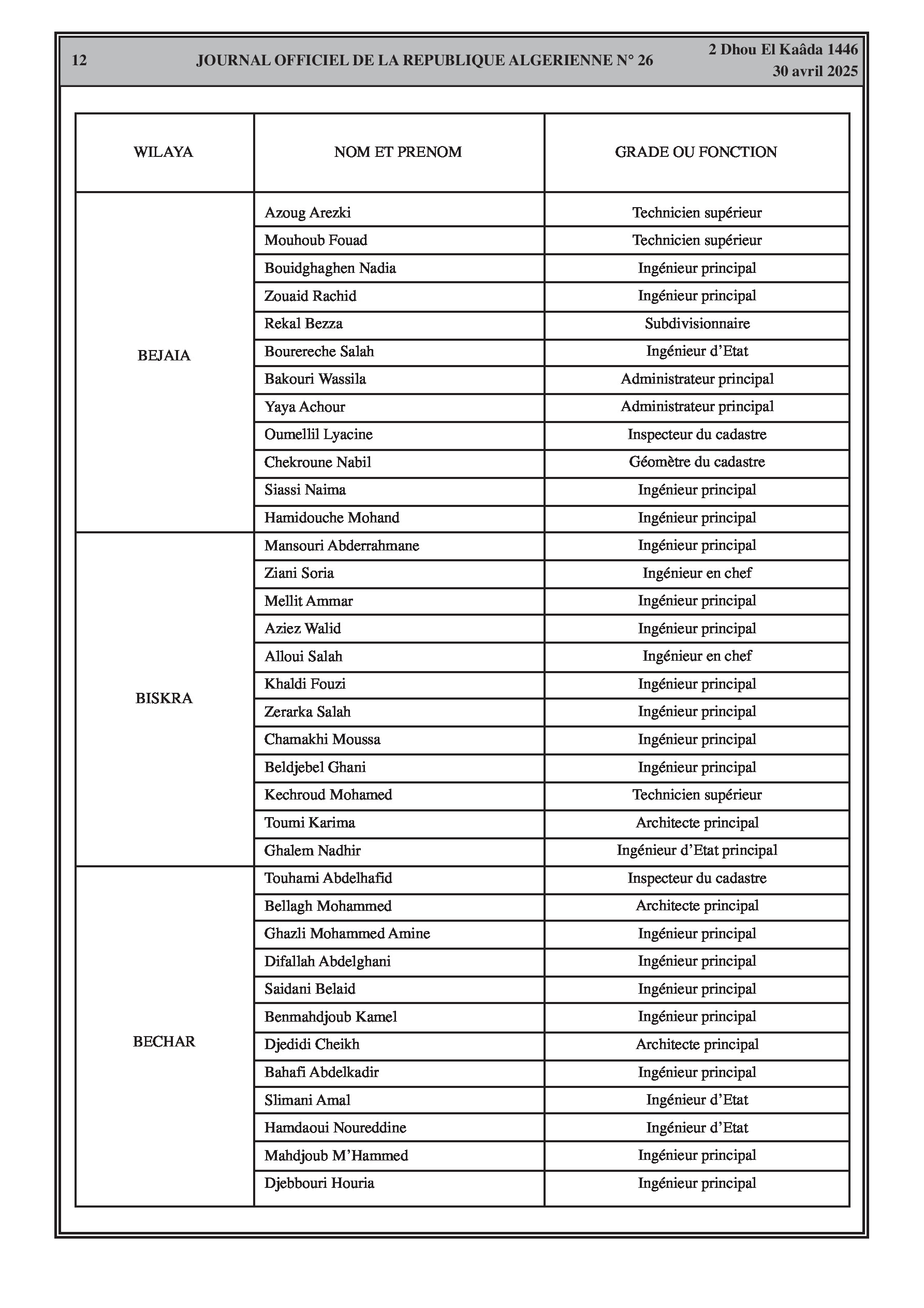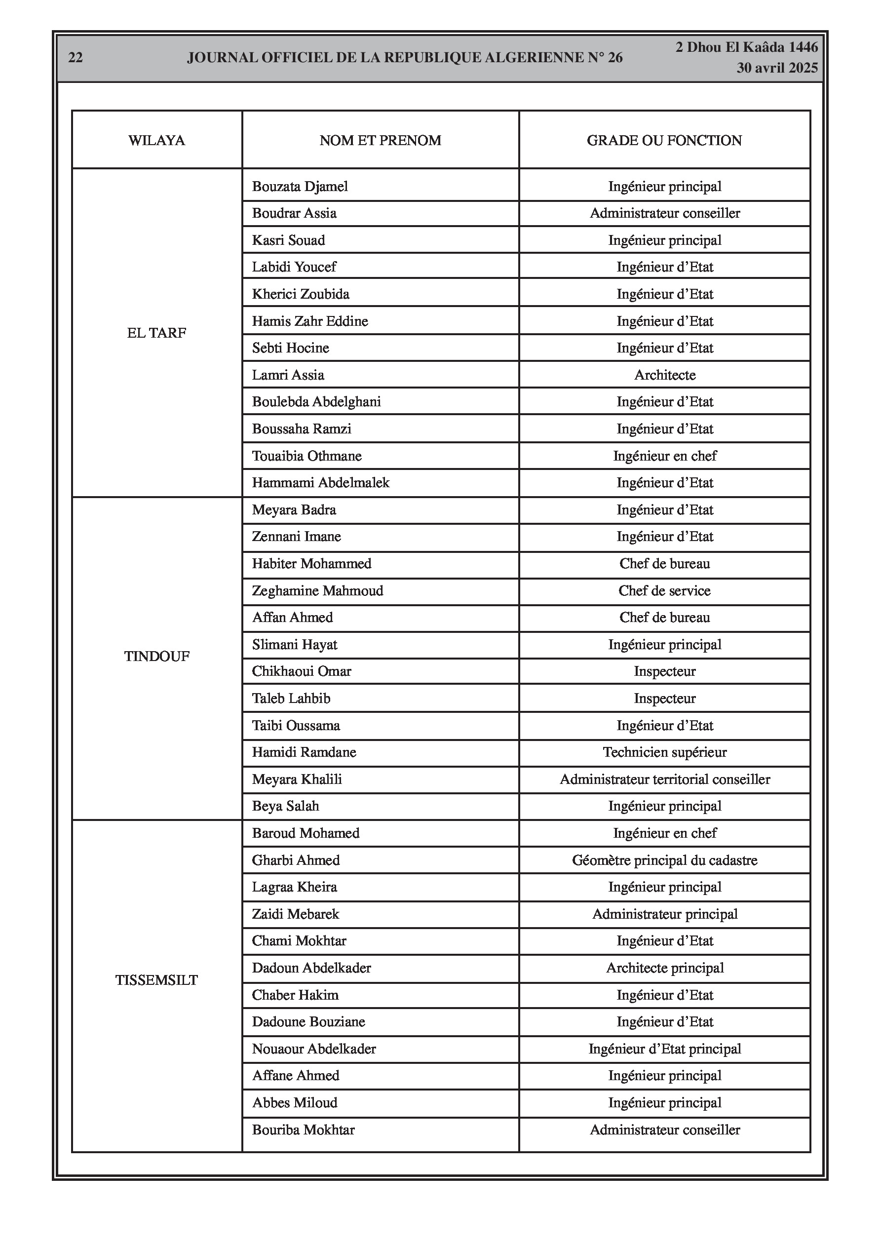 Décisions individuelles comprenant l'octroi de la nationalité algérienne à plusieurs personnes, ainsi que la fin de fonctions et la nomination de responsables à divers postes, notamment des directeurs d'équipements publics, des transports, de la santé, de la promotion des droits de l'enfant, des secrétaires généraux de communes et d'universités, et des doyens de facultés.