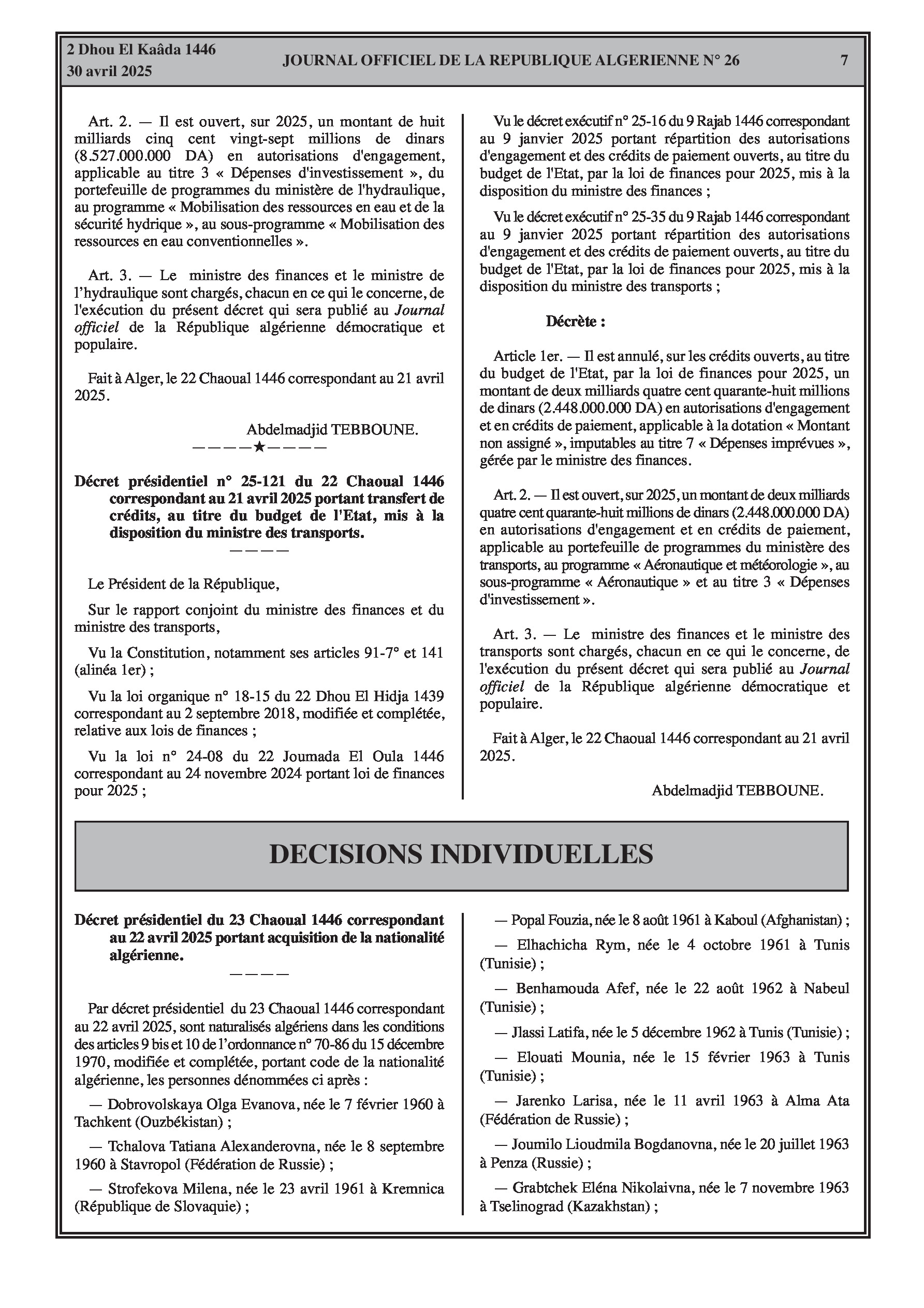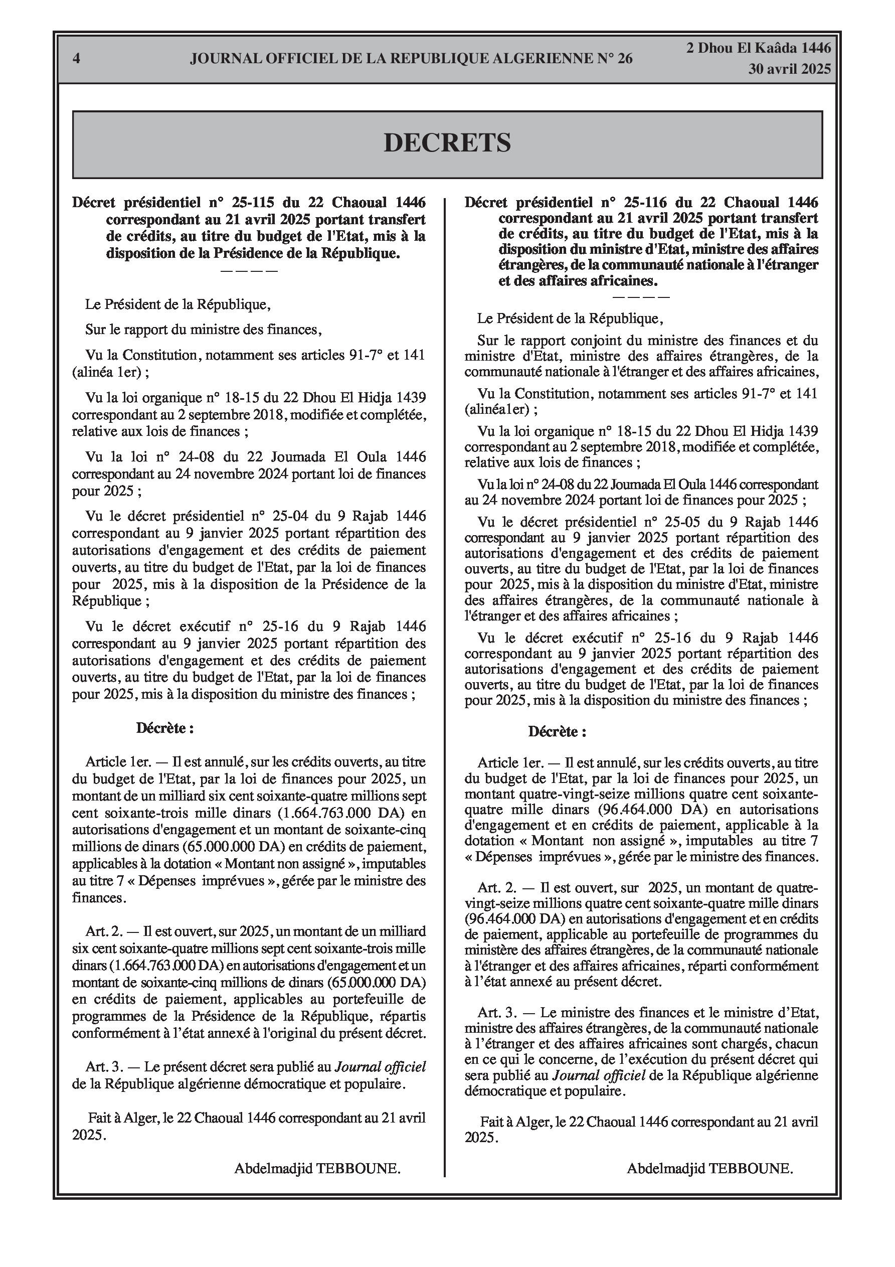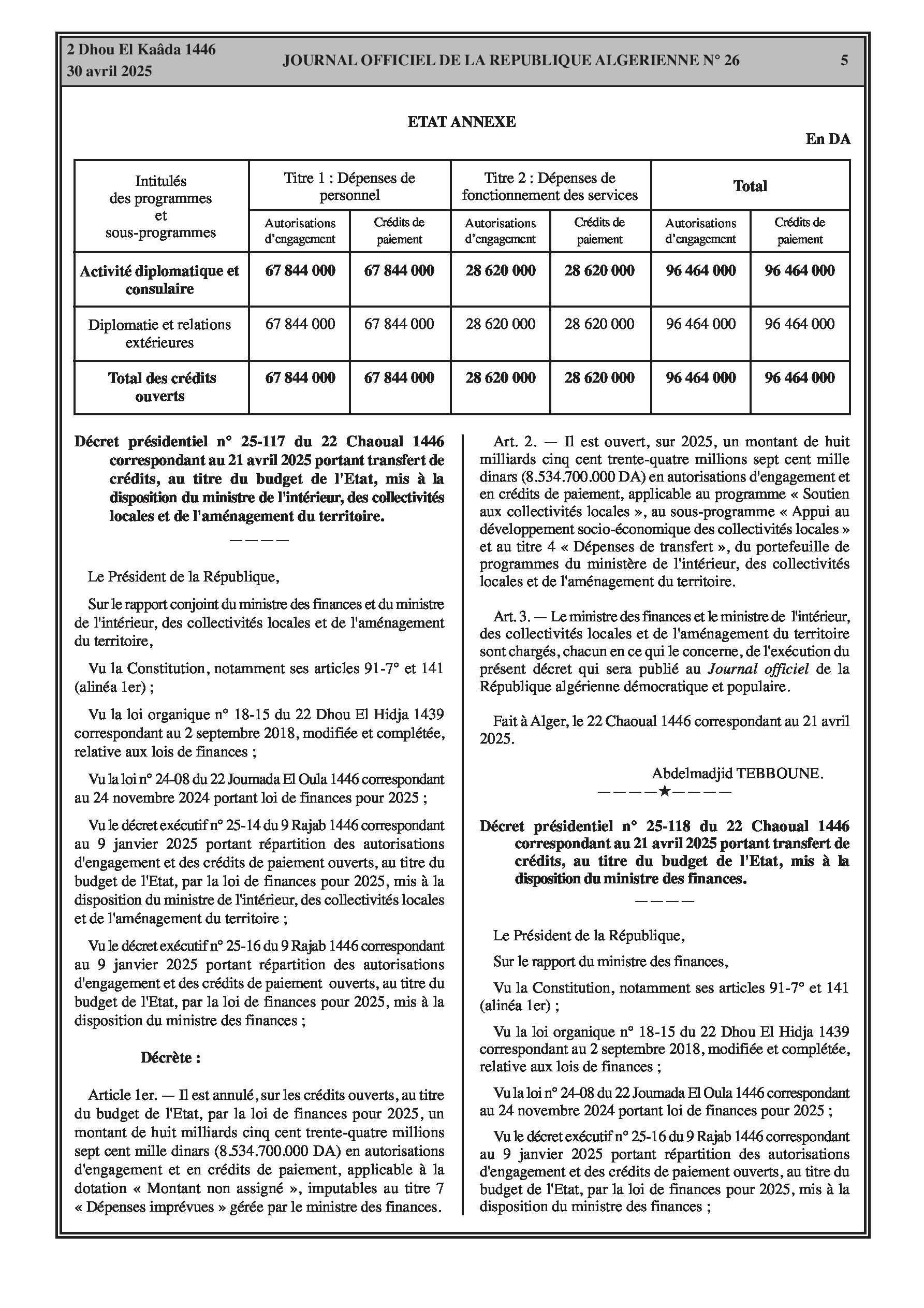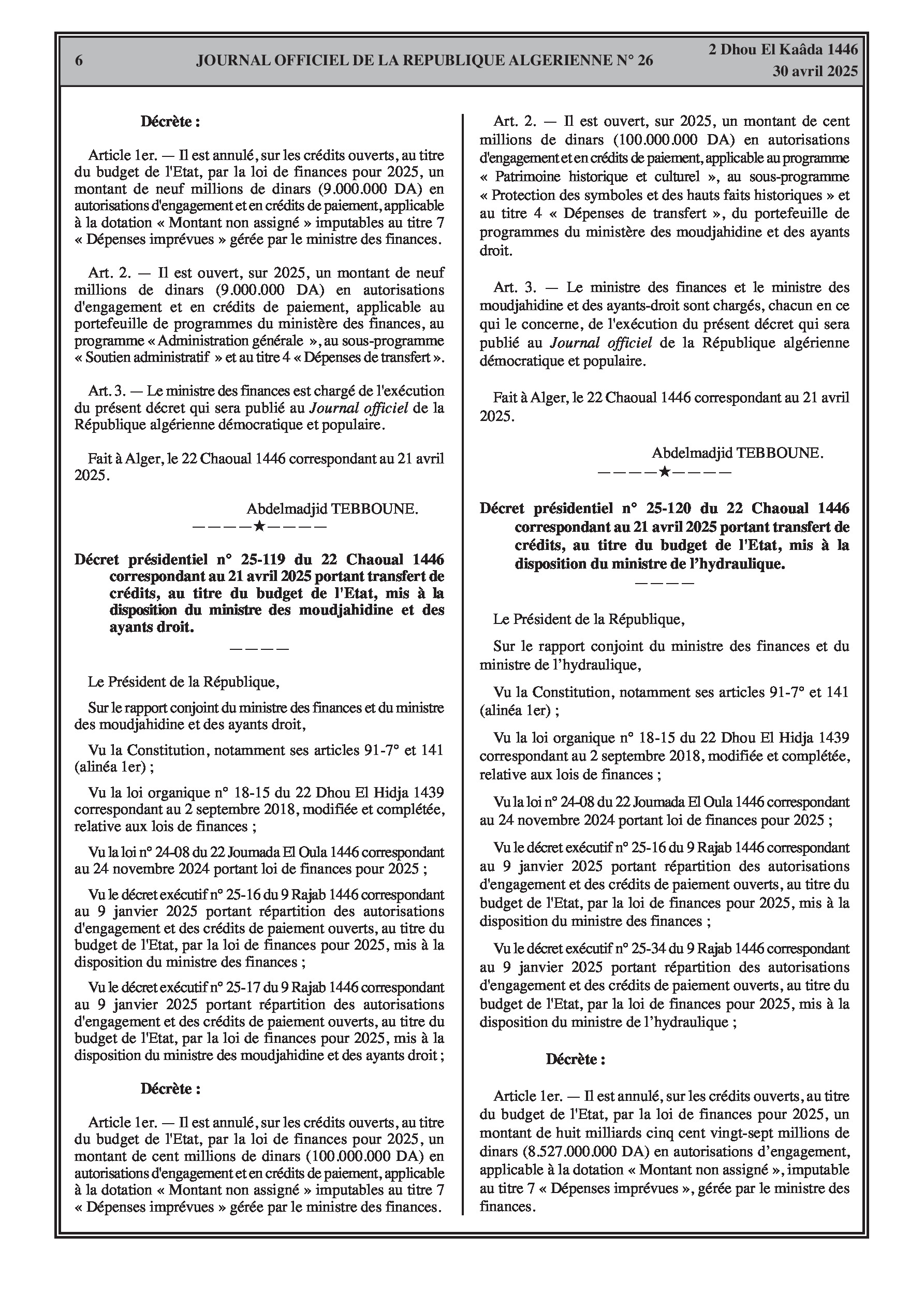 Décrets présidentiels relatifs aux transferts de crédits financiers au sein du budget de l'État pour 2025 au profit de la Présidence de la République et des ministères des Affaires étrangères, de l'Intérieur, des Finances, des Moudjahidine, de l'Hydraulique et des Transports.