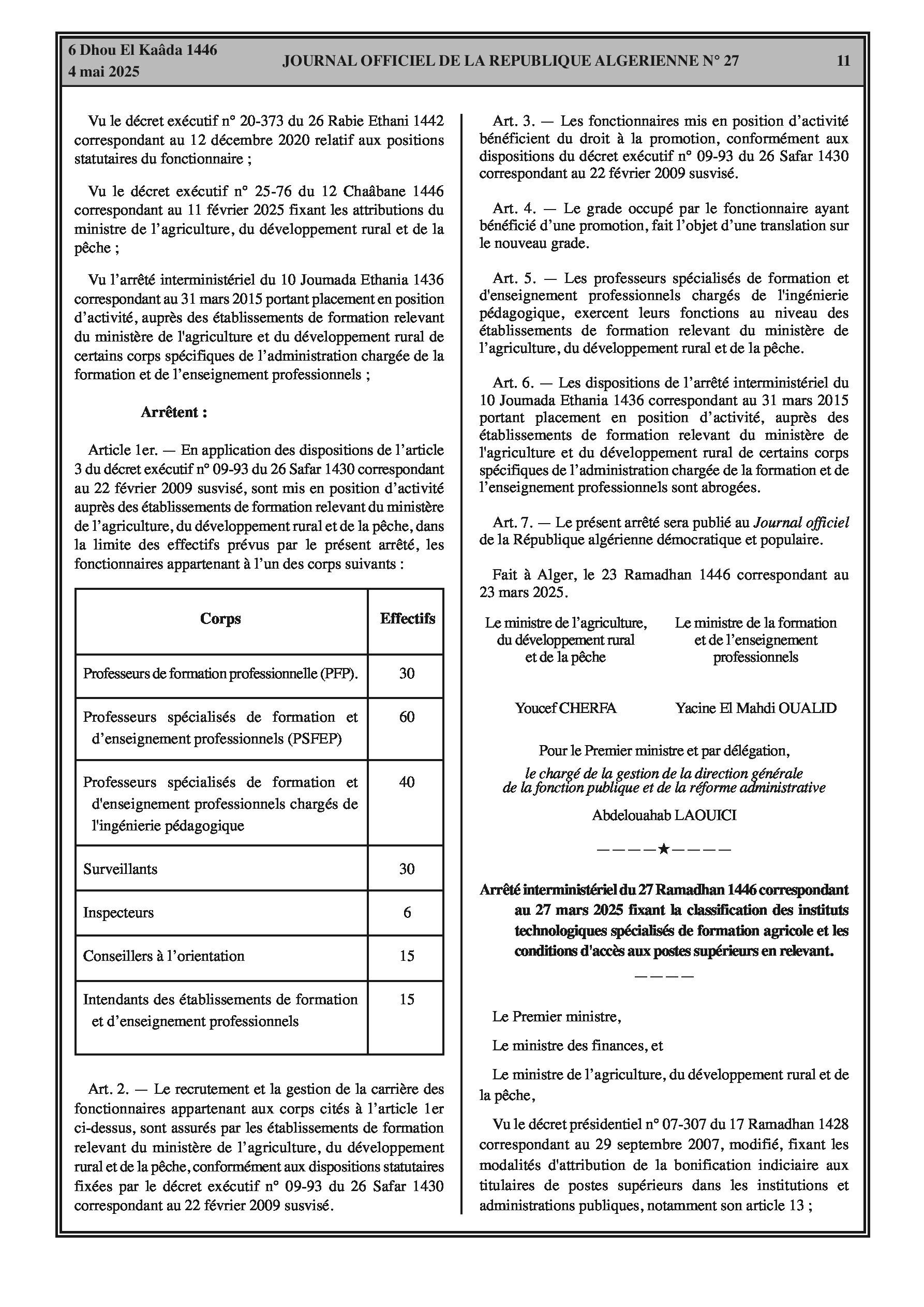 Fixation des effectifs des fonctionnaires (professeurs de formation professionnelle, professeurs spécialisés, surveillants, inspecteurs, conseillers à l'orientation, intendants) placés en position d'activité auprès des établissements de formation agricole.