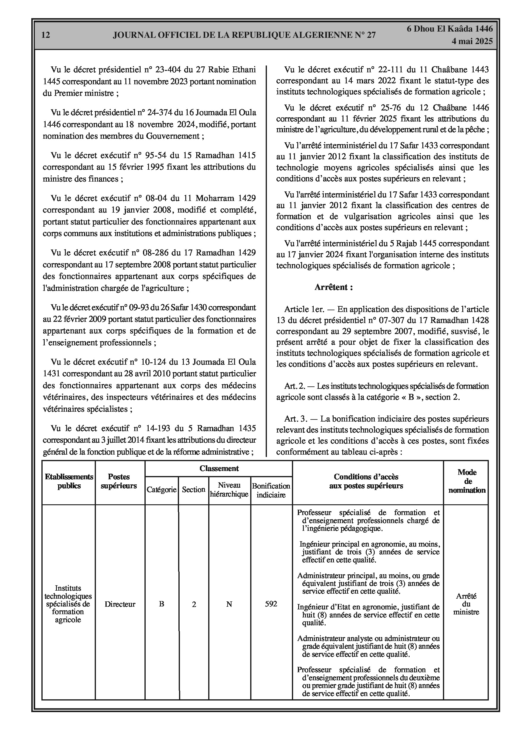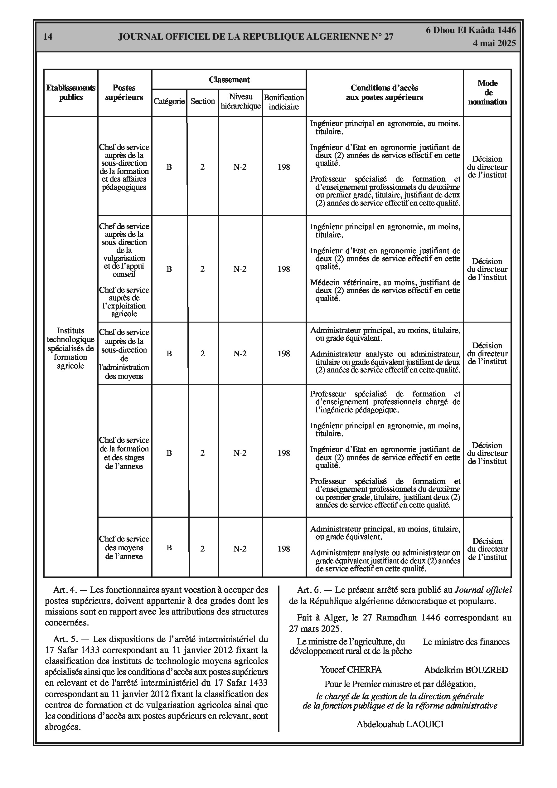 Arrêté interministériel fixant la classification des instituts technologiques spécialisés de formation agricole et les conditions d'accès aux postes supérieurs en relevant.