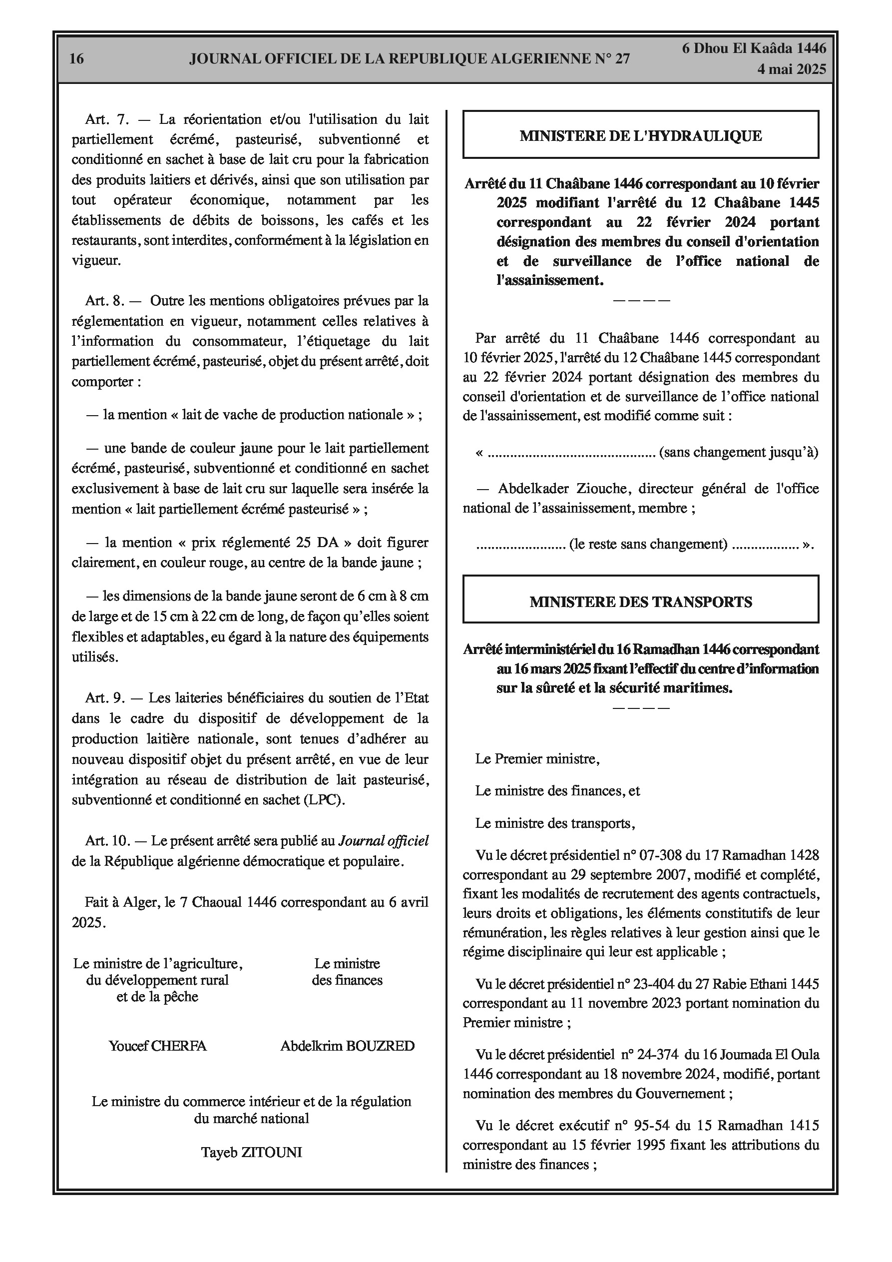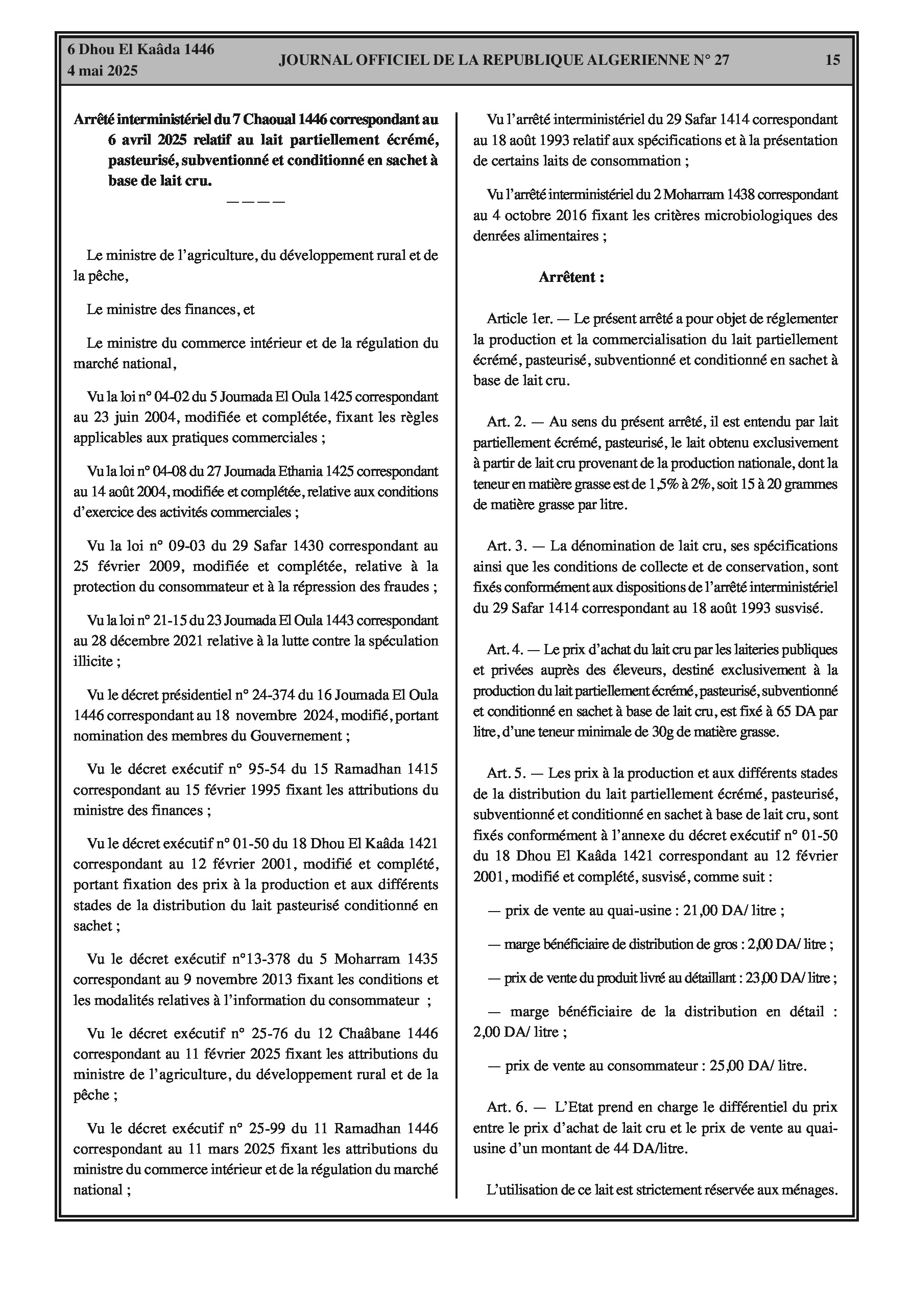Définit les spécifications de ce lait (taux de matière grasse 1,5%-2%), le prix d'achat aux éleveurs (65 DA/litre), les prix de vente aux différents stades (25 DA au consommateur), la prise en charge par l'Etat du différentiel (44 DA/litre). Fixe les conditions de conditionnement, d'étiquetage et interdit sa réorientation vers la fabrication de produits laitiers dérivés.