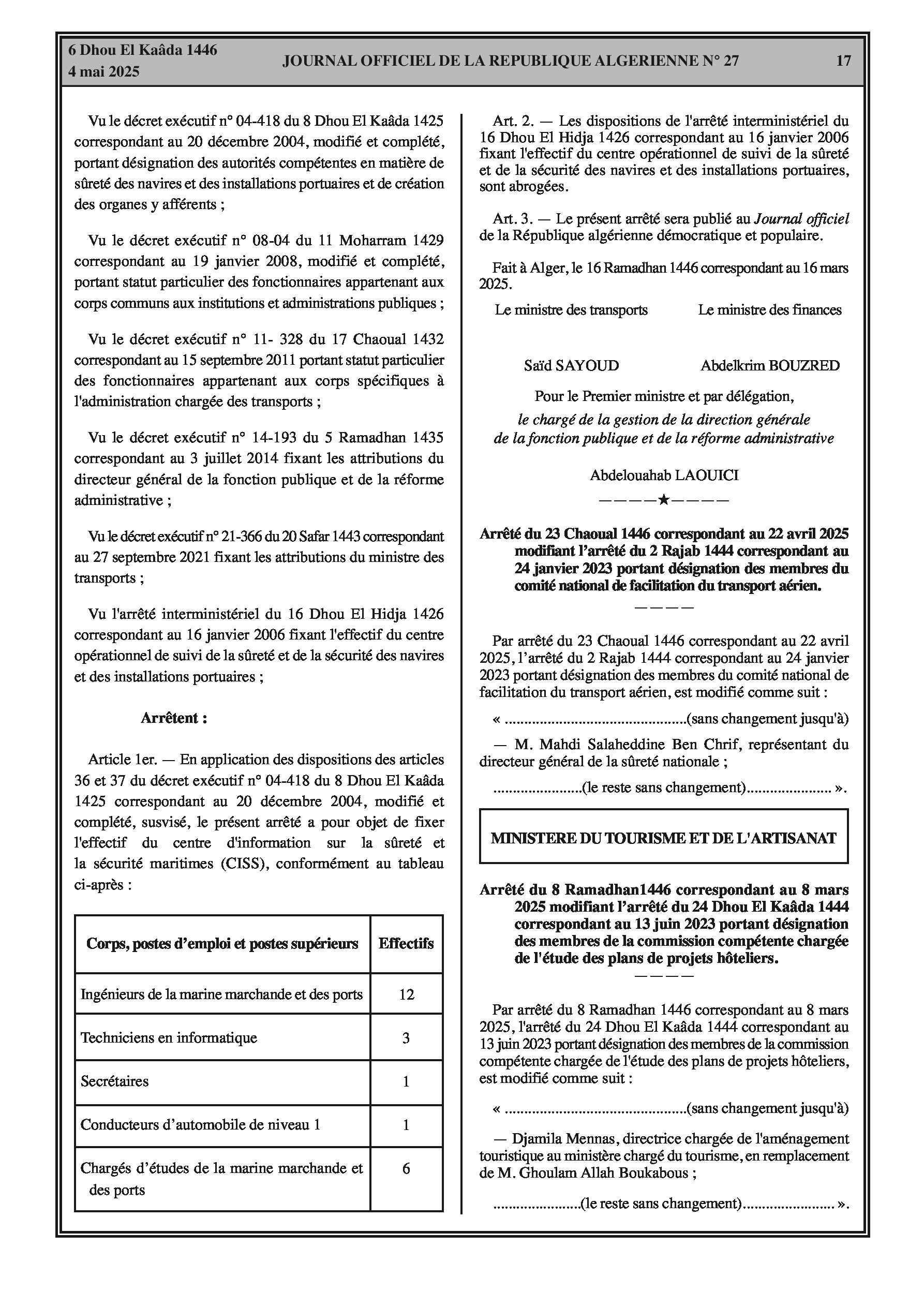 Fixation des effectifs des corps, postes d'emploi et postes supérieurs (ingénieurs de la marine marchande et des ports, techniciens en informatique, secrétaires, conducteurs d'automobile, chargés d'études).