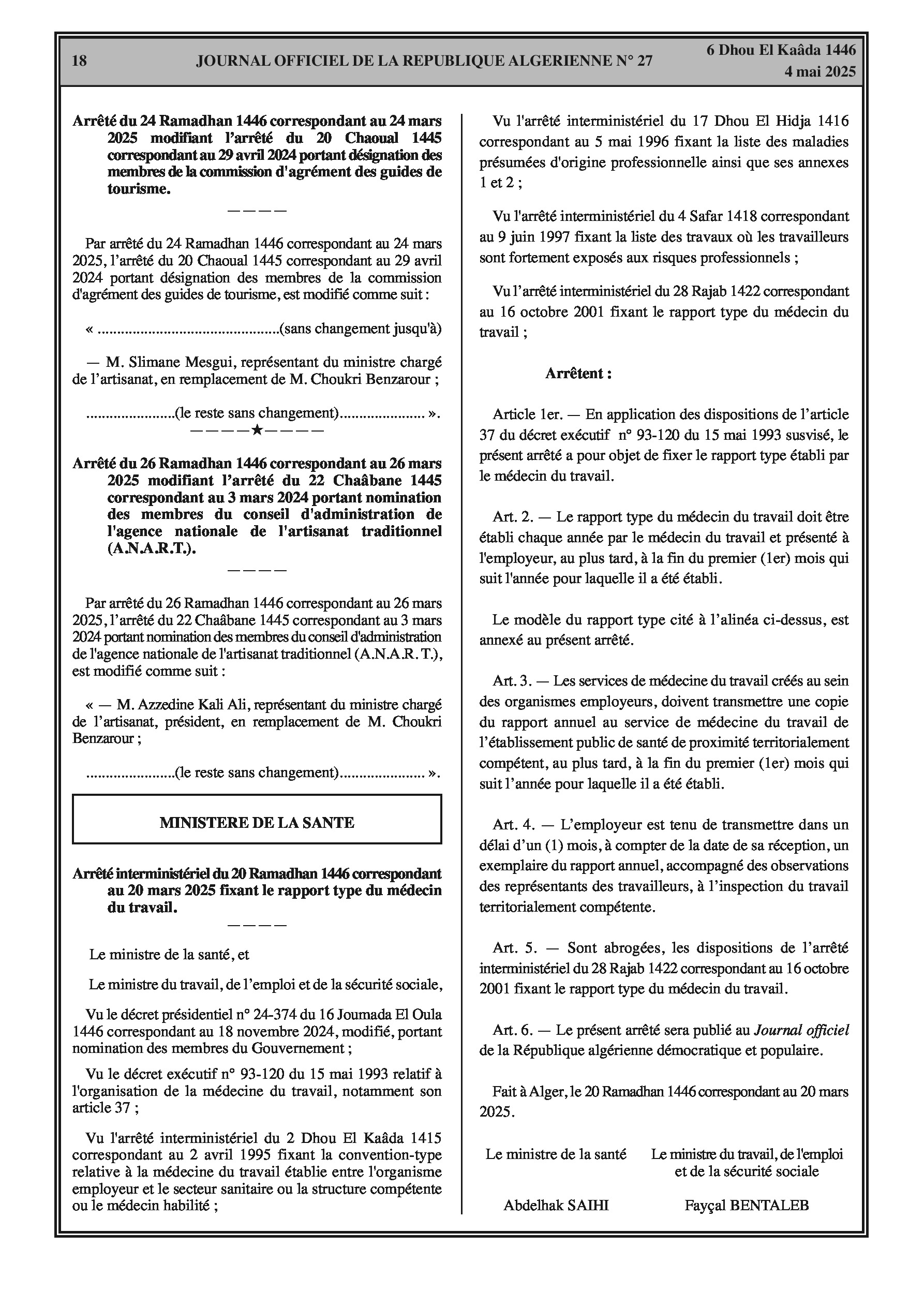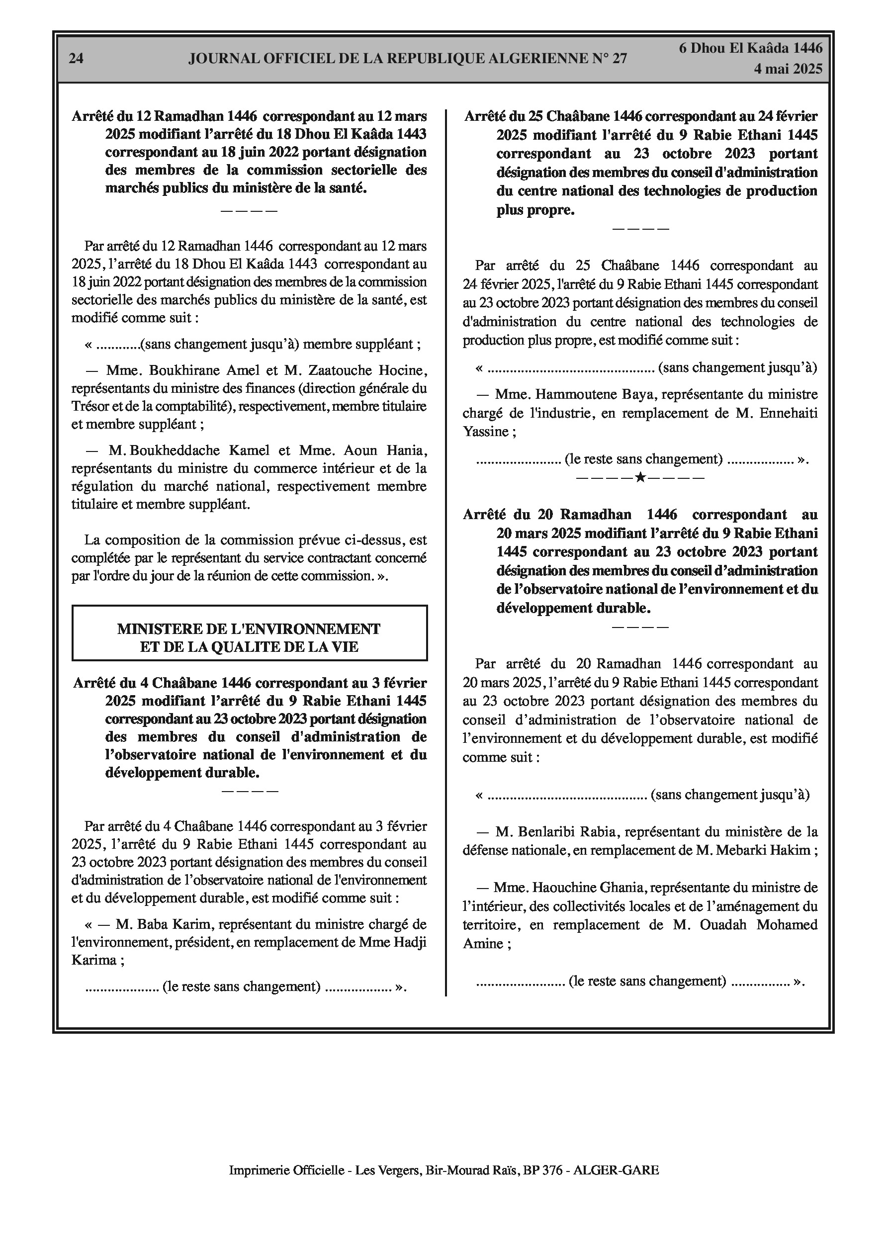 Désignation de M. Benlaribi Rabia (représentant ministère défense nationale) et Mme. Haouchine Ghania (représentante ministère intérieur) comme membres.