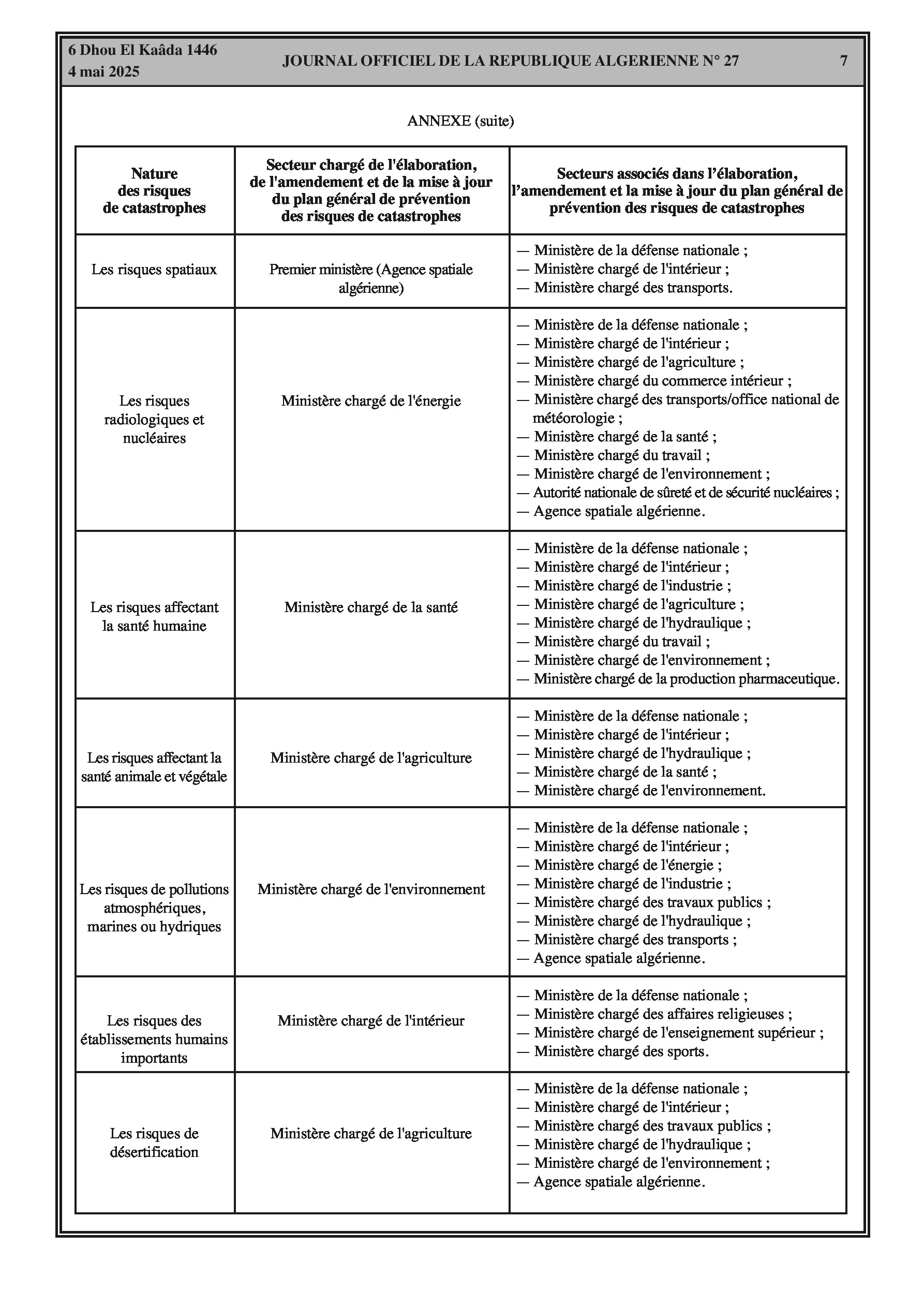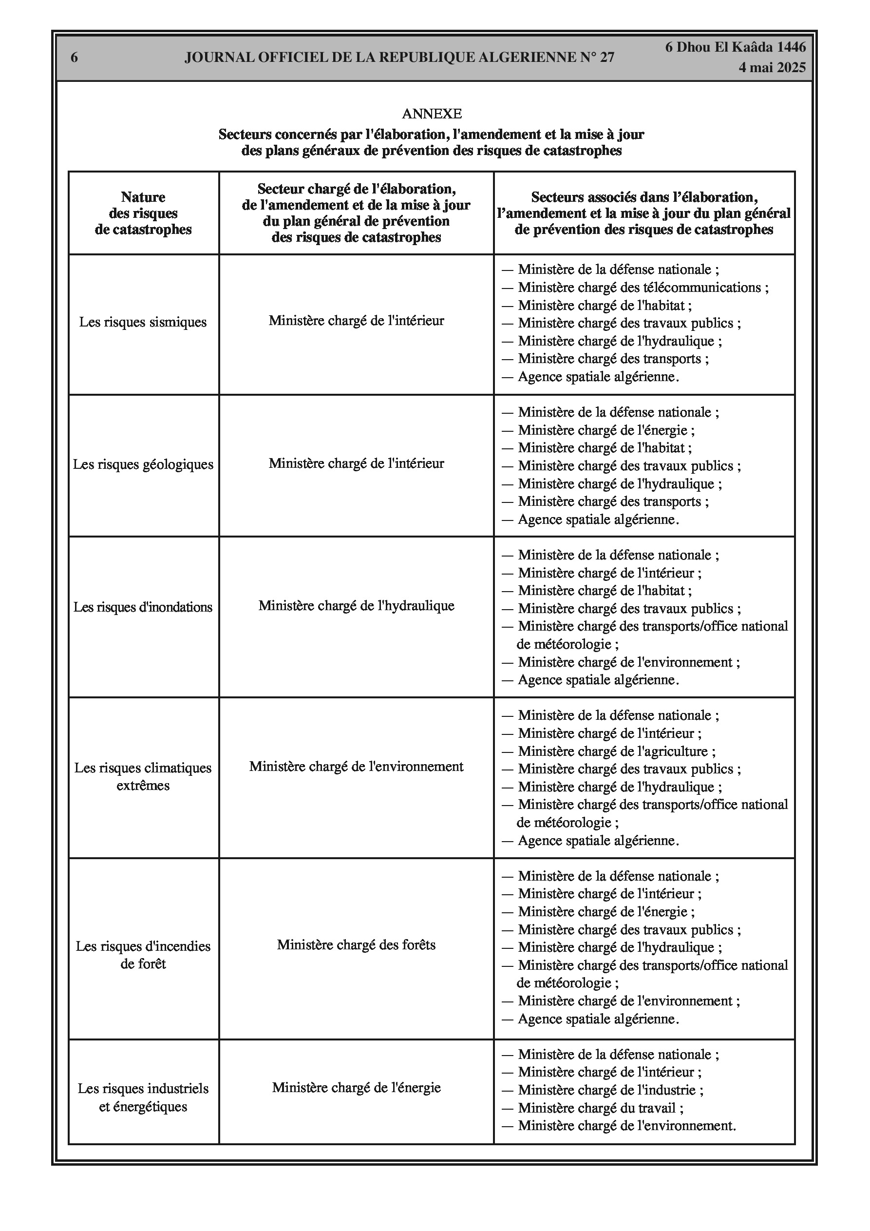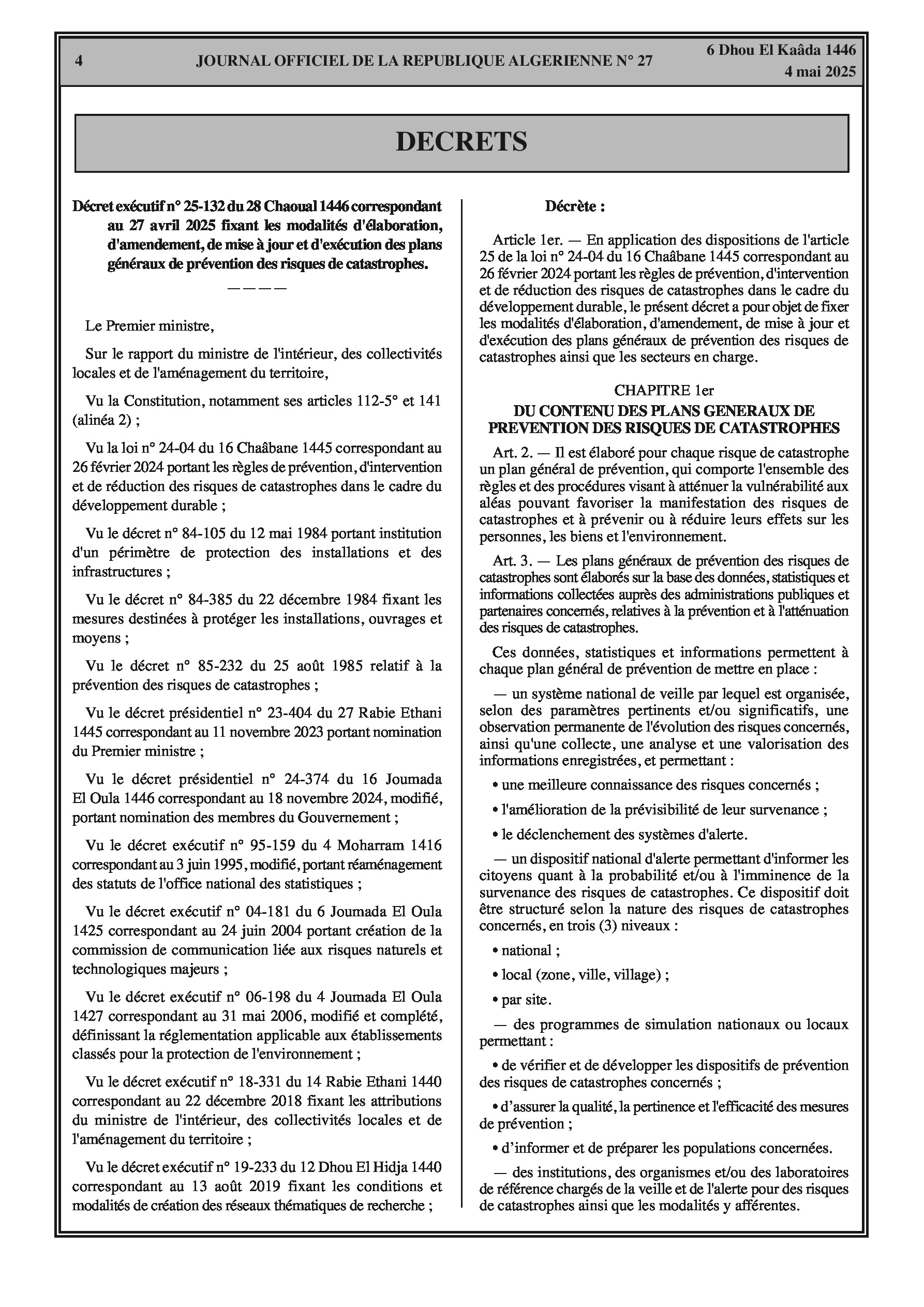 Décret exécutif fixant les modalités d'élaboration, d'amendement, de mise à jour et d'exécution des plans généraux de prévention des risques de catastrophes.