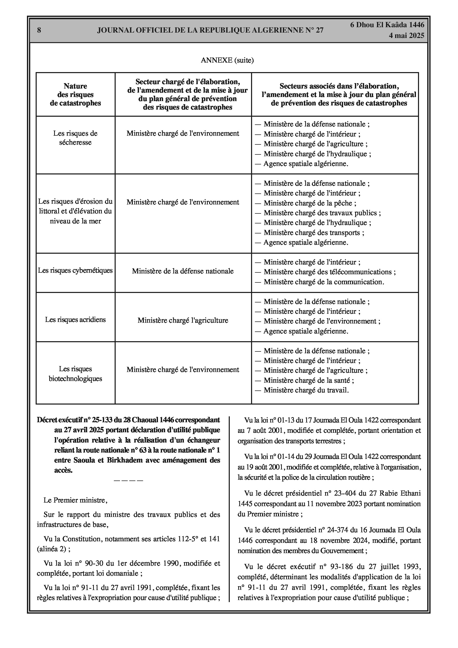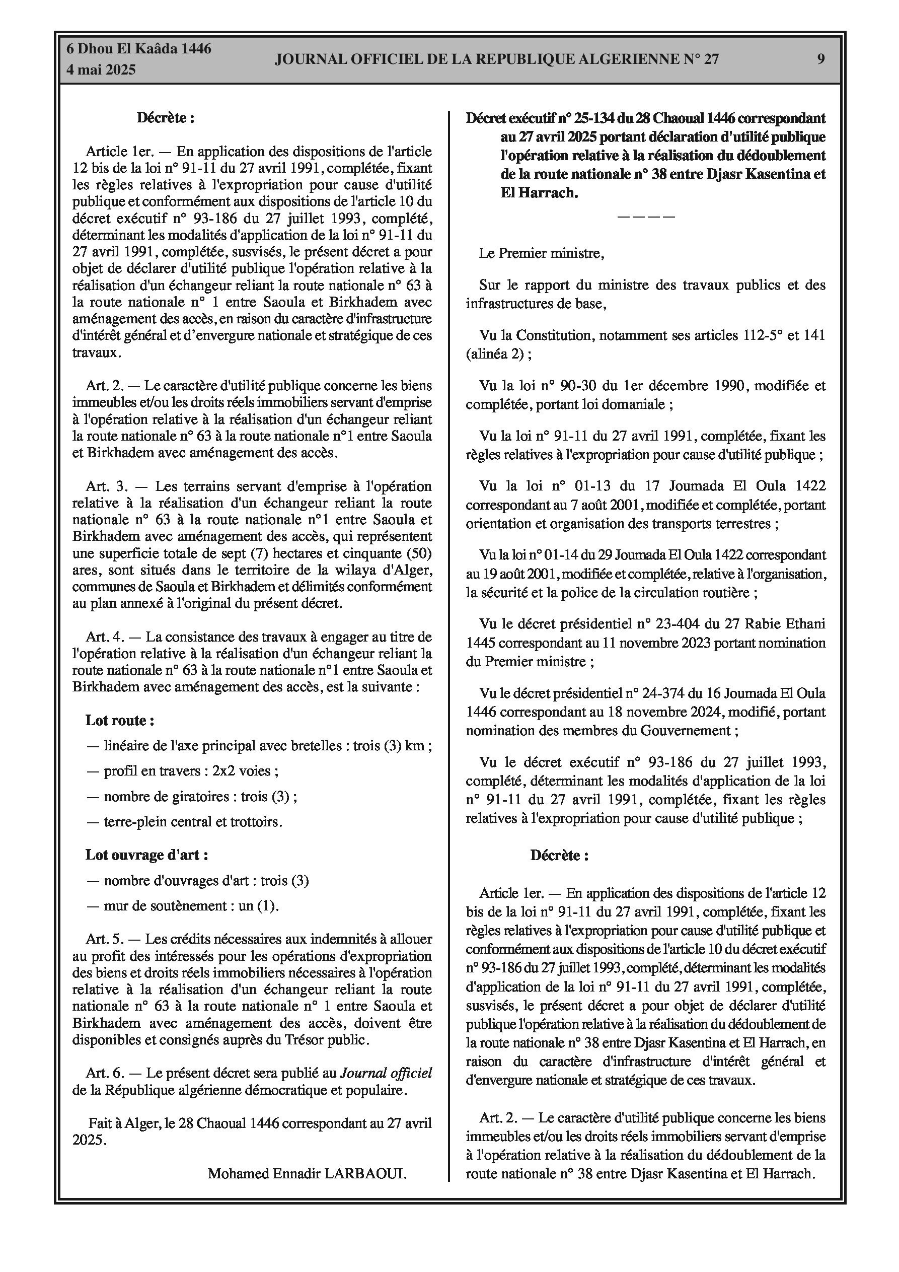 Décret exécutif portant déclaration d'utilité publique l'opération relative à la réalisation d'un échangeur reliant la route nationale n° 63 à la route nationale n° 1 entre Saoula et Birkhadem avec aménagement des accès.