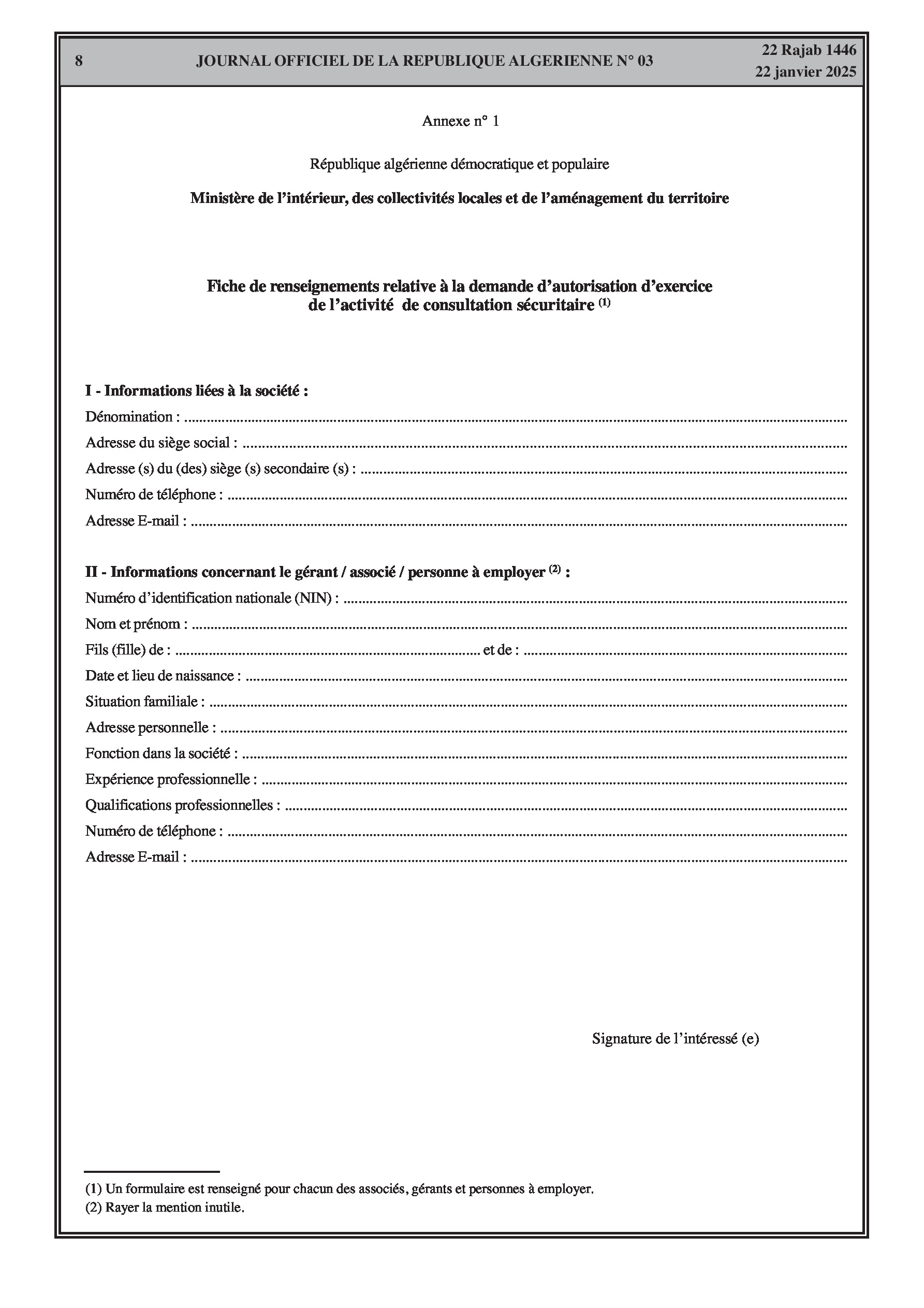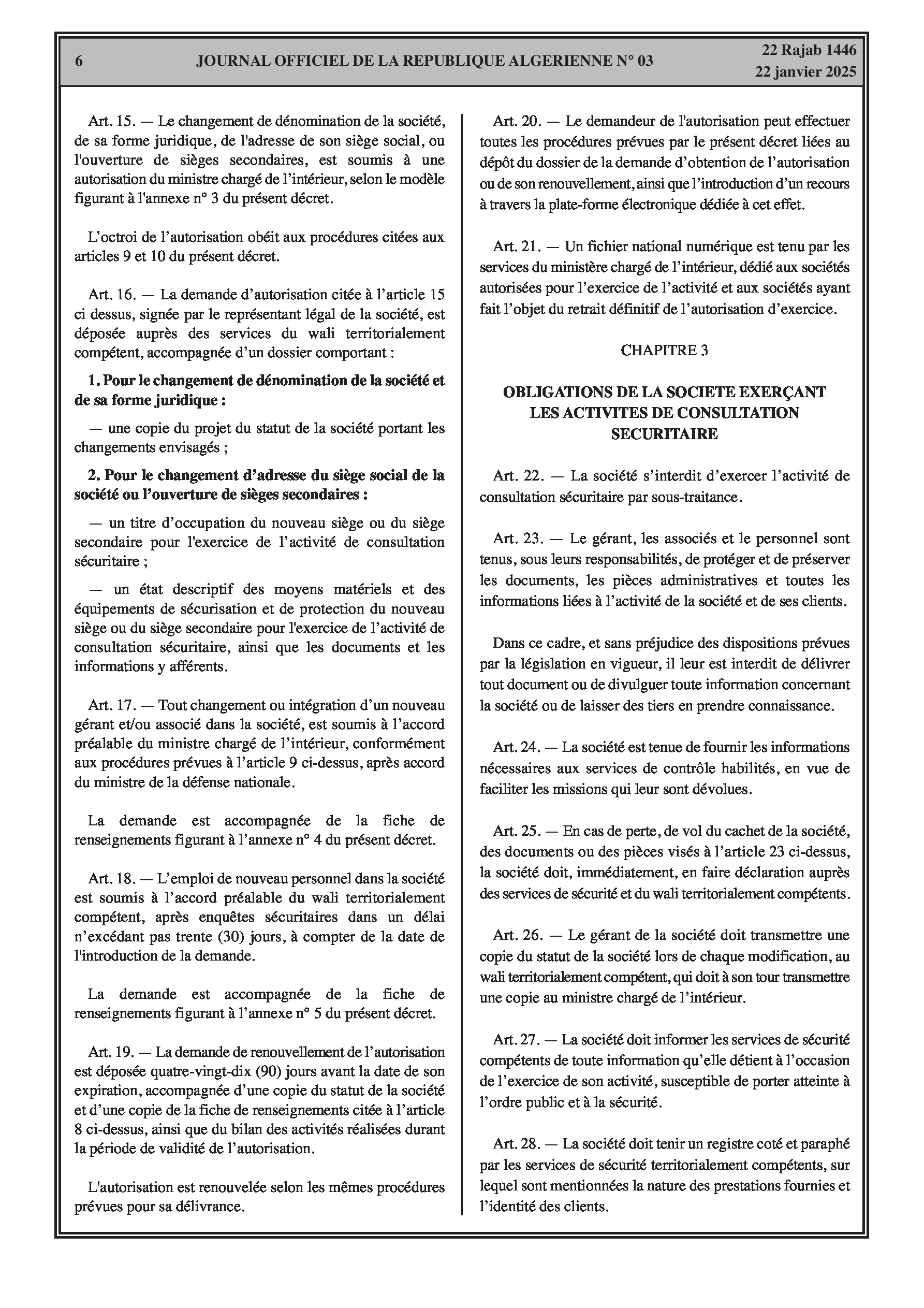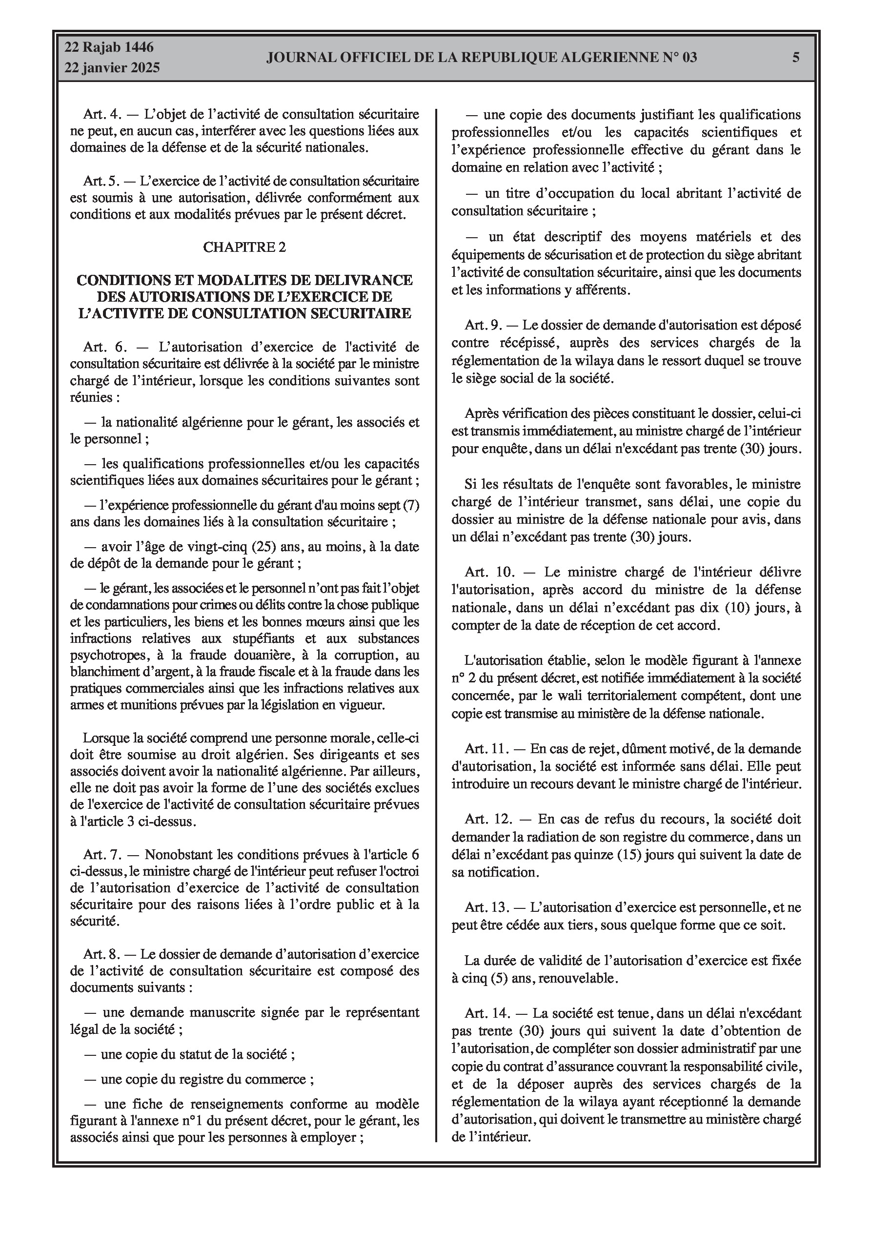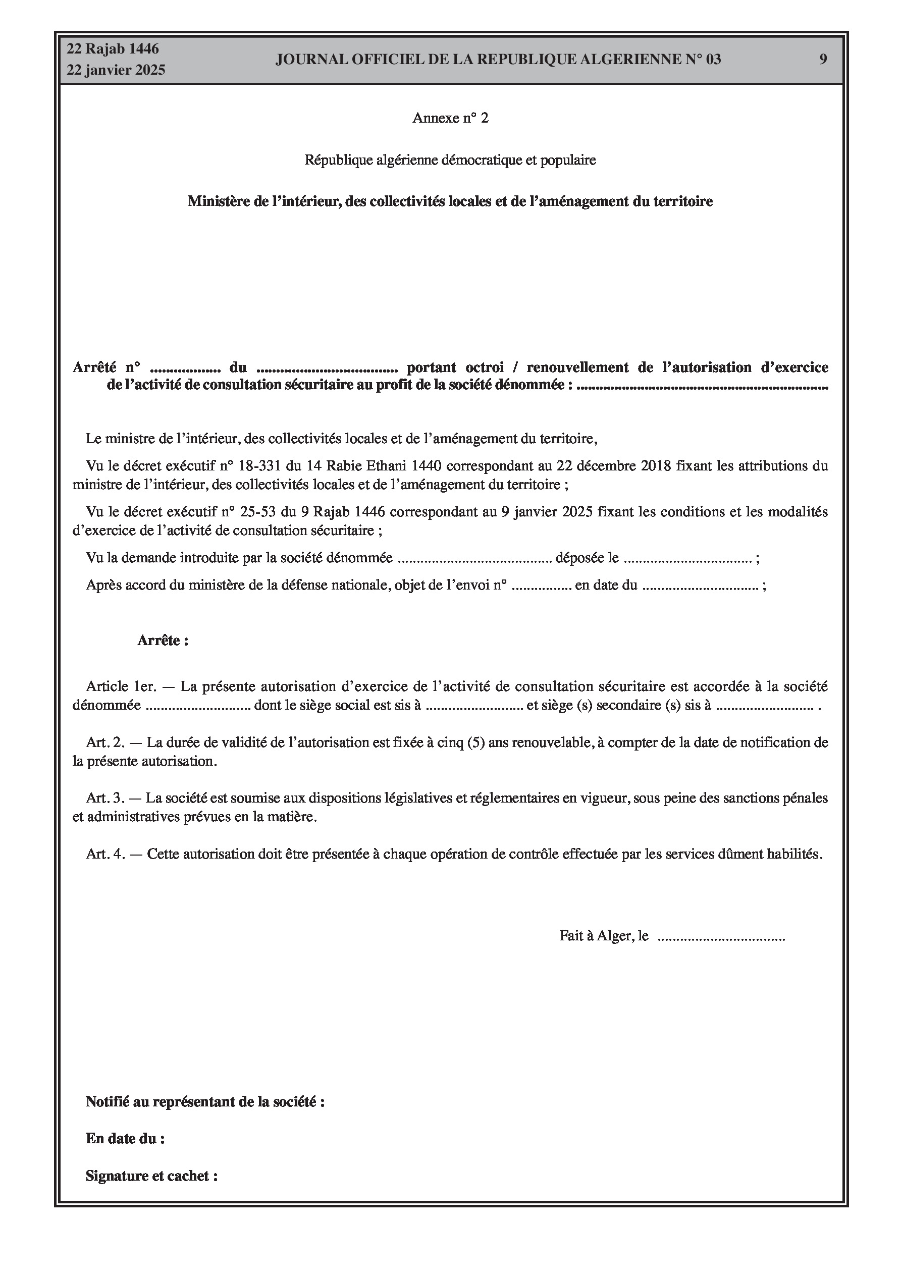 Décret exécutif n° 25-53 fixant les conditions et les modalités d'exercice de l'activité de consultation sécuritaire, y compris les autorisations, obligations et contrôles.