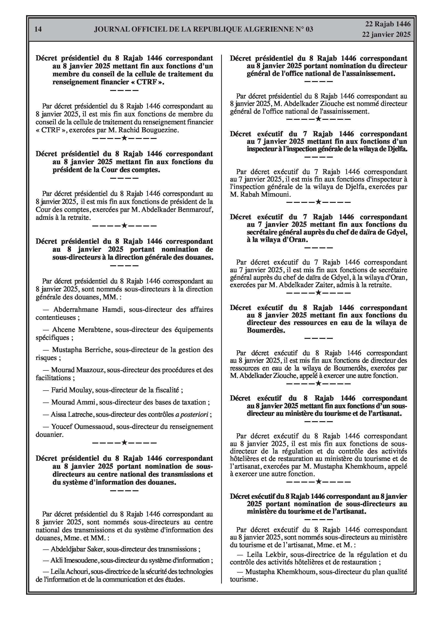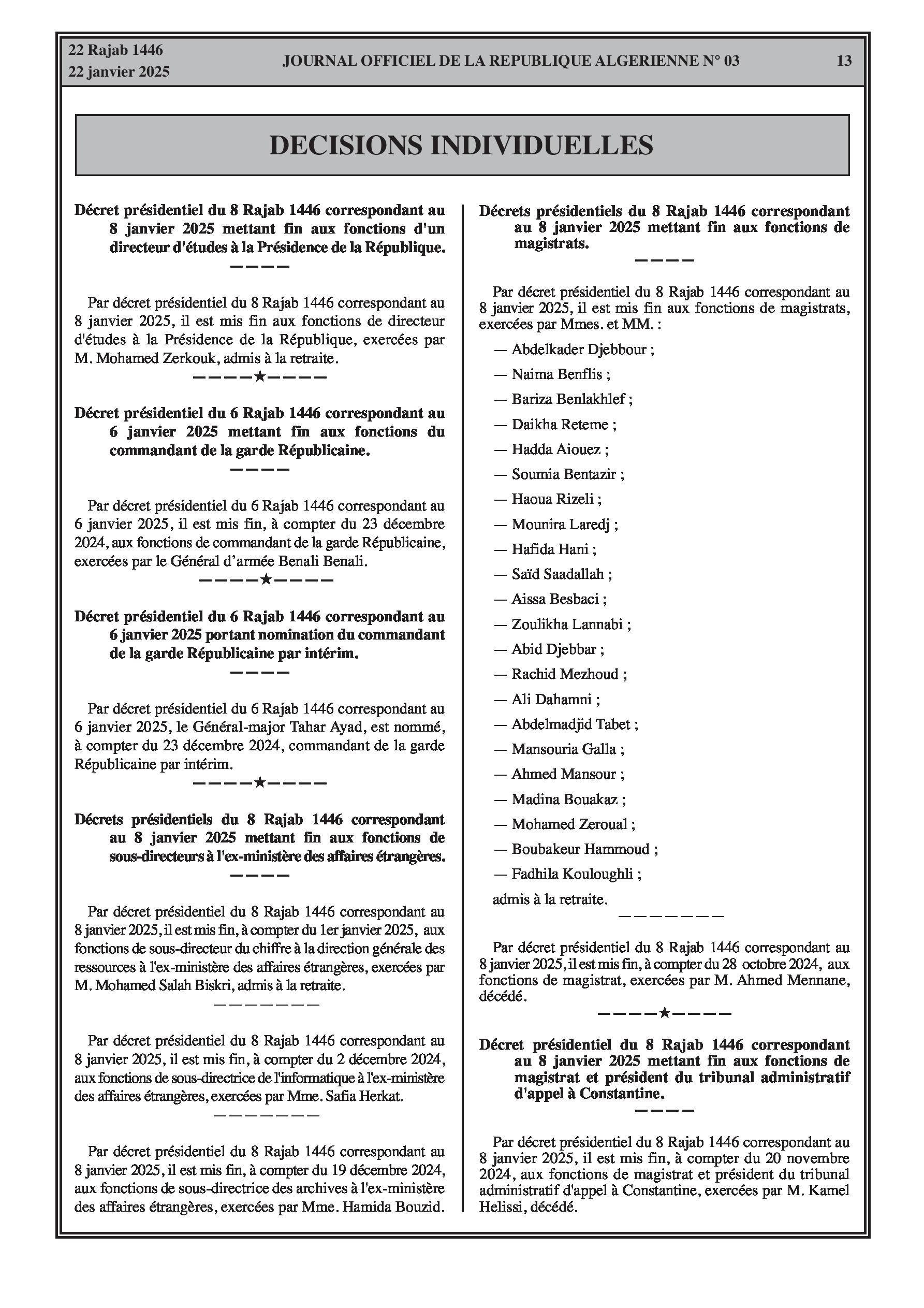 Comprend les fins de fonctions du directeur d'études à la Présidence, du commandant de la Garde Républicaine (et nomination d'un commandant par intérim), de sous-directeurs à l'ex-ministère des Affaires étrangères, de plusieurs magistrats, du président du tribunal administratif d'appel de Constantine, d'un membre du conseil de la CTRF, du président de la Cour des comptes. Inclut aussi des nominations de sous-directeurs à la DGD et au Centre national des transmissions douanières, du DG de l'Office national de l'assainissement. Fins de fonctions d'un inspecteur à la wilaya de Djelfa, du secrétaire général de la daïra de Gdyel (Oran), du directeur des ressources en eau de Boumerdès, d'un sous-directeur au ministère du Tourisme, et nominations de sous-directeurs au ministère du Tourisme.