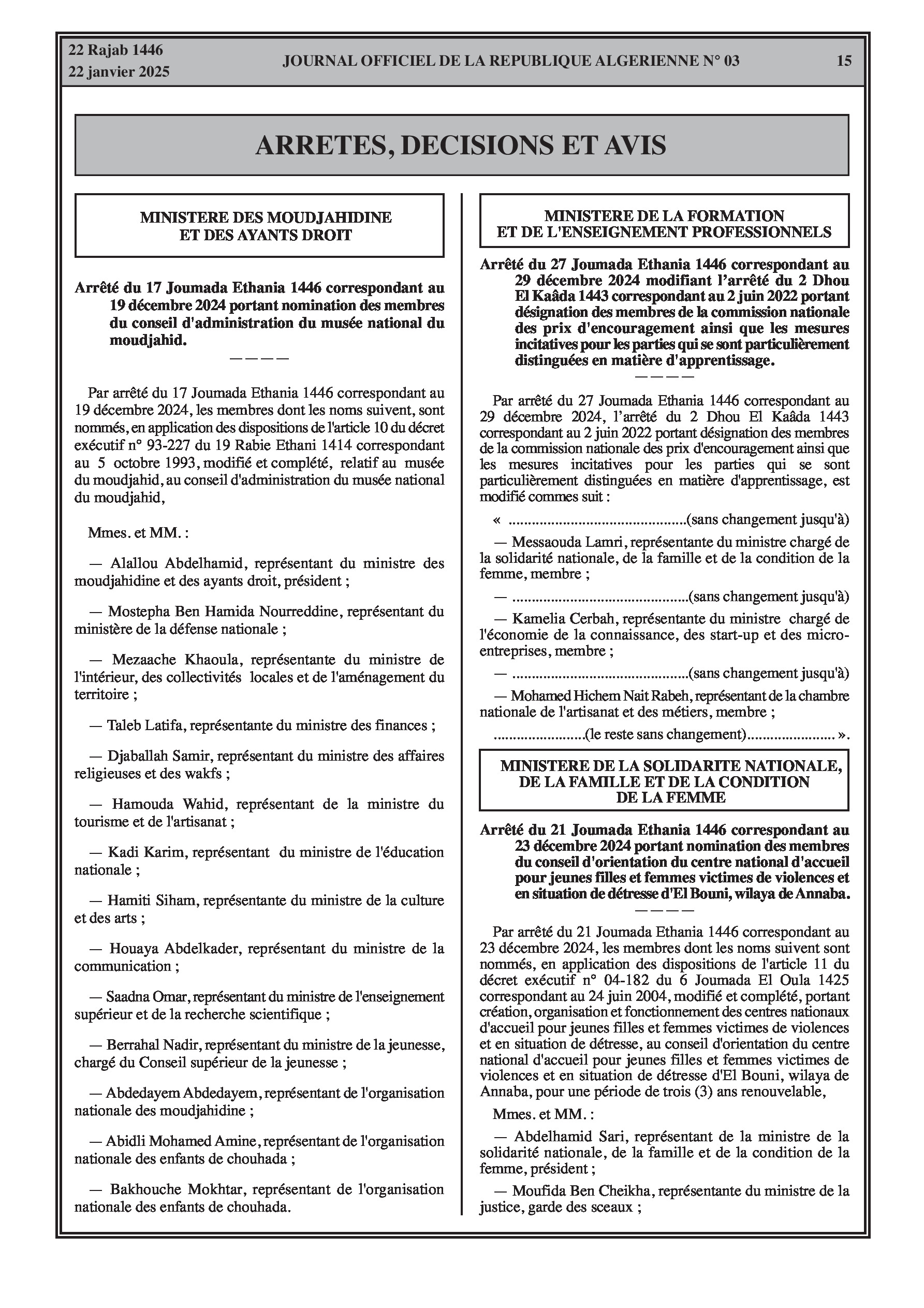 Arrêté ministériel du Ministère des Moudjahidine et des Ayants Droit portant nomination des membres du conseil d'administration du musée national du moudjahid.