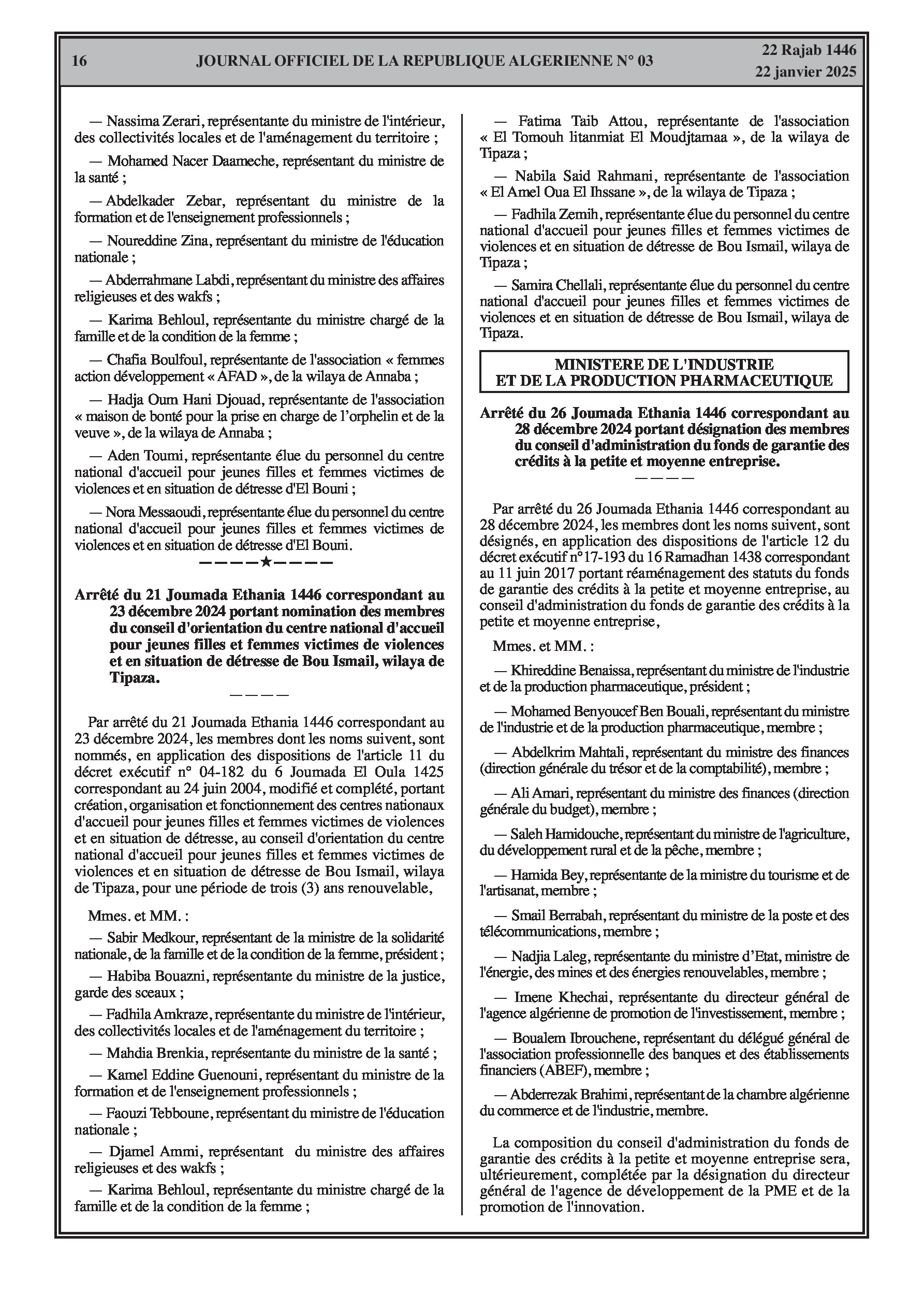 Arrêté ministériel du Ministère de l'Industrie et de la Production Pharmaceutique désignant les membres du conseil d'administration du fonds de garantie des crédits à la petite et moyenne entreprise.