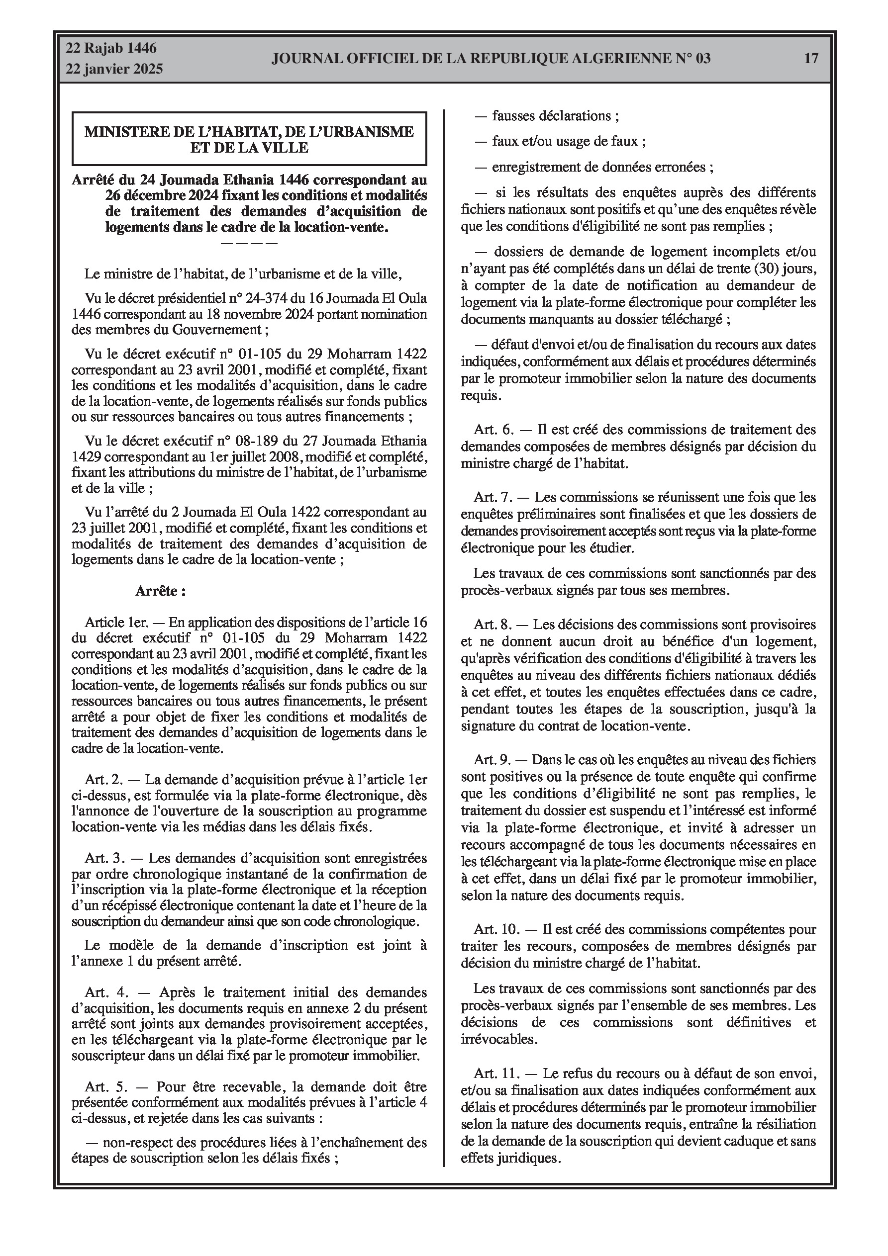 Arrêté ministériel du Ministère de l'Habitat, de l'Urbanisme et de la Ville fixant les nouvelles conditions et modalités de traitement des demandes d'acquisition de logements dans le cadre de la location-vente.