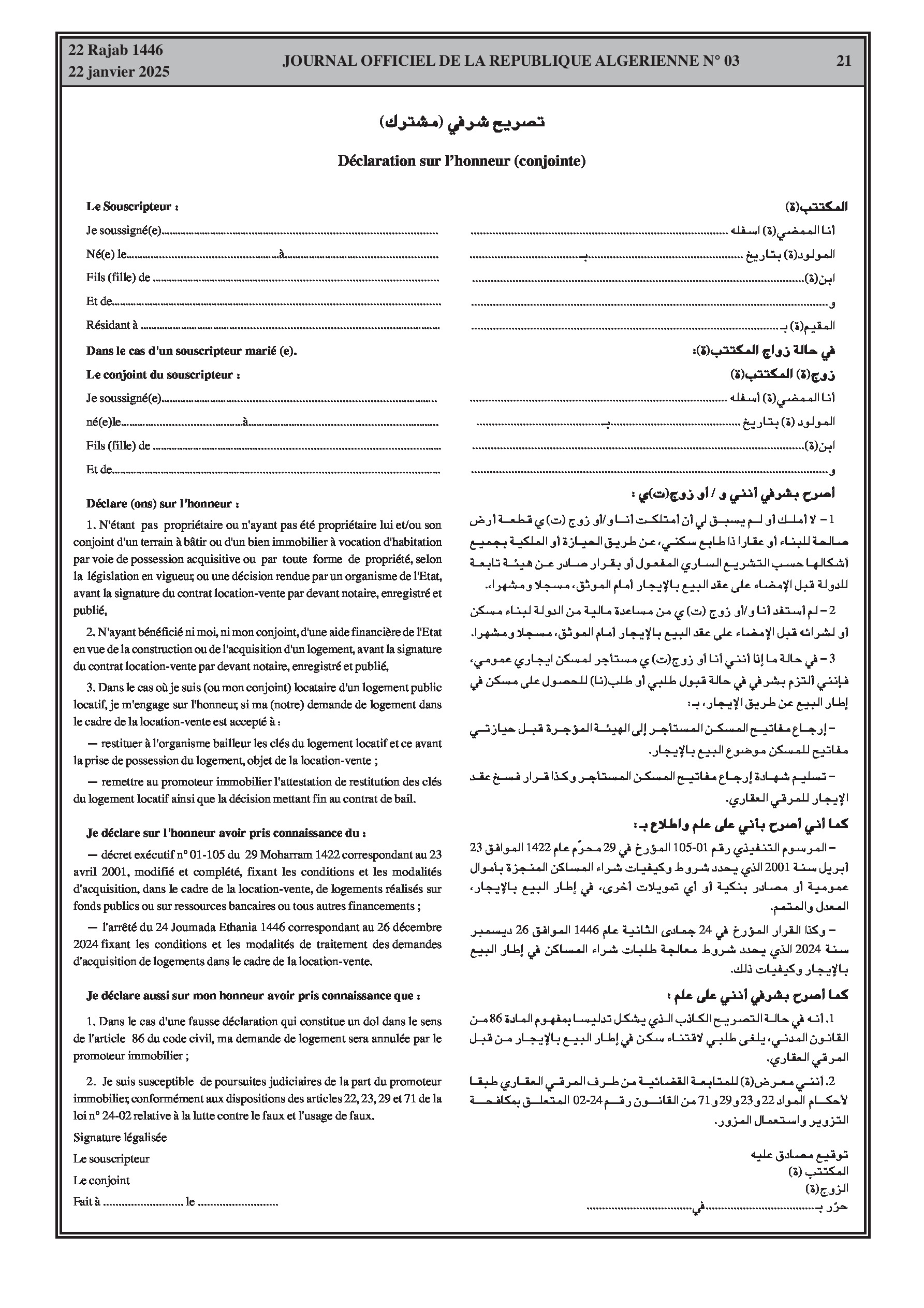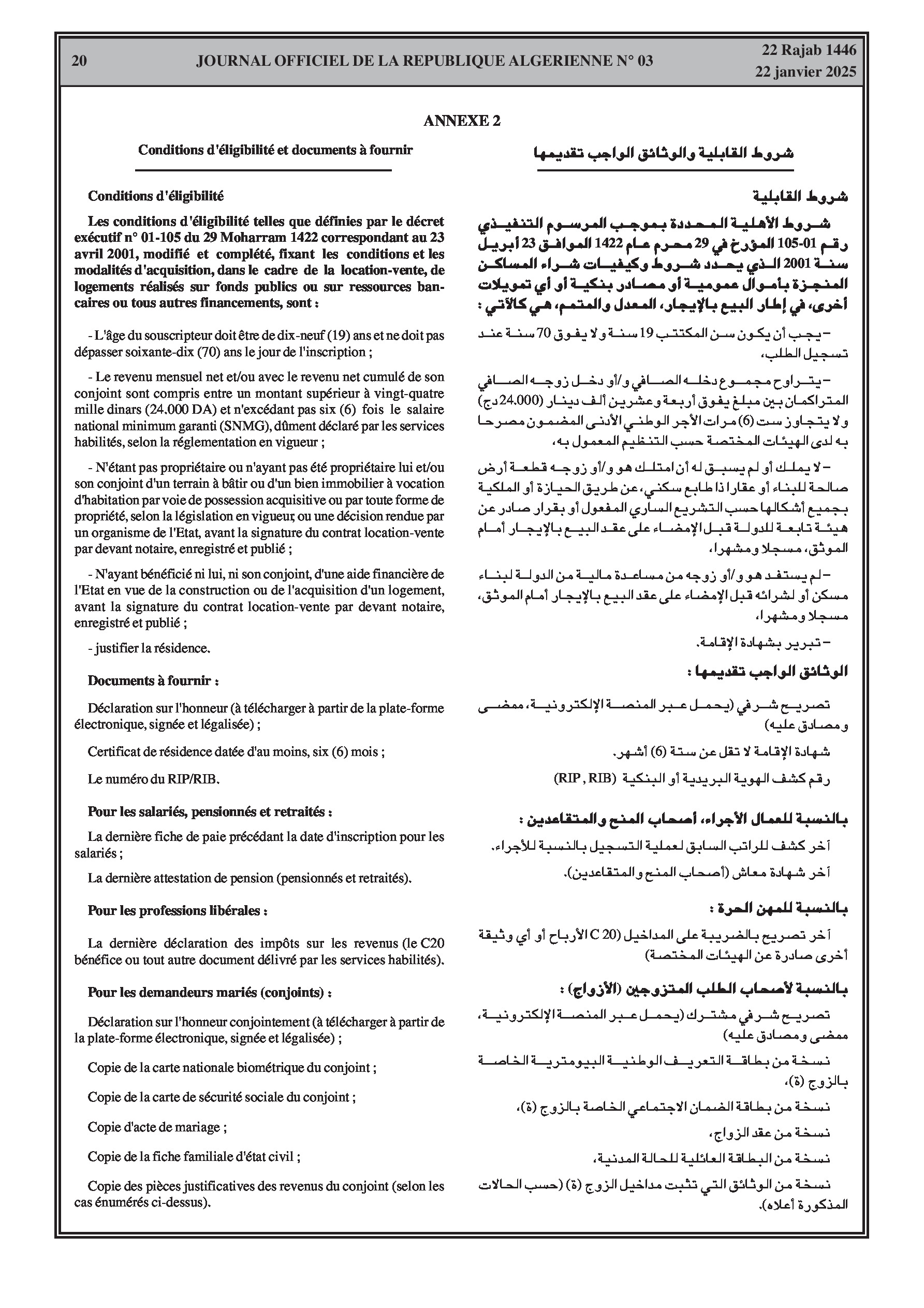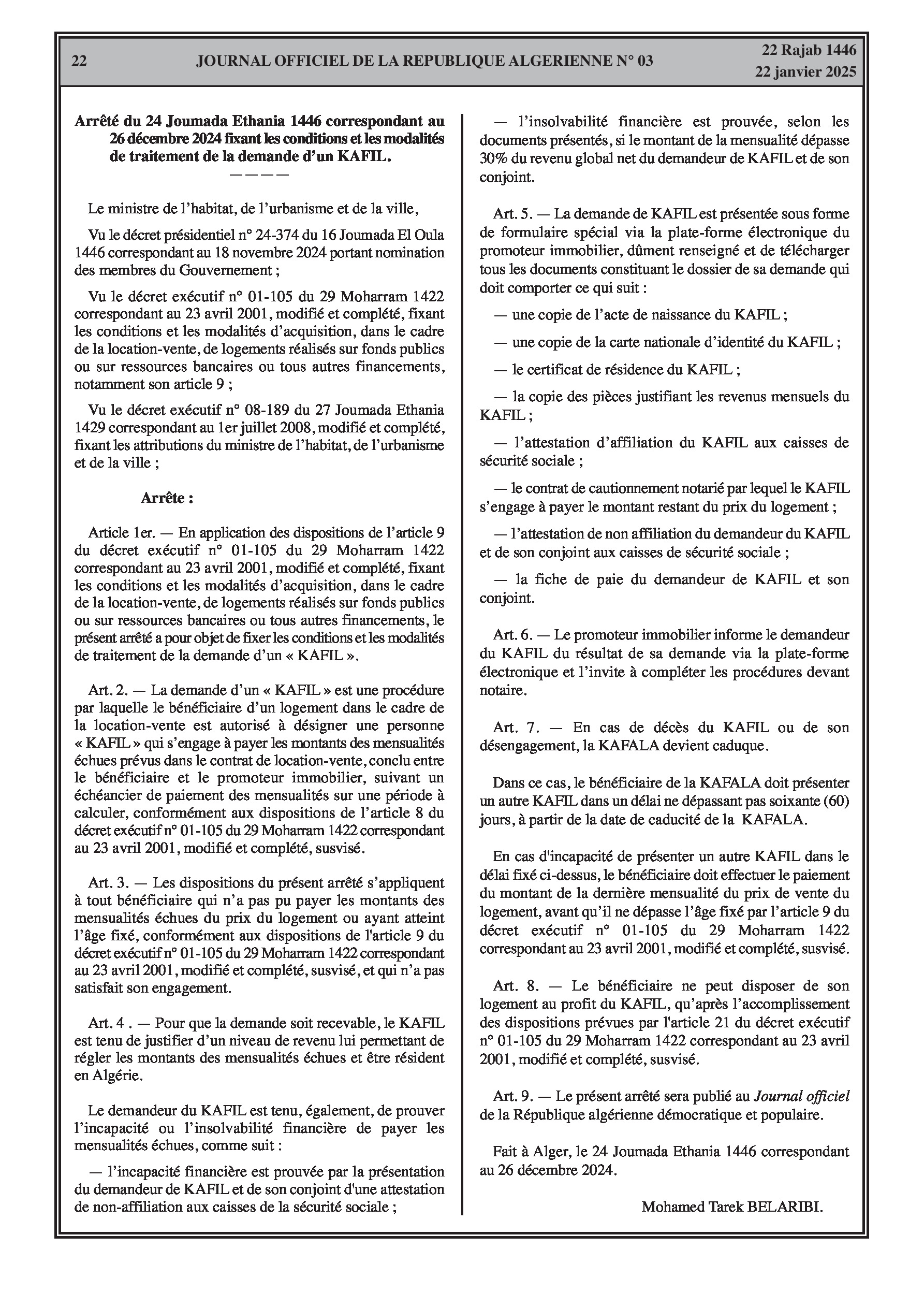 L'arrêté définit les conditions et modalités de traitement de la demande d'un « KAFIL » (garant) pour le paiement des mensualités échues d'un bénéficiaire d'un logement en location-vente prouvant son incapacité ou son insolvabilité financière. Le KAFIL doit justifier d'un revenu suffisant et résider en Algérie. La demande est présentée via la plateforme électronique du promoteur immobilier.
