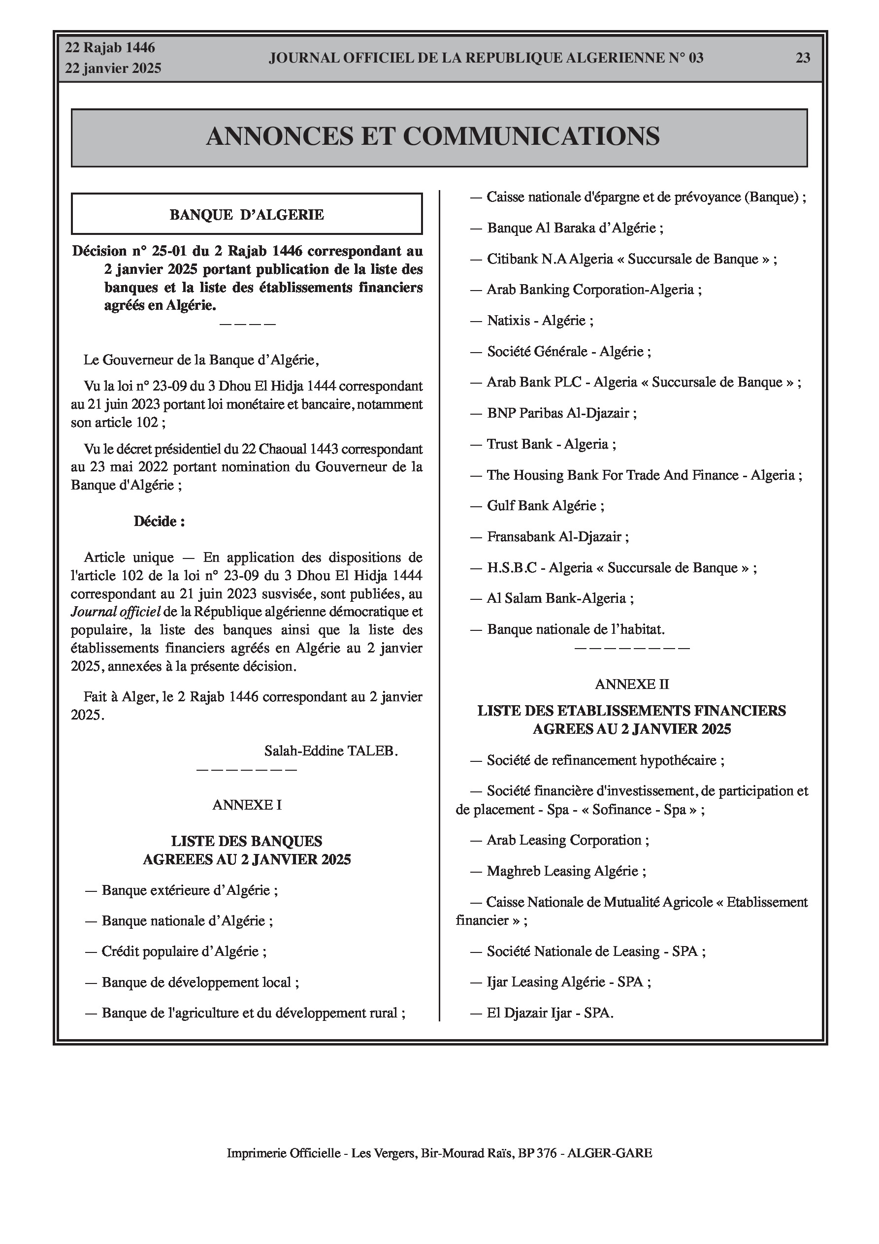 Décision n° 25-01 du Gouverneur de la Banque d'Algérie portant publication de la liste des banques et établissements financiers agréés en Algérie au 2 janvier 2025.