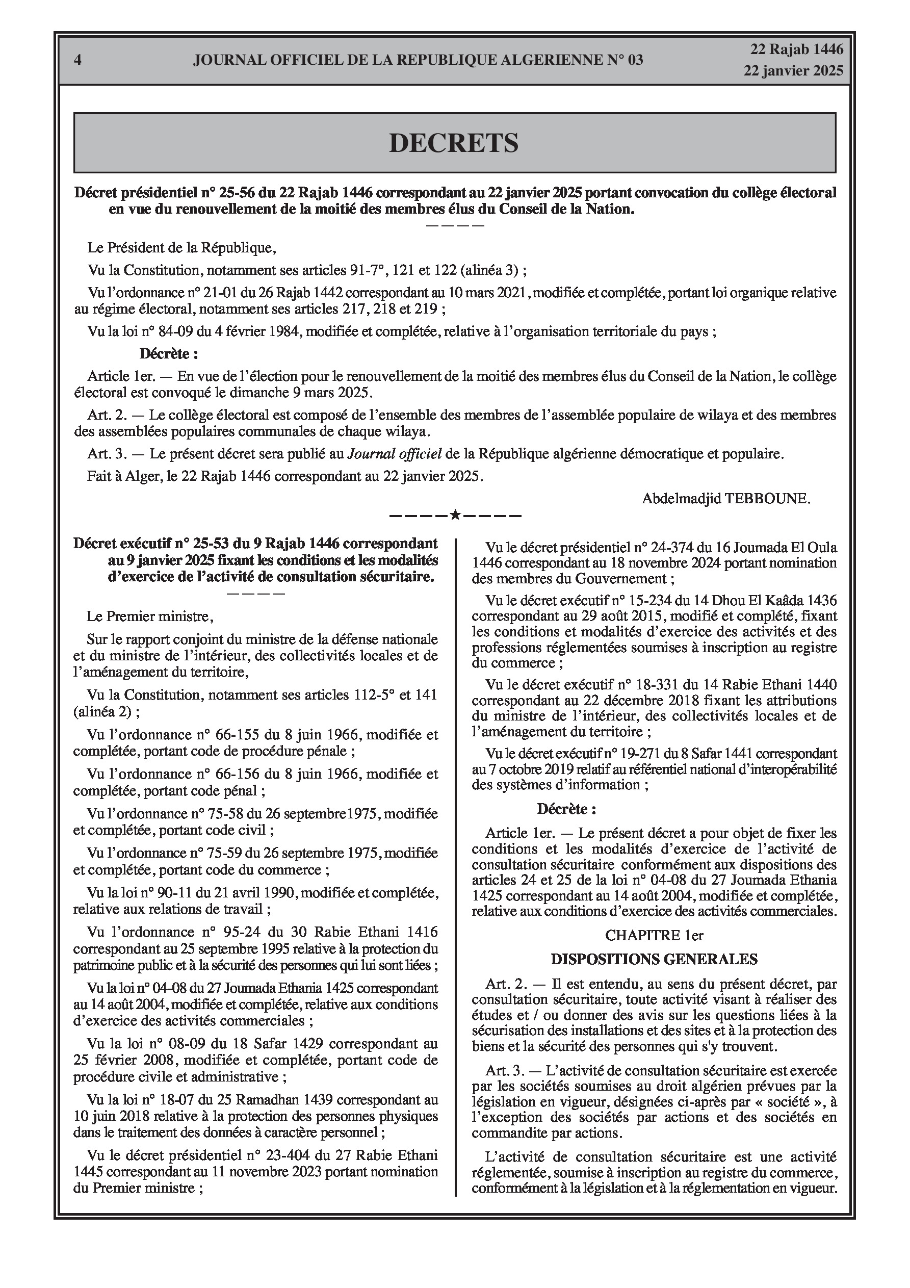 Décret présidentiel n° 25-56 convoquant le collège électoral le dimanche 9 mars 2025 en vue du renouvellement de la moitié des membres élus du Conseil de la Nation.