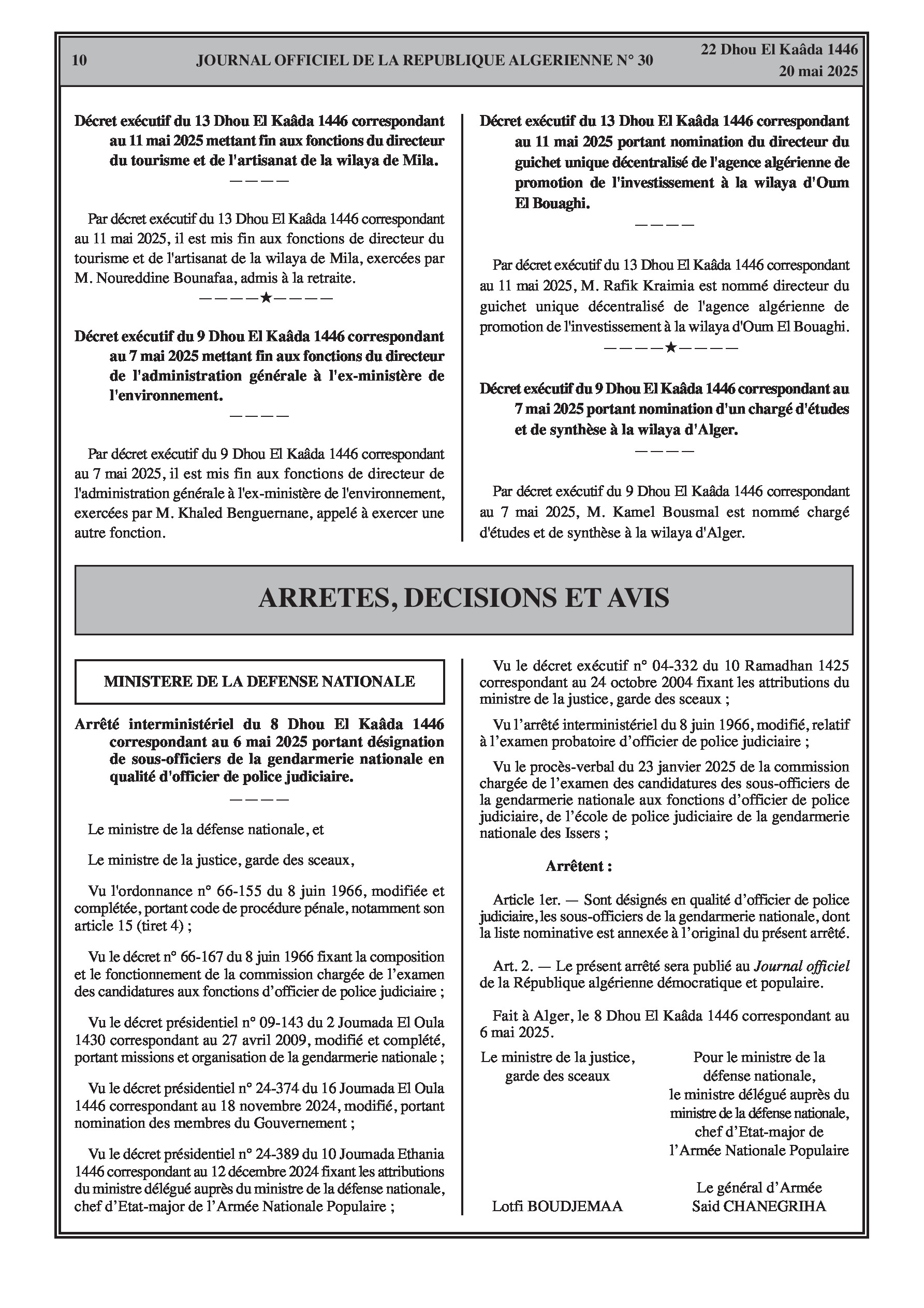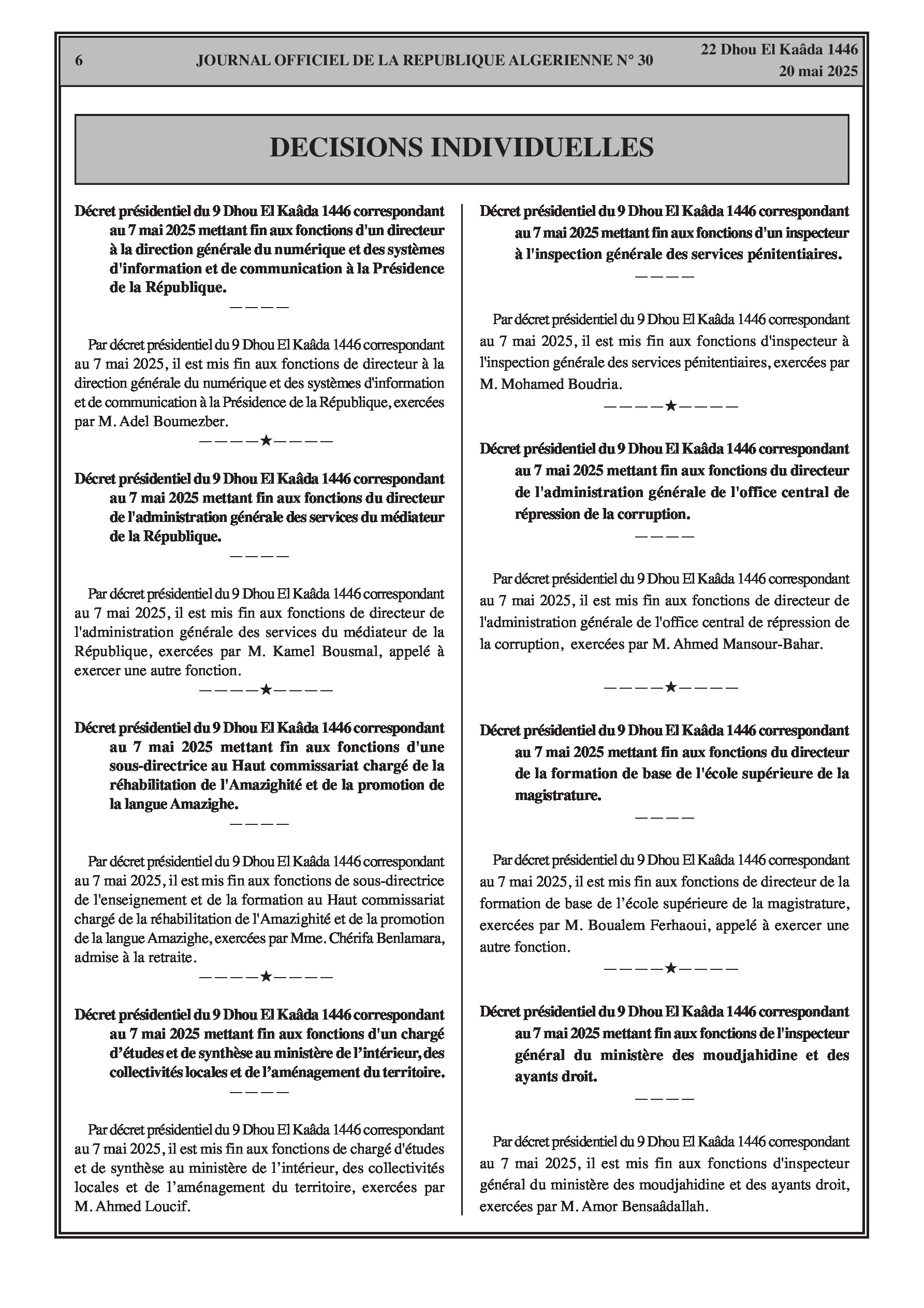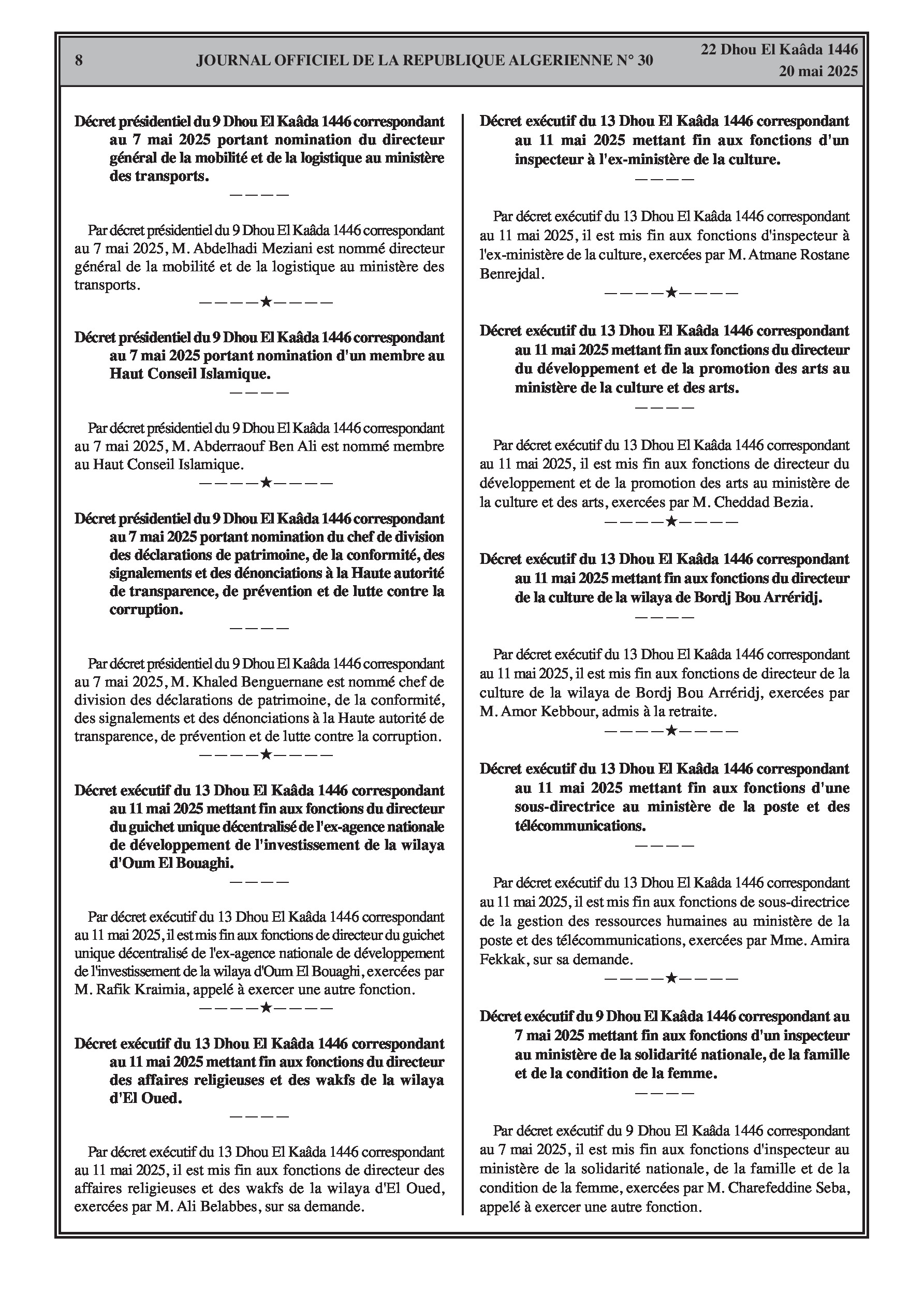 - Fins de fonctions et nominations dans les ministères (Intérieur, Justice, Moudjahidine, Solidarité, Habitat, Ressources en eau, Transports, Culture, Poste, Environnement, Investissement).