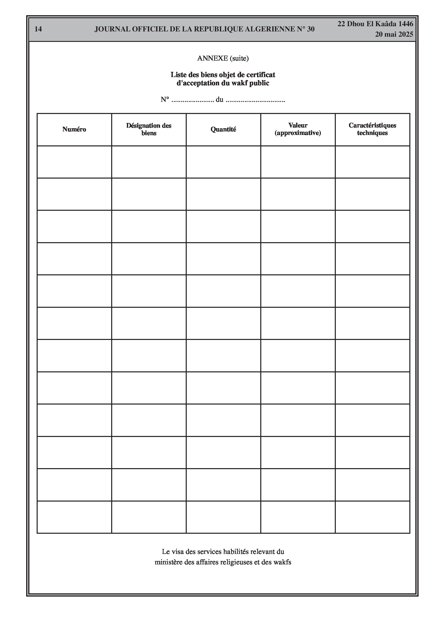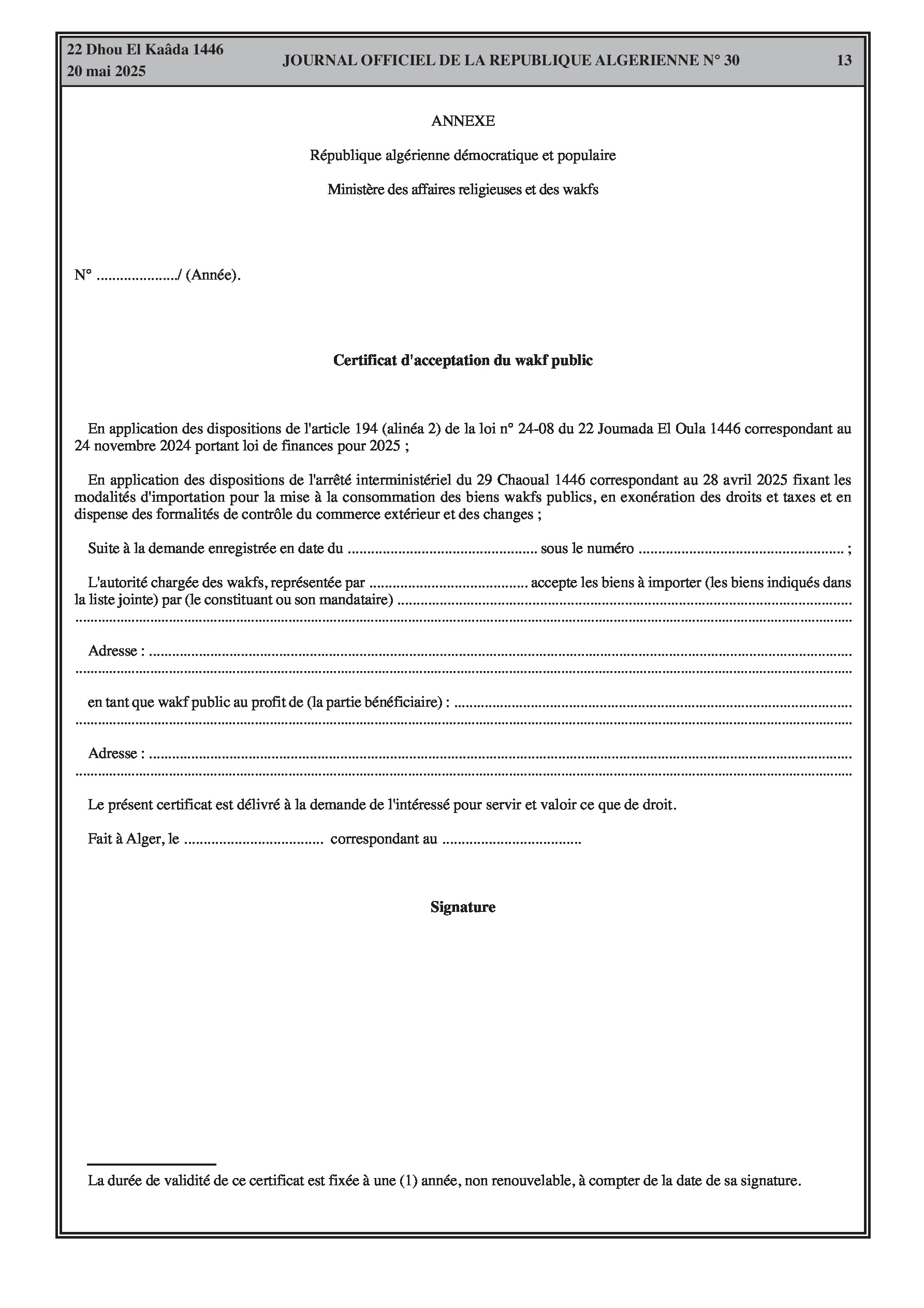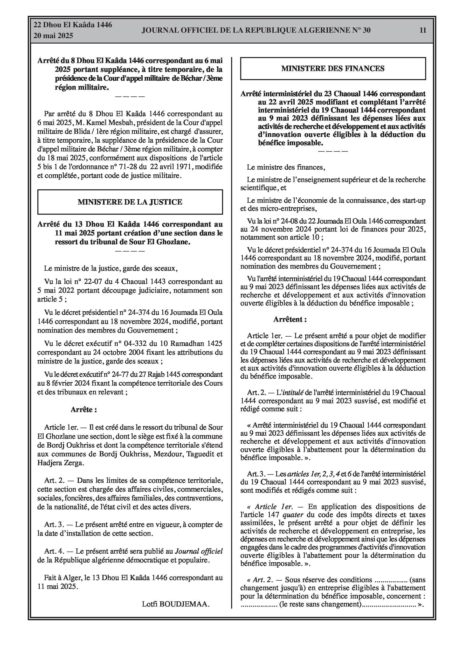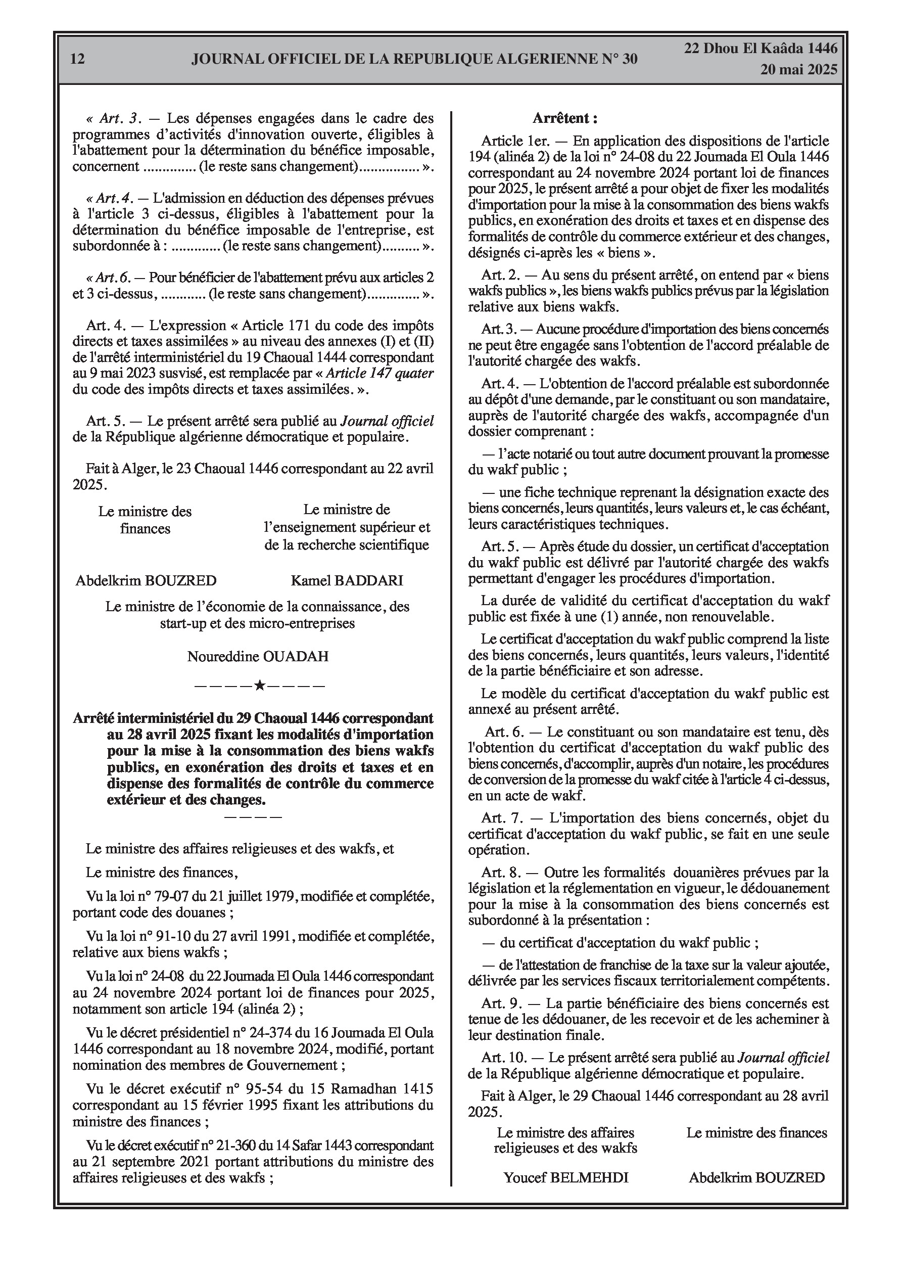 - Finances : Modification de l'arrêté définissant les dépenses de R&D et d'innovation éligibles à la déduction fiscale ; fixation des modalités d'importation des biens wakfs publics avec exonération des droits et taxes.