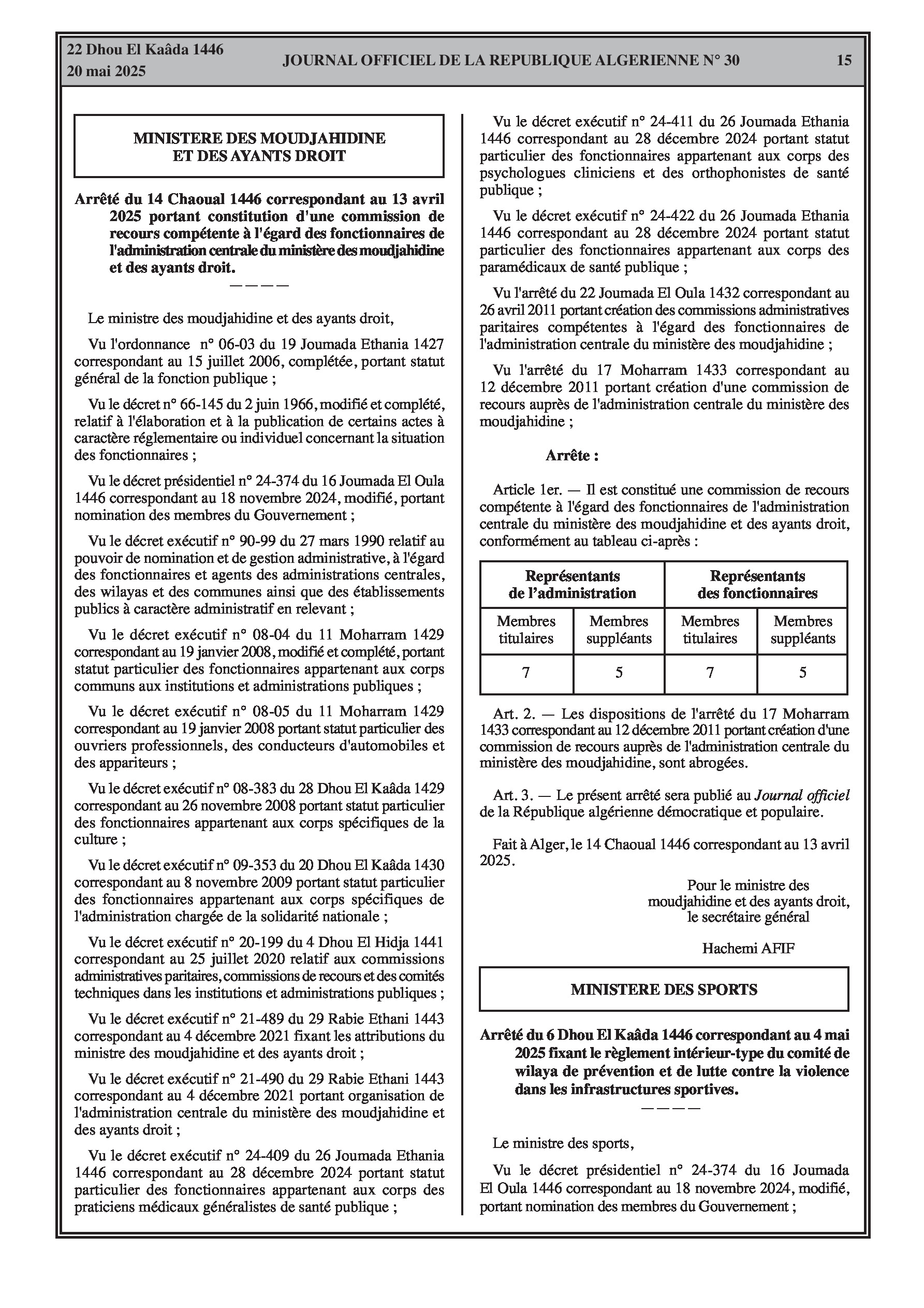 - Moudjahidine : Constitution d'une commission de recours pour les fonctionnaires.