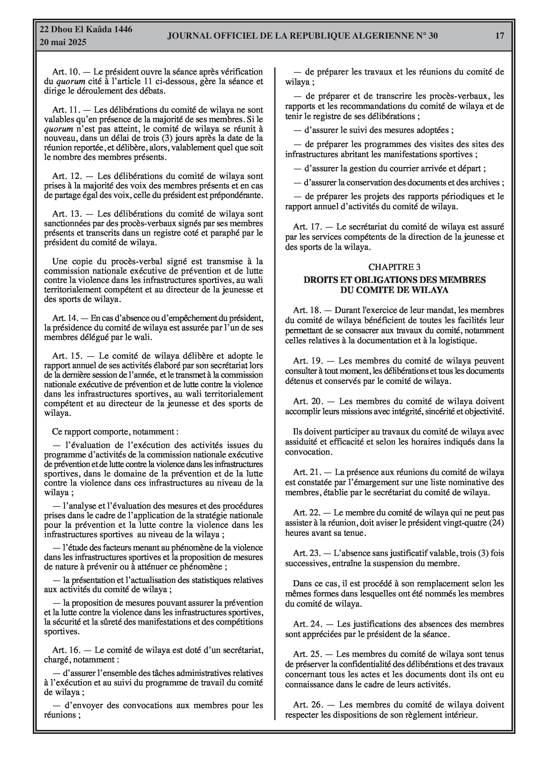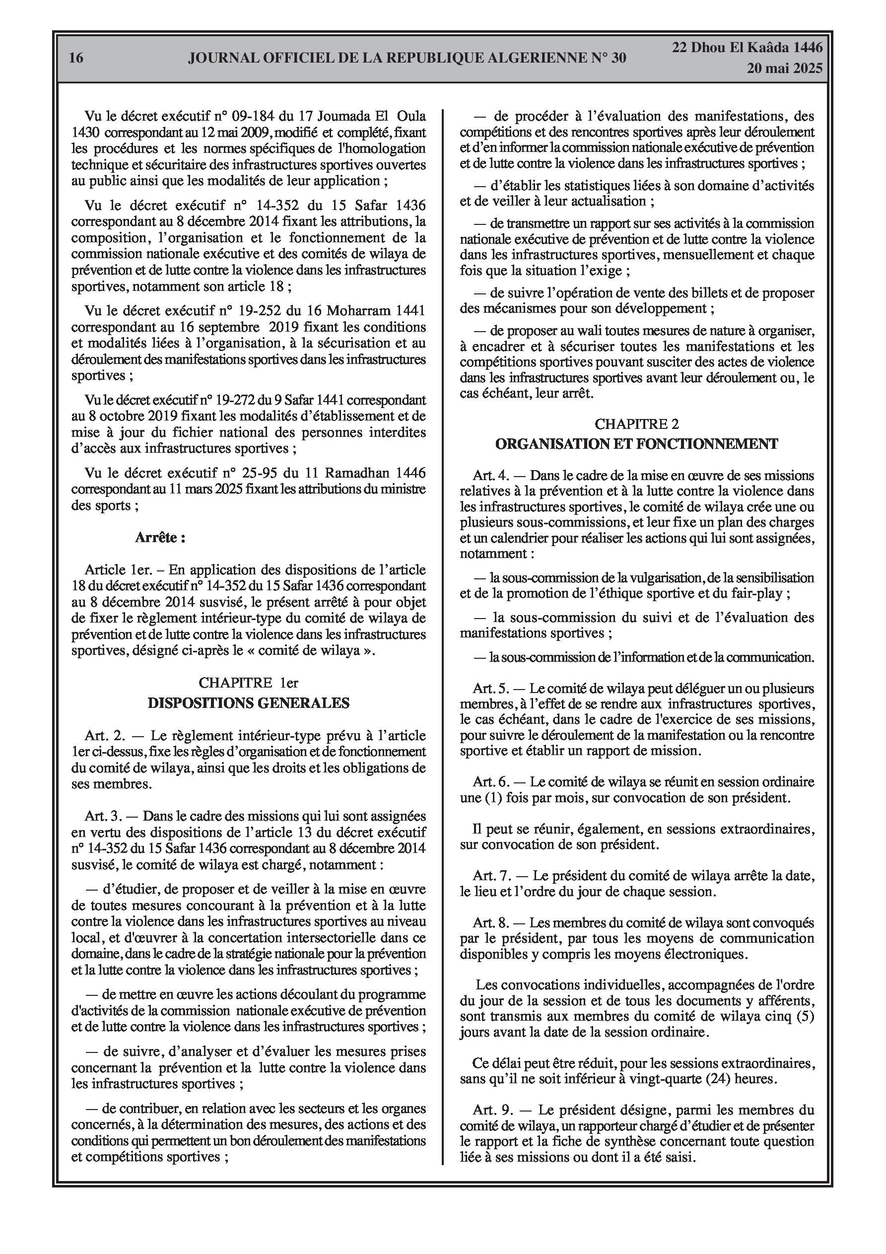 - Sports : Fixation du règlement intérieur-type du comité de wilaya de prévention contre la violence dans les infrastructures sportives.