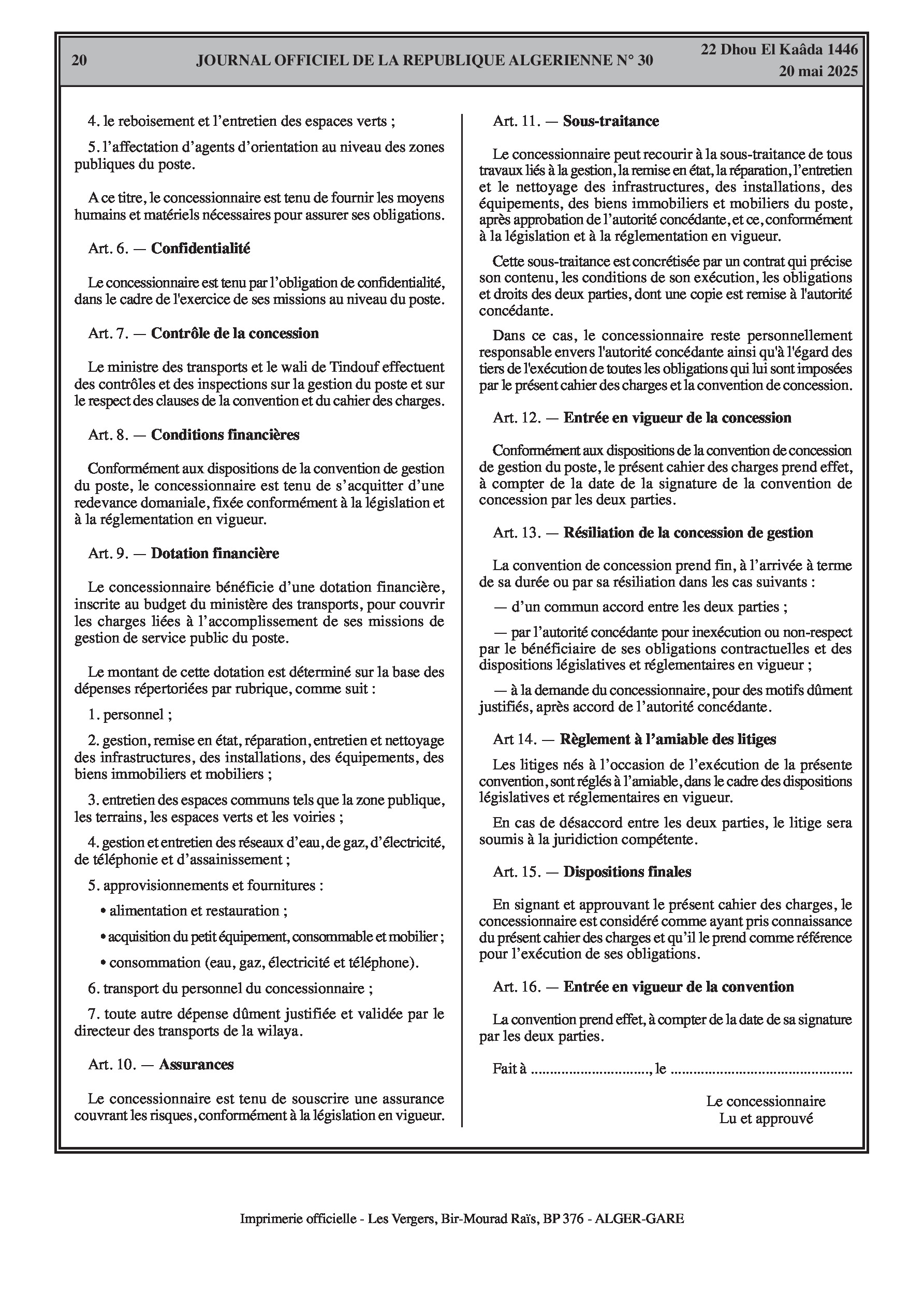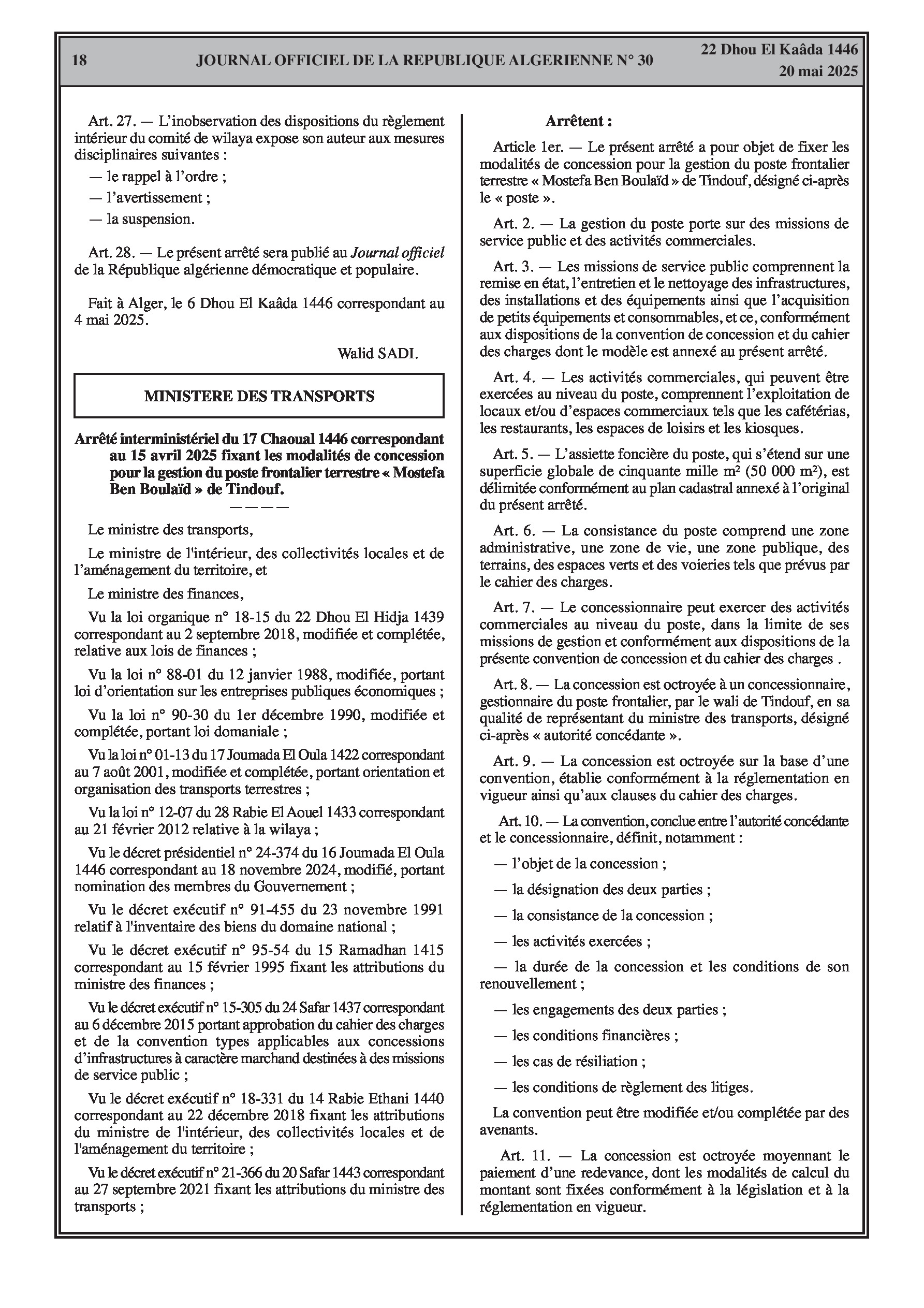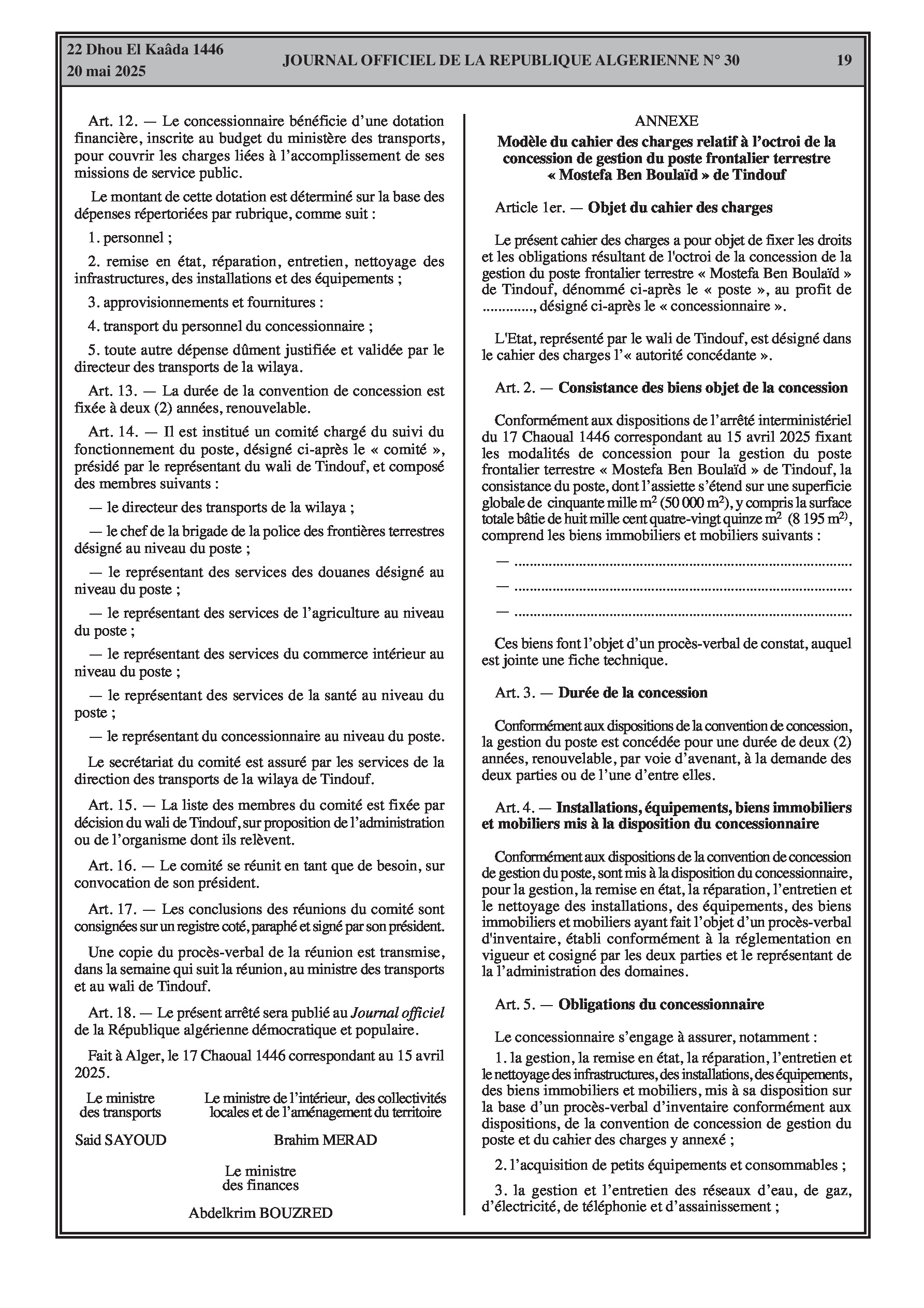 - Transports : Fixation des modalités de concession pour la gestion du poste frontalier terrestre « Mostefa Ben Boulaïd » à Tindouf.