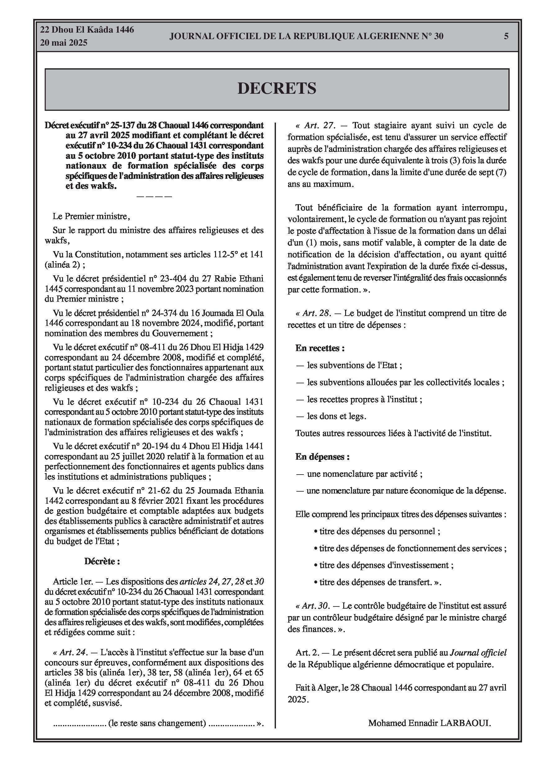 Décret exécutif modifiant et complétant les conditions d'accès à l'institut de formation des imams, les obligations des diplômés, et le budget de l'institut.