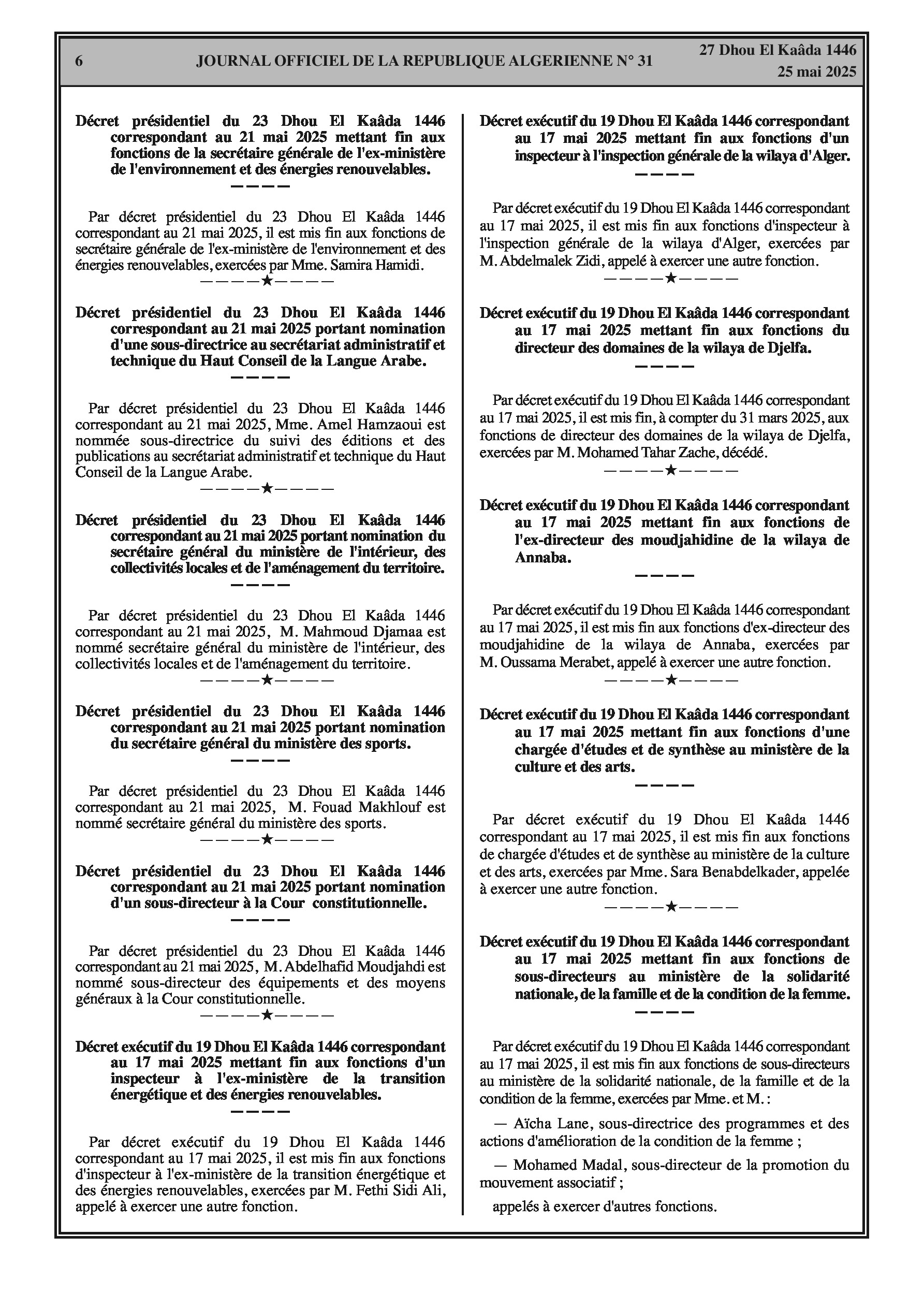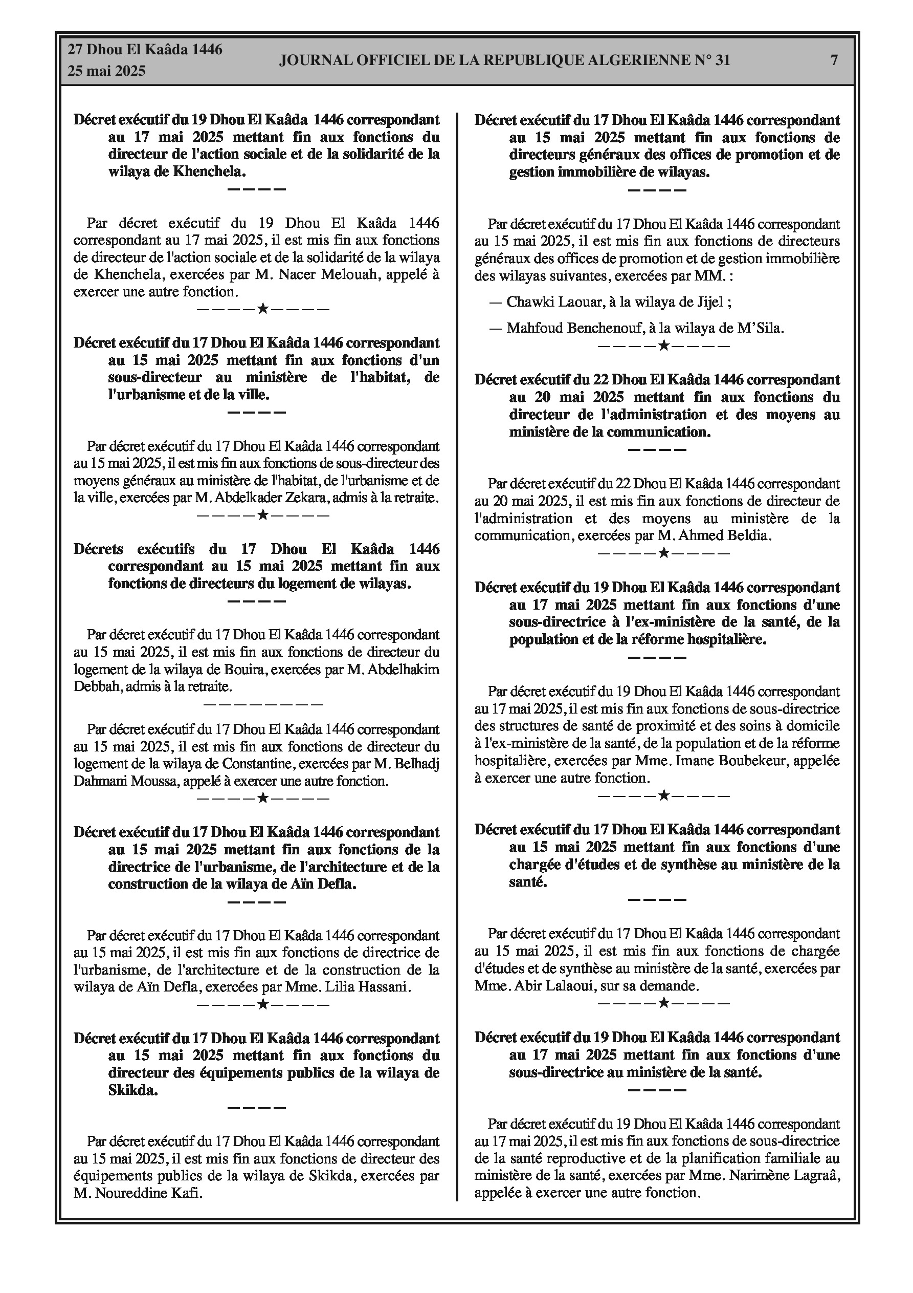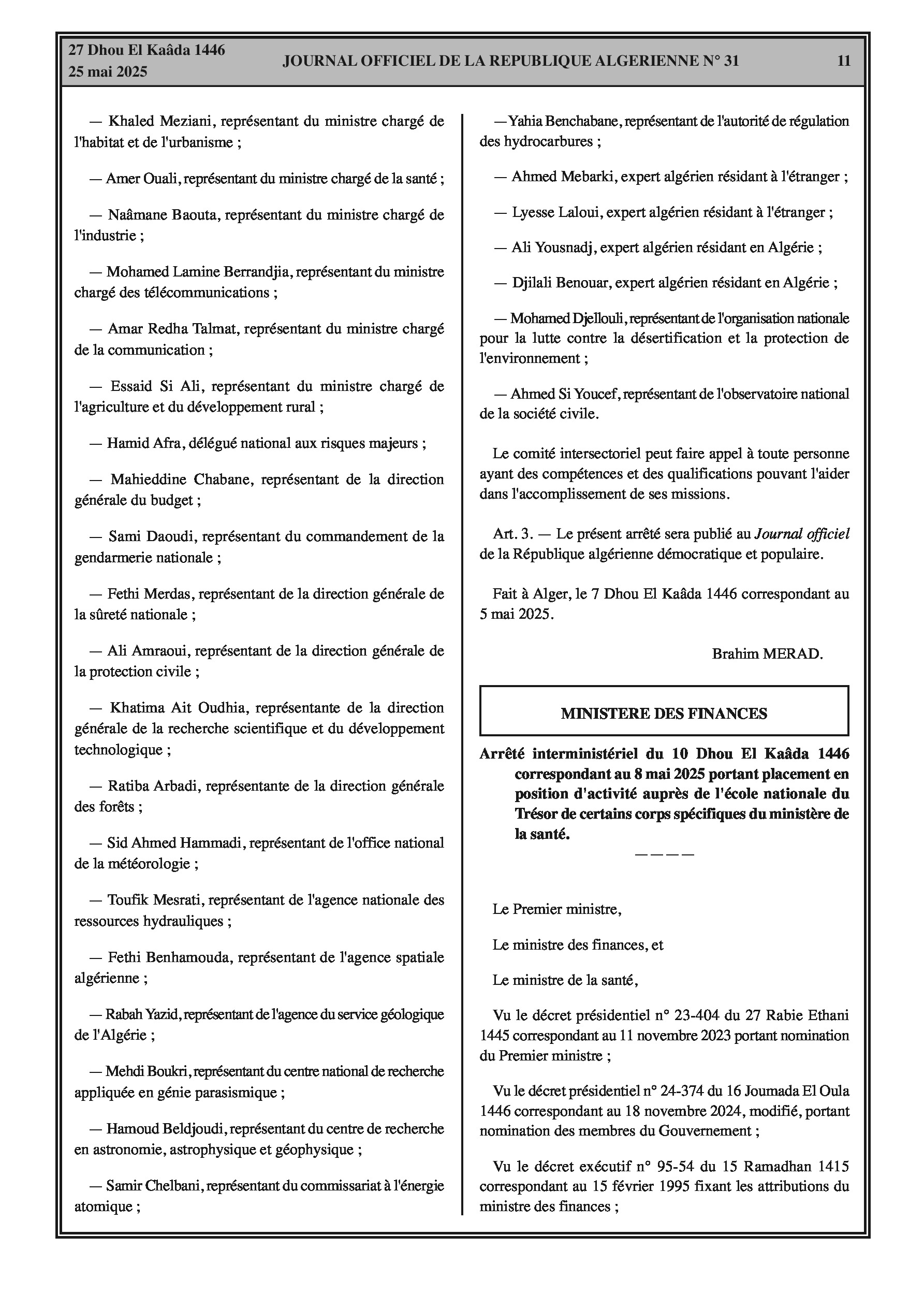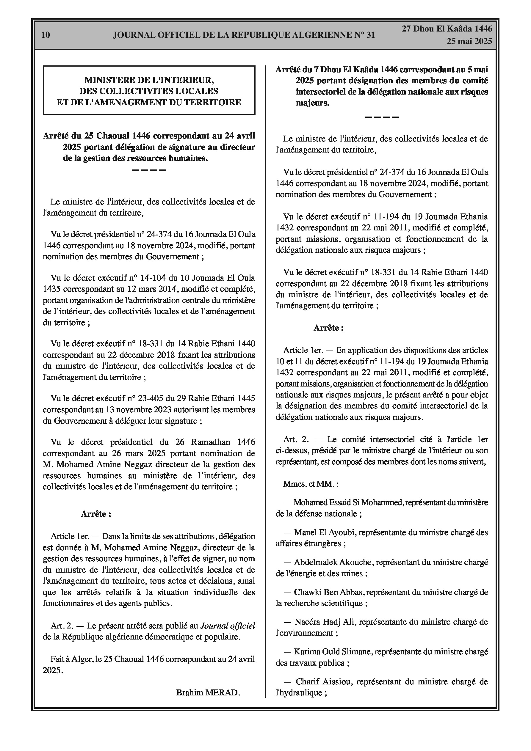 Arrêté du 25 Chaoual 1446 correspondant au 24 avril 2025 portant délégation de signature au directeur de la gestion des ressources humaines. Arrêté du 7 Dhou El Kaâda 1446 correspondant au 5 mai 2025 portant désignation des membres du comité intersectoriel de la délégation nationale aux risques majeurs.