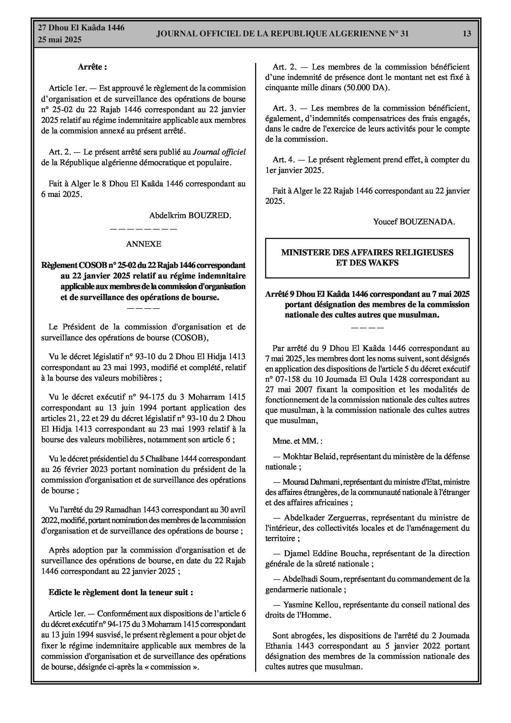 Arrêté du 9 Dhou El Kaâda 1446 correspondant au 7 mai 2025 portant désignation des membres de la commission nationale des cultes autres que musulman.