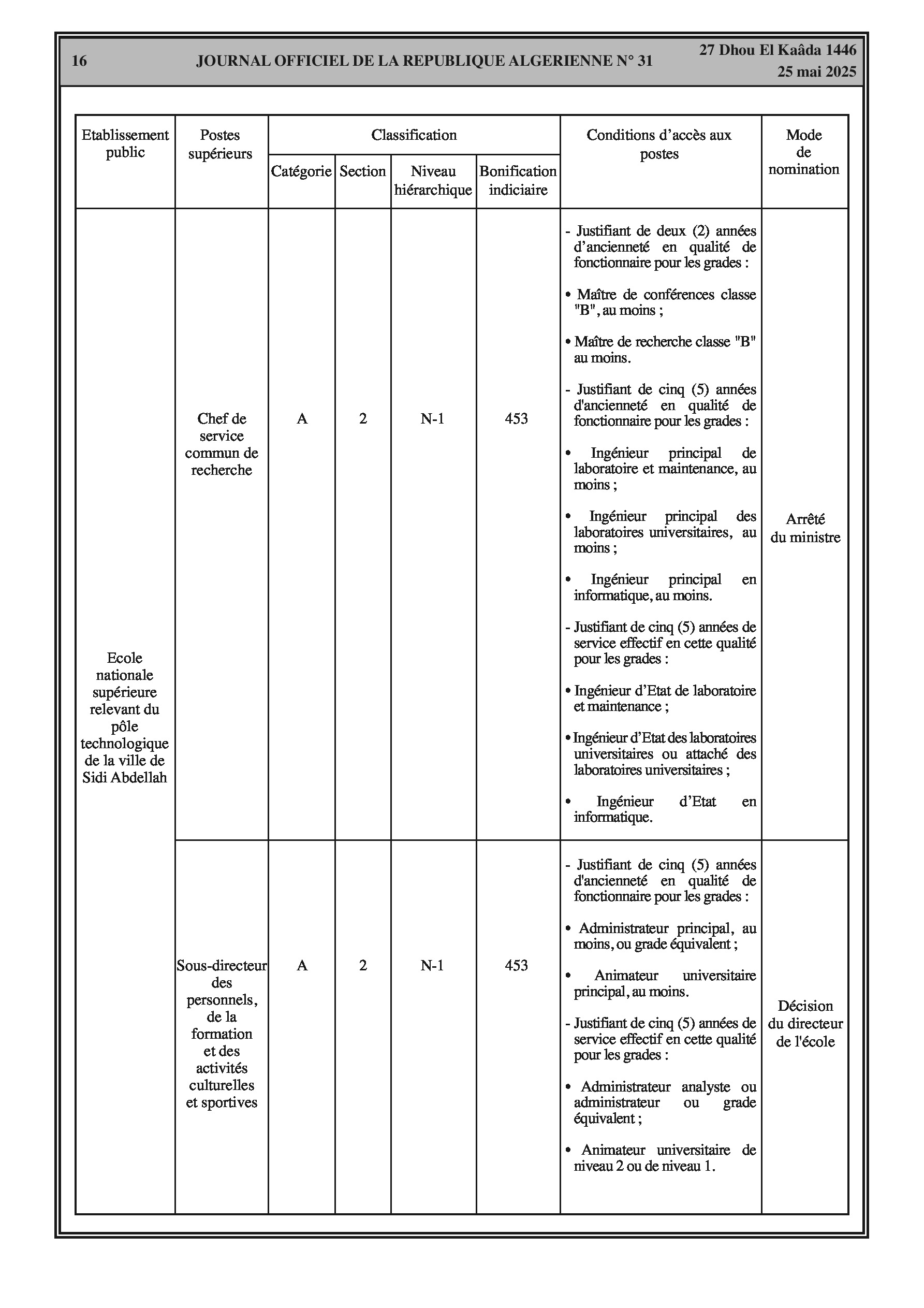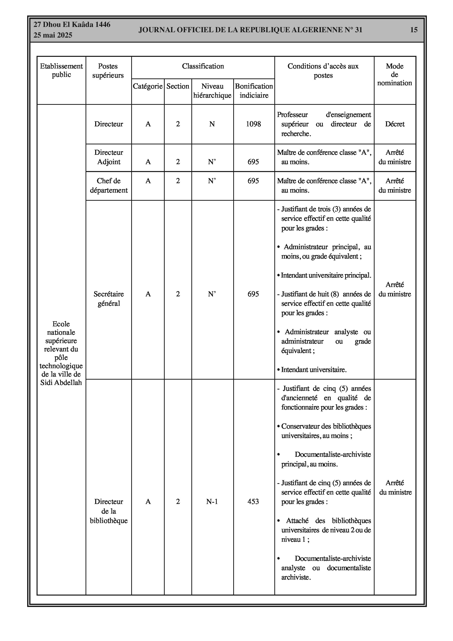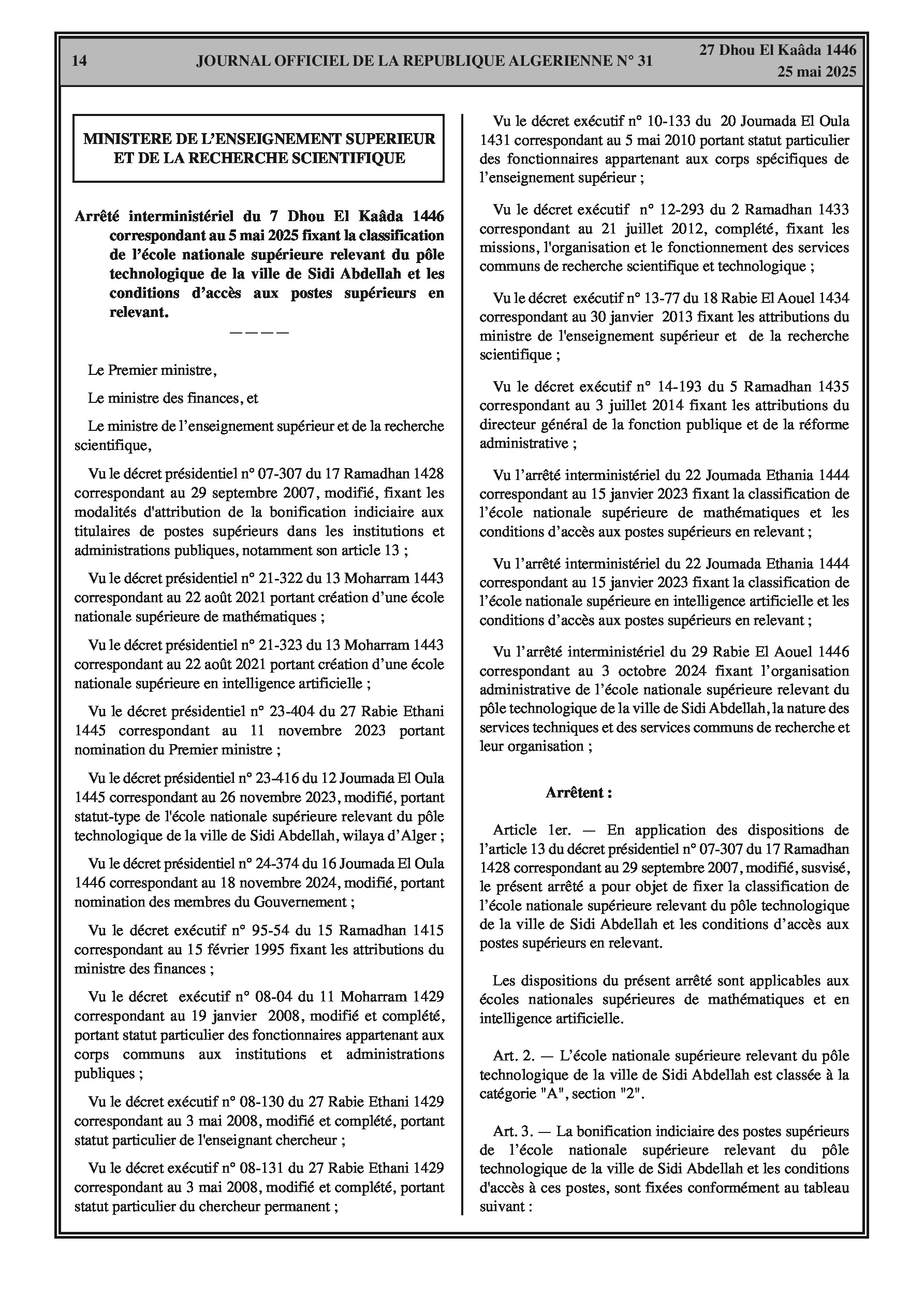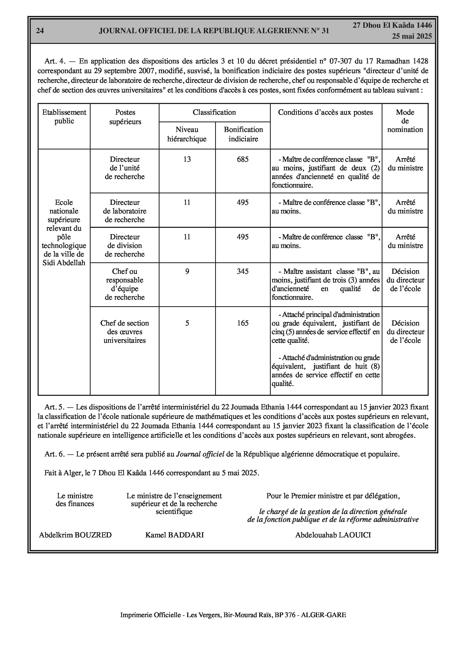 Arrêté interministériel du 7 Dhou El Kaâda 1446 correspondant au 5 mai 2025 fixant la classification de l'école nationale supérieure relevant du pôle technologique de la ville de Sidi Abdellah et les conditions d'accès aux postes supérieurs en relevant. Comprend des tableaux détaillés sur la classification, les conditions d'accès et la bonification indiciaire des postes supérieurs.
