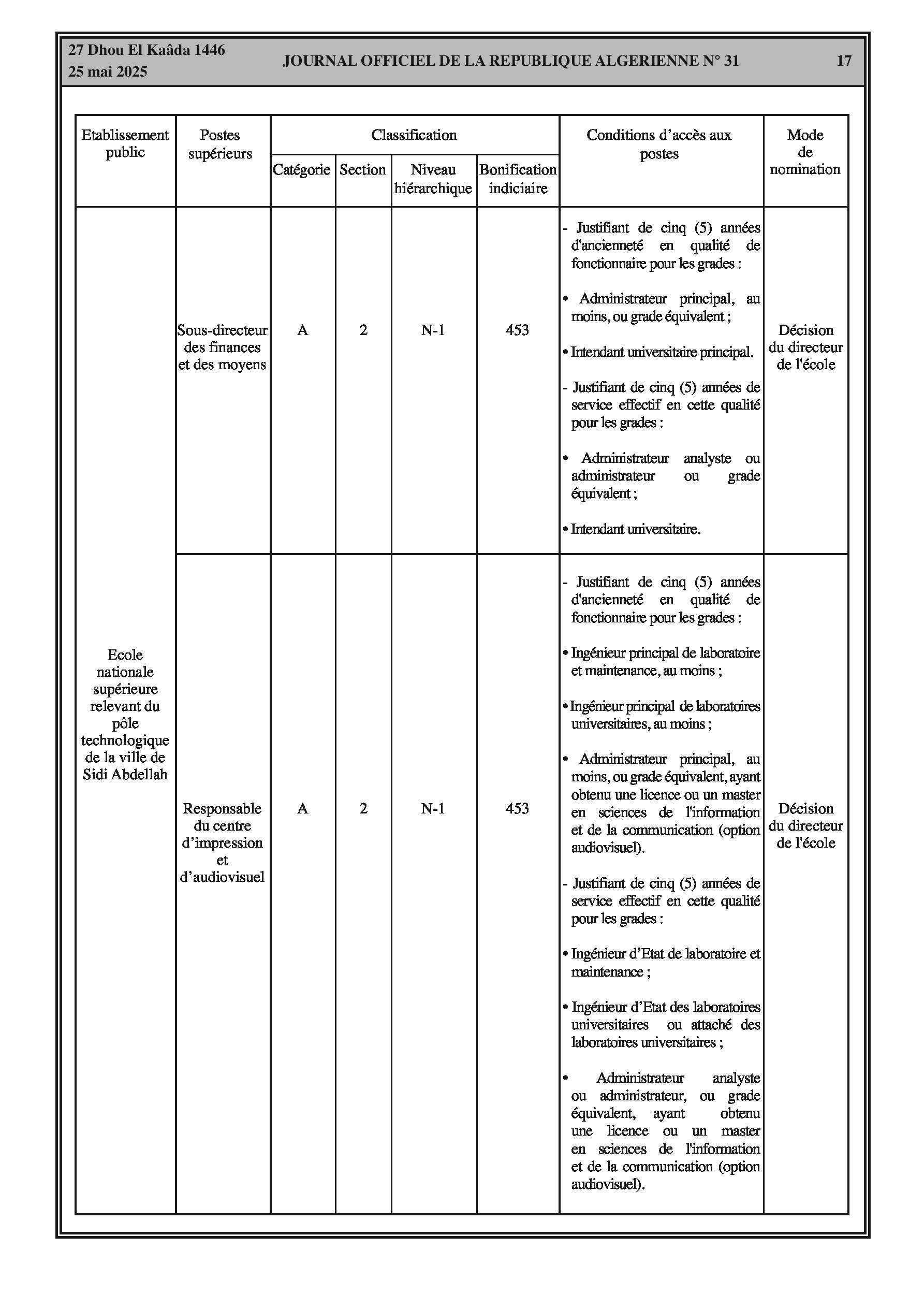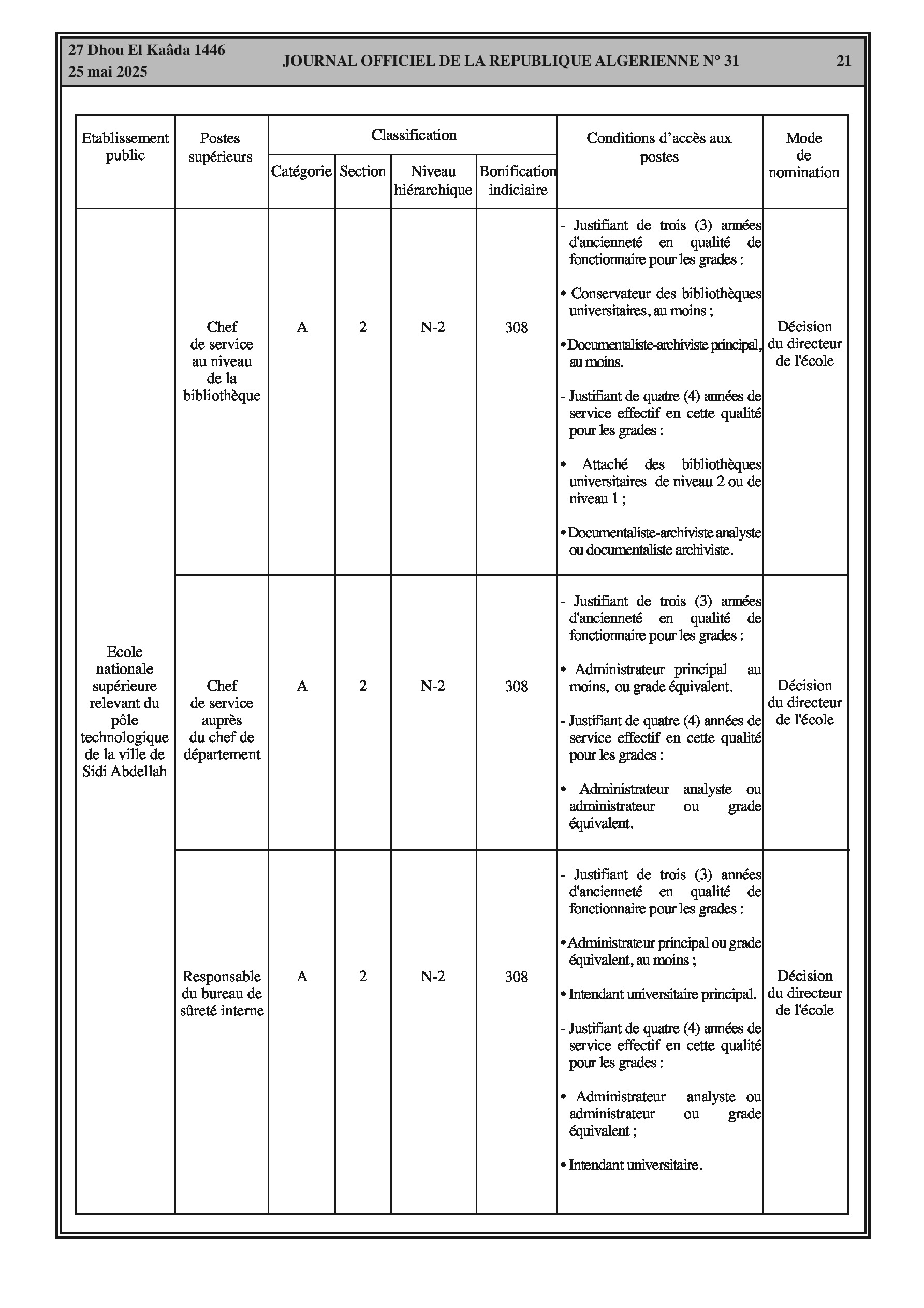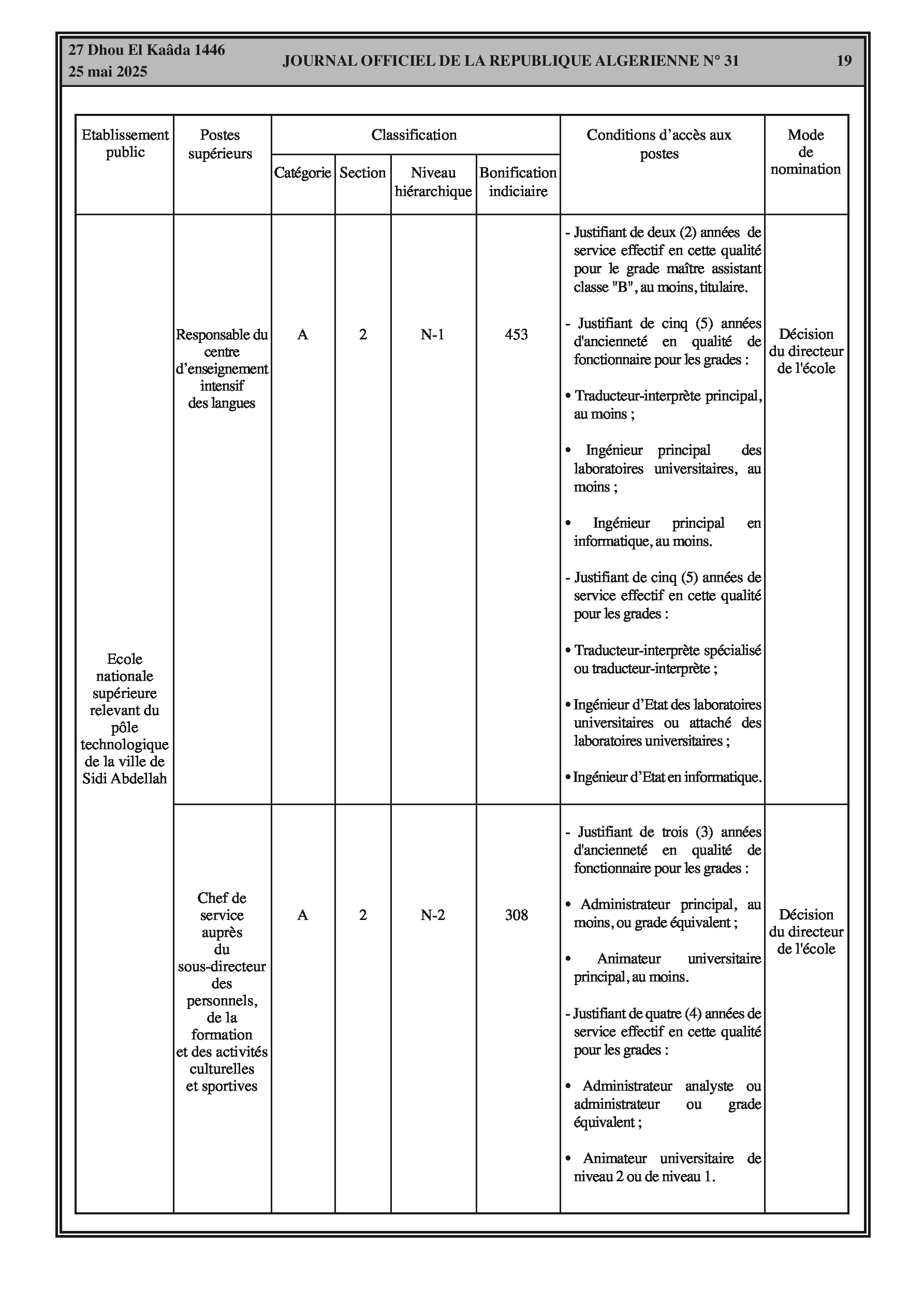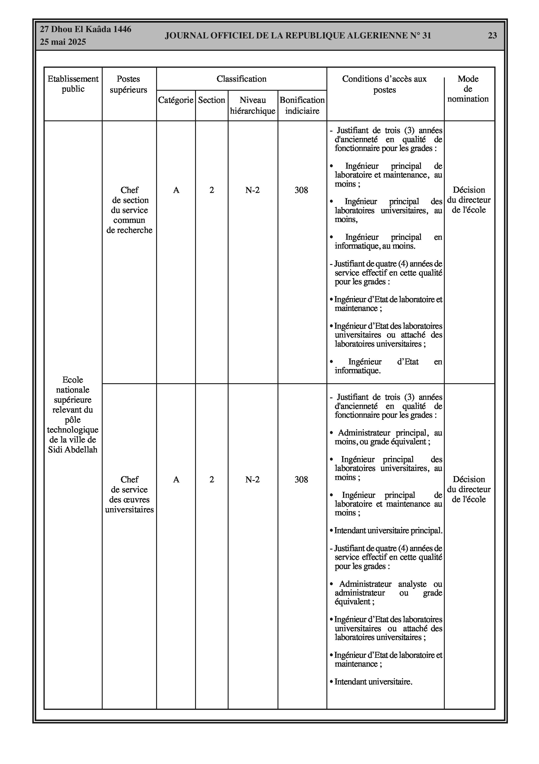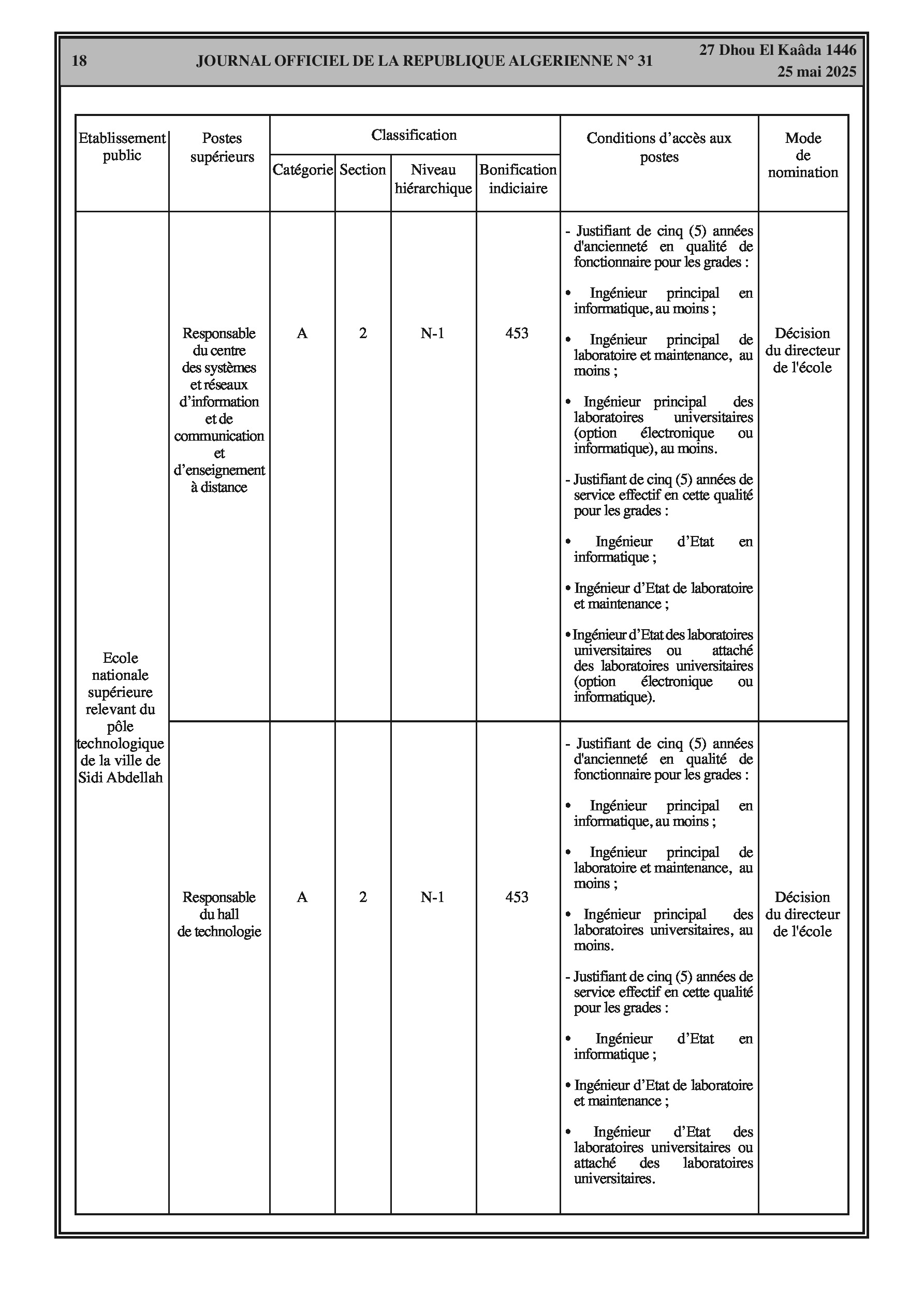 Arrêté interministériel du 7 Dhou El Kaâda 1446 correspondant au 5 mai 2025 fixant la classification de l'école nationale supérieure relevant du pôle technologique de la ville de Sidi Abdellah et les conditions d'accès aux postes supérieurs en relevant. Comprend des tableaux détaillés sur la classification, les conditions d'accès et la bonification indiciaire des postes supérieurs.