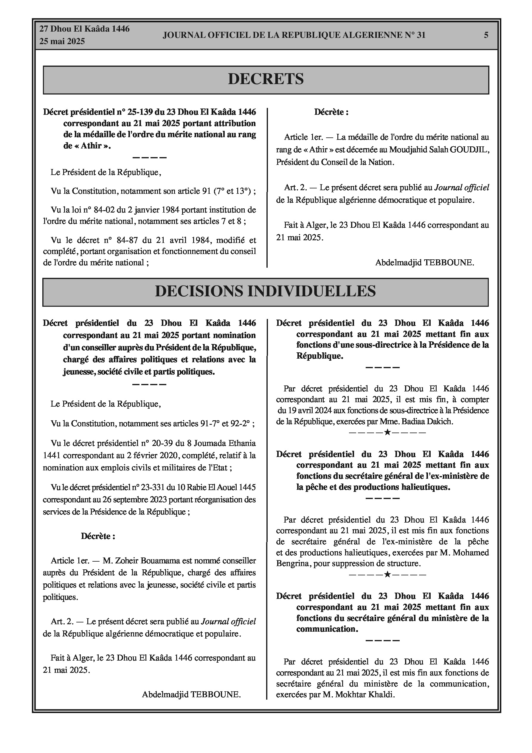 Décret présidentiel n° 25-139 du 23 Dhou El Kaâda 1446 correspondant au 21 mai 2025 portant attribution de la médaille de l'ordre du mérite national au rang de « Athir ».