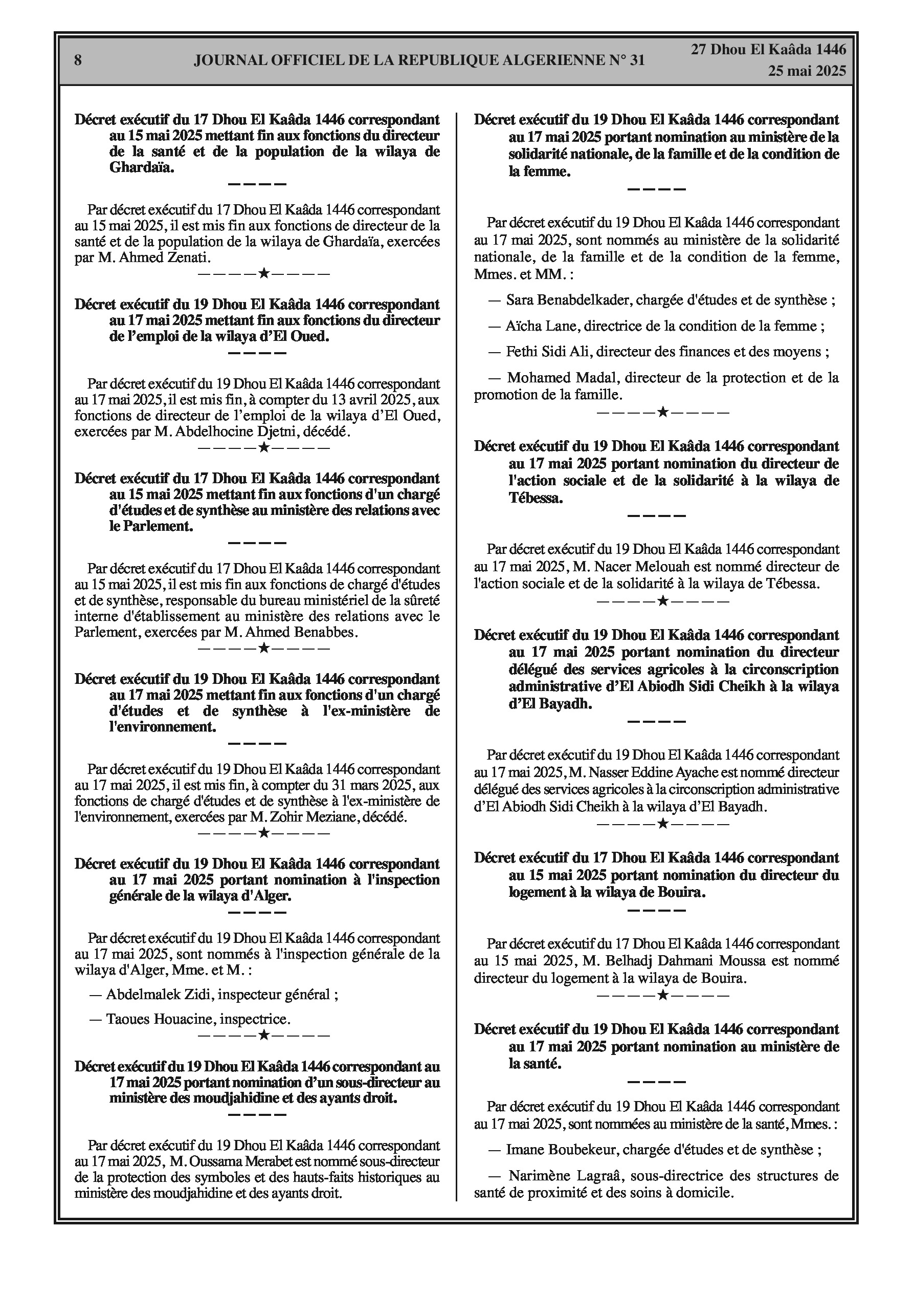 Décrets présidentiels : nomination d'un conseiller auprès du Président de la République, fins de fonctions et nominations de secrétaires généraux et sous-directeurs dans divers organismes ministériels et présidentiels. Décrets exécutifs : fins de fonctions et nominations de directeurs, inspecteurs et cadres dans divers secteurs ministériels et wilayas.